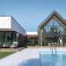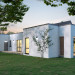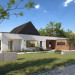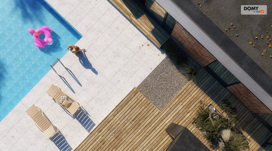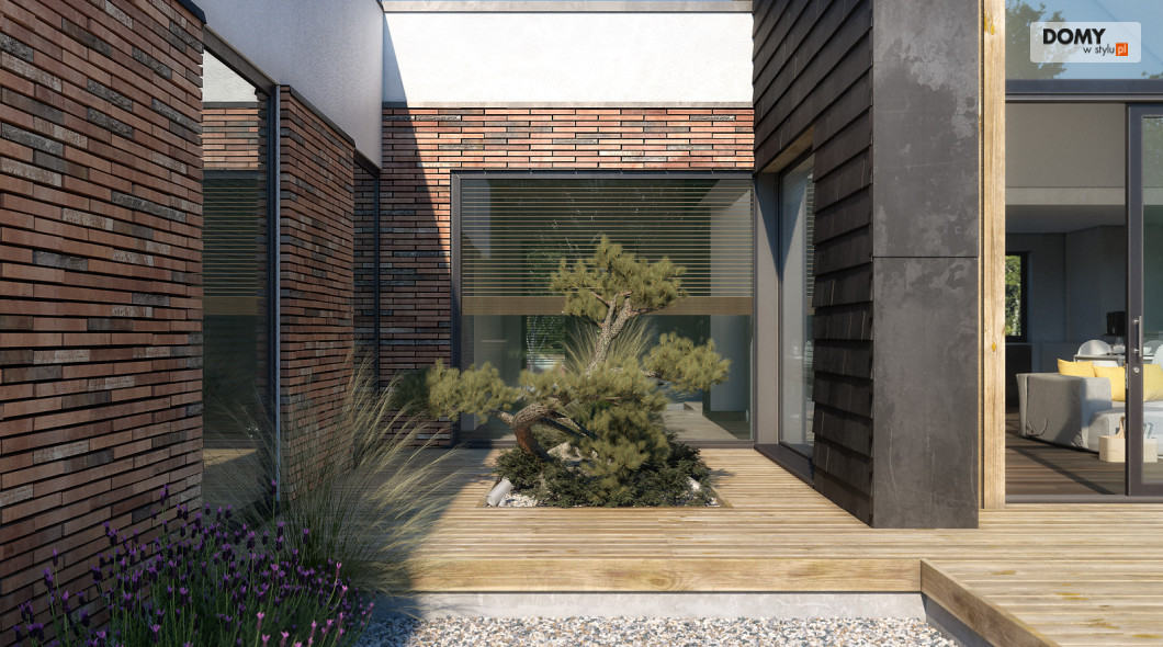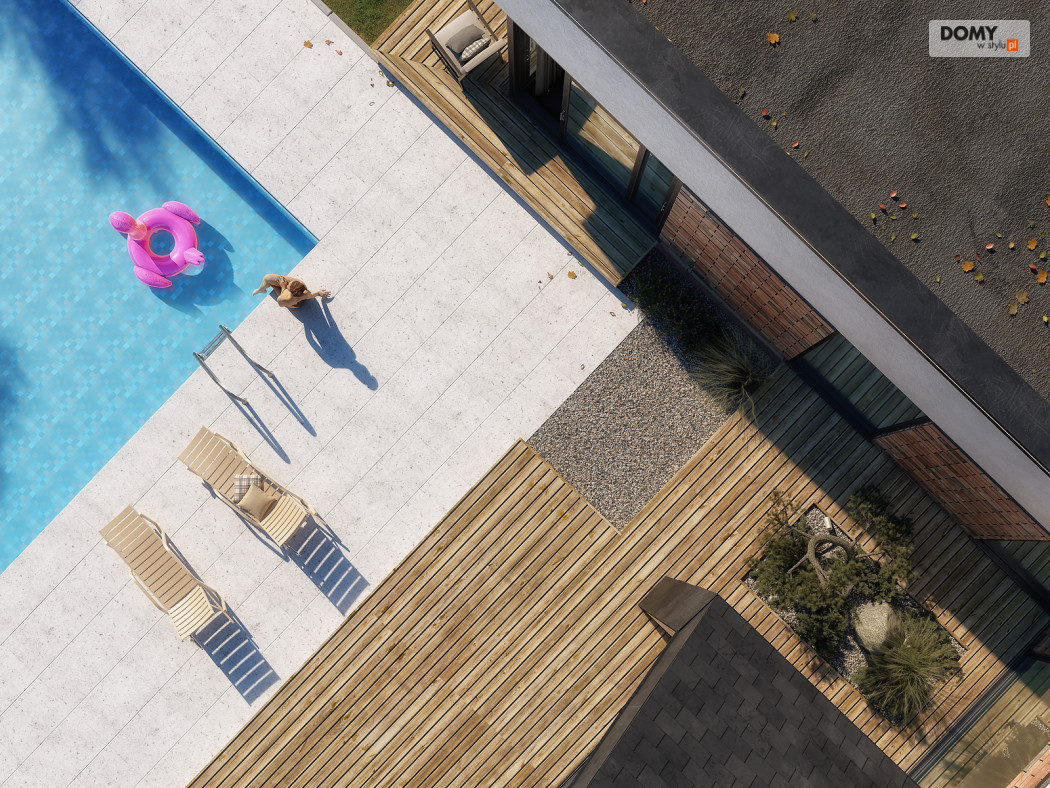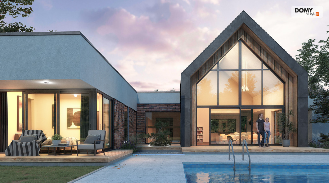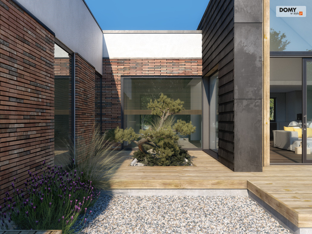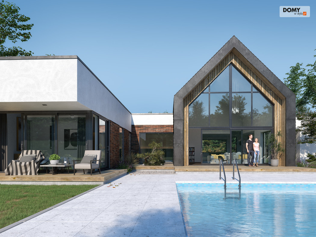 Projekt Temida to nowoczesny projekt domu parterowego, który wyróżnia się nowoczesną stylistyką wykończenia oraz praktycznym układem funkcjonalnym. Rozłożysta bryła budynku wyróżnia się geometrycznymi kształtami, które podkreślają nowoczesny charakter domu. W większości dom został przykryty płaskim dachem, na tle którego wybija się salon przykryty dwuspadowym, bezokapowym dachem. Centralne miejsce w domu zajmuje część dzienna, na którą składa się reprezentacyjny salon, jadalnia oraz otwarta kuchnia. Elementem charakterystycznym są liczne, wysokie przeszklenia oraz wysoki sufit w części dziennej. W dużej kuchni znajduje się centralnie położona wyspa, barek śniadaniowy oraz długi blat roboczy. Zarówno z kuchni jak i z jadalni można wyjść na zadaszony taras. Przy kuchni znajduje się również sporej wielkości spiżarnia. W części nocnej domu zaprojektowano trzy sypialnie oraz ogólnodostępną łazienkę. Główna sypialnia tworzy apartament gospodarzy z własną łazienką, garderobą oraz wyjściem na prywatny, zadaszony taras. Uzupełnieniem układu funkcjonalnego jest szatnia przy wejściu głównym, prowadząca do kotłowni, dwustanowiskowego garażu oraz pomieszczenia technicznego z dodatkowym wyjściem zewnętrznym.