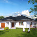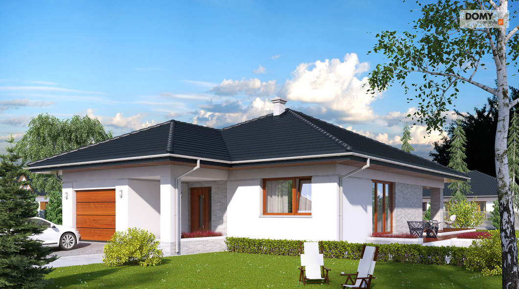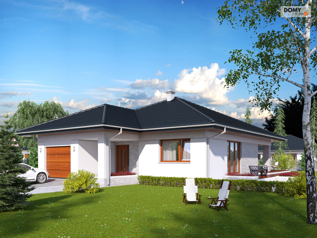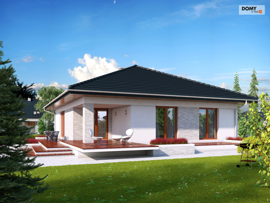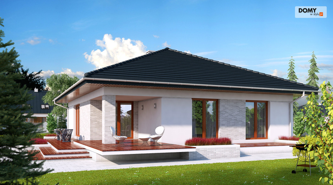 Jednorodzinny budynek mieszkalny, parterowy, przeznaczony dla 3 - 4-osobowej rodziny. W części dziennej przewidziano salon połączony z jadalnią, z którego prowadzi wyjście na zadaszony taras, oraz kuchnię ze spiżarnią. W części nocnej zaprojektowano dwie sypialnie i łazienkę. Część gospodarczą stanowi kotłownia na każdy rodzaj paliwa oraz jednostanowiskowy garaż.