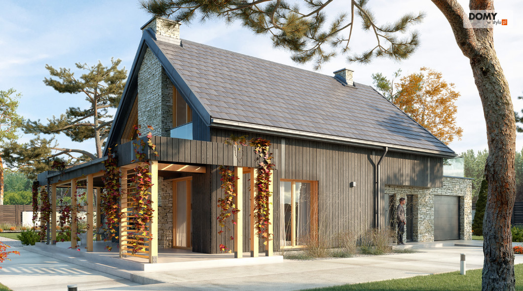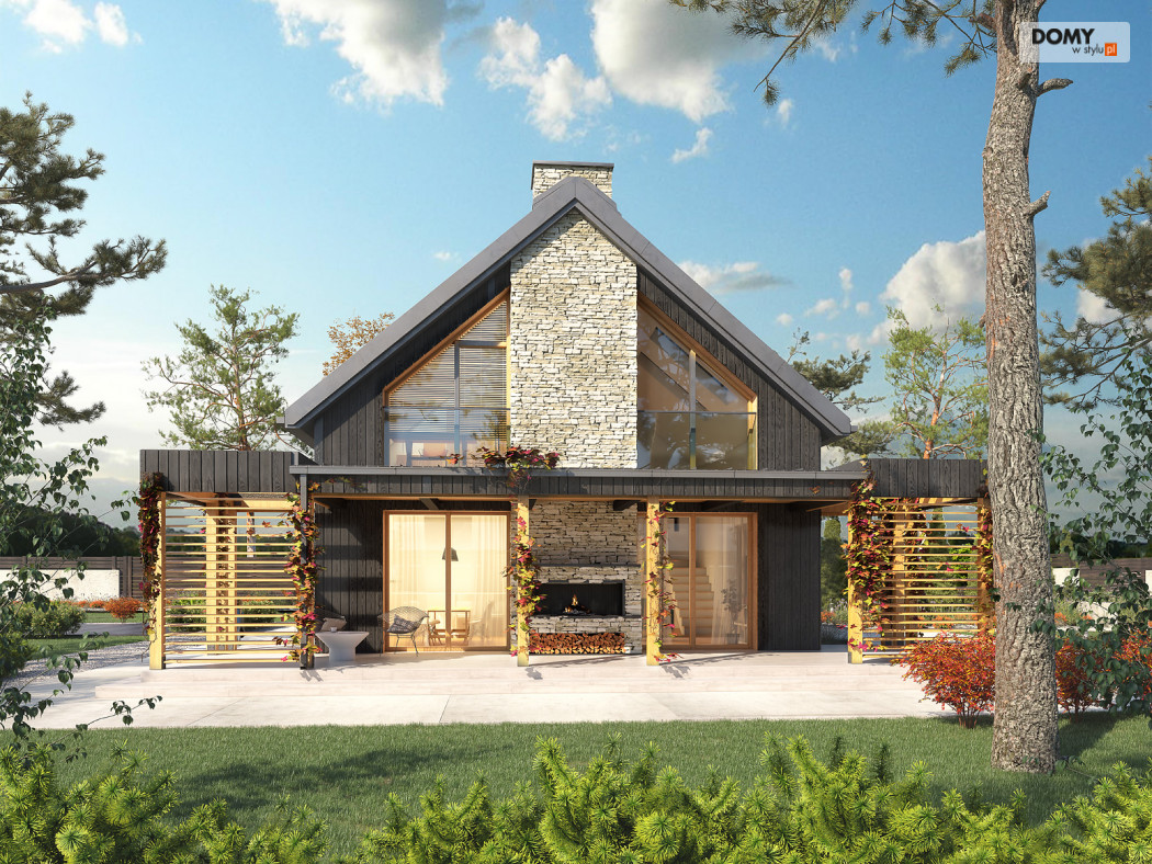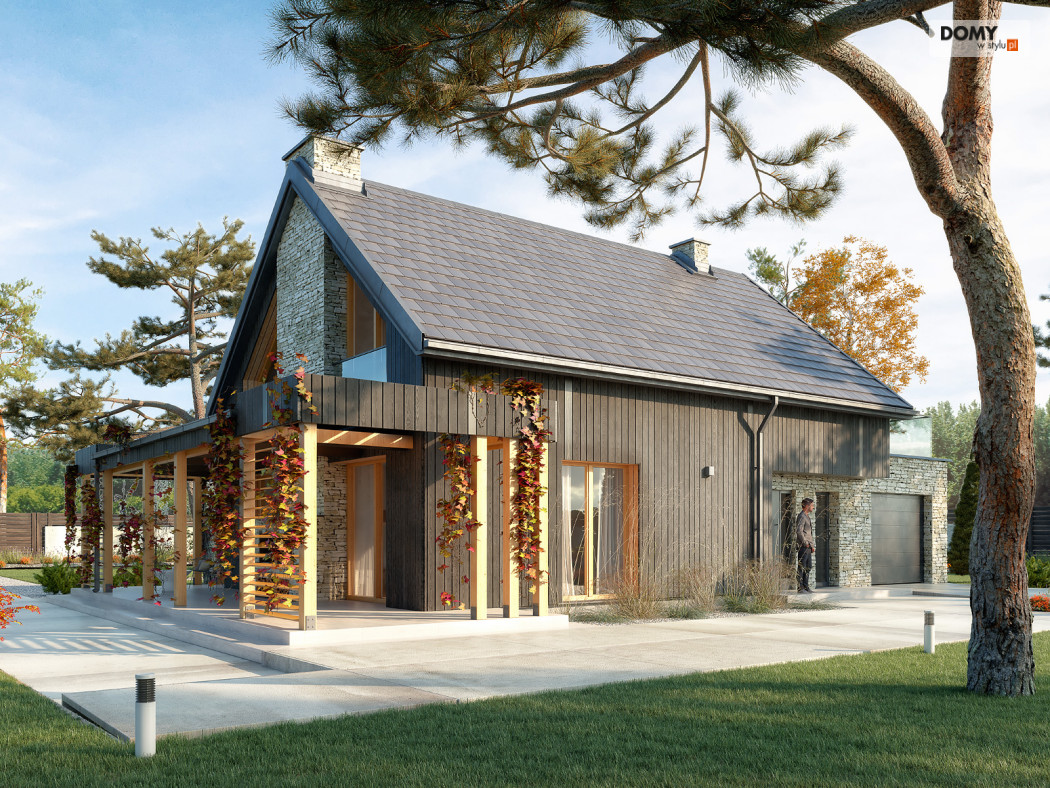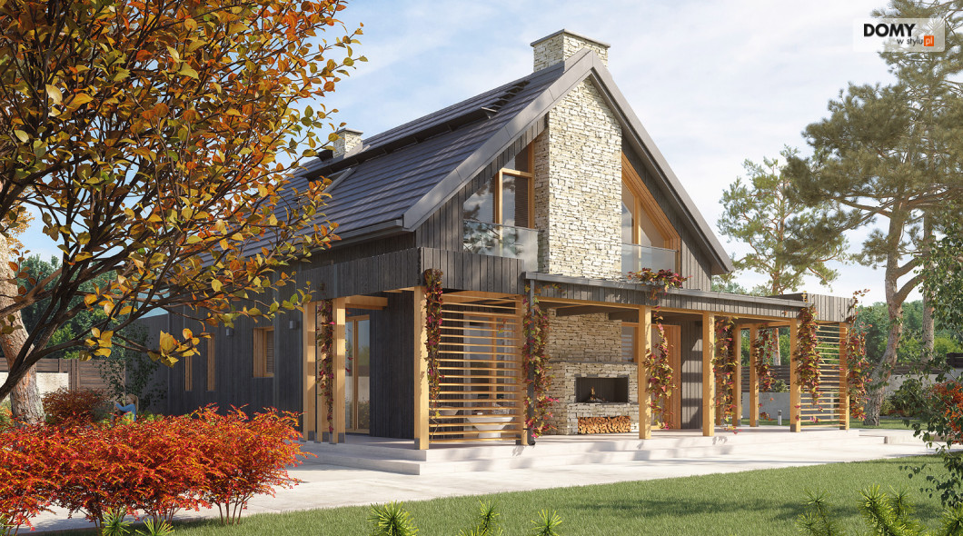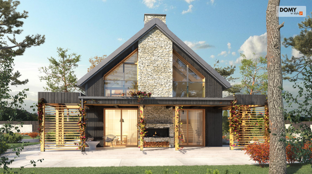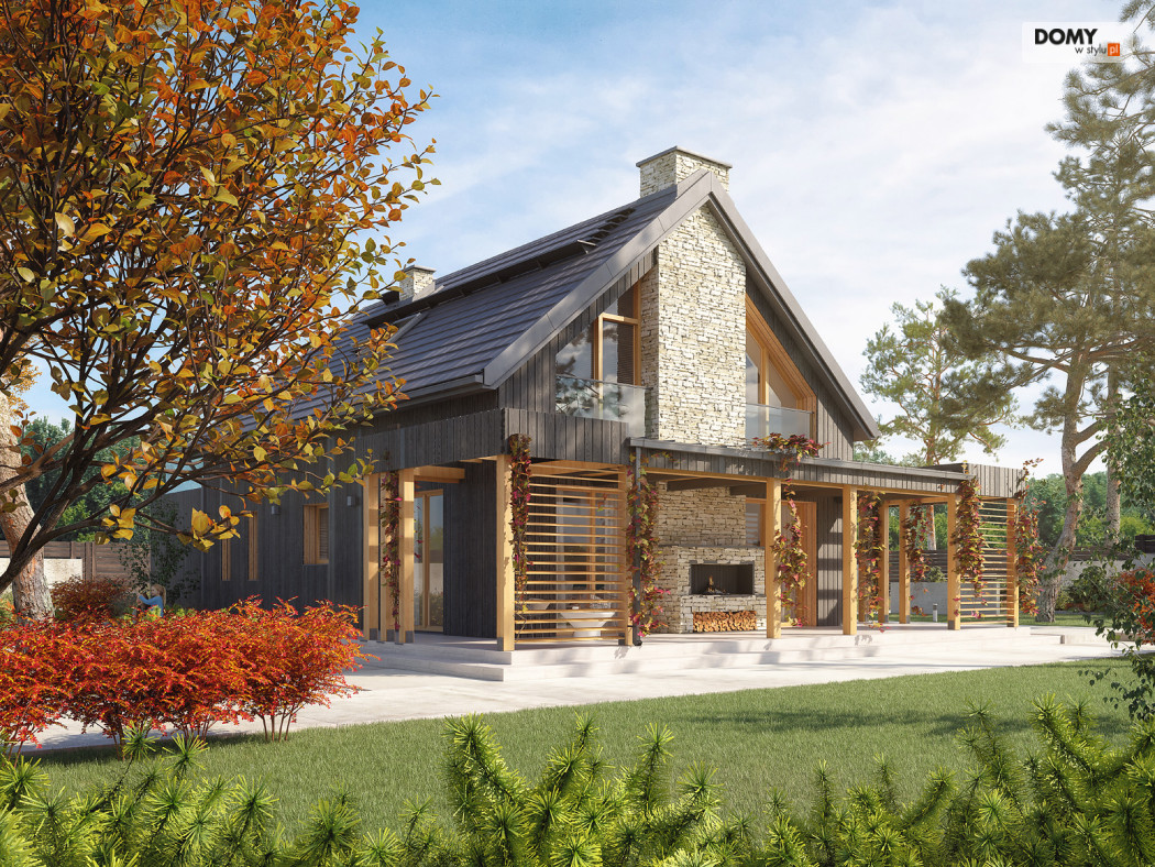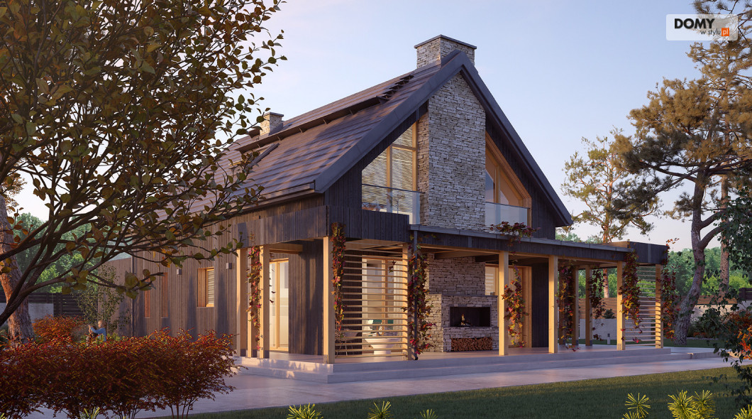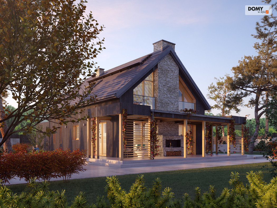 Projekt domu Weranda 6 to nowoczesny projekt domu z użytkowym poddaszem. Prosta bryła została zaprojektowana na planie prostokąta oraz przykryta dwuspadowym dachem. Są to elementy charakterystyczne dla stylu nowoczesnej stodoły. Projekt wyróżnia się także elewacją w nowoczesnym stylu, która w większości została wykończona ciemnym drewnem skontrastowanym jasną stolarką oraz kamieniem elewacyjnym w okolicy wejścia głównego. Układ funkcjonalny został podzielony na część dzienną na parterze oraz nocną na poddaszu. Wielofunkcyjna część dzienna składa się z salonu z kominkiem, jadalni oraz otwartej kuchni z barkiem śniadaniowym. Nad częścią salonu znajduje się antresola. Z salonu znajduje się wyjście na duży taras z zewnętrznym kominkiem, zadaszonym drewnianą pergolą. Na poddaszu zaprojektowano część nocna domu, na którą składają się trzy sypialnie oraz ogólnodostępna łazienka. Dwie z sypialni posiadają dostęp na taras zaprojektowany nad garażem. W projekcie znajduje się również część gospodarcza z jednostanowiskowy garażem oraz kotłownią gazową.
