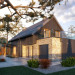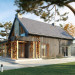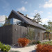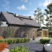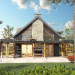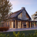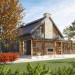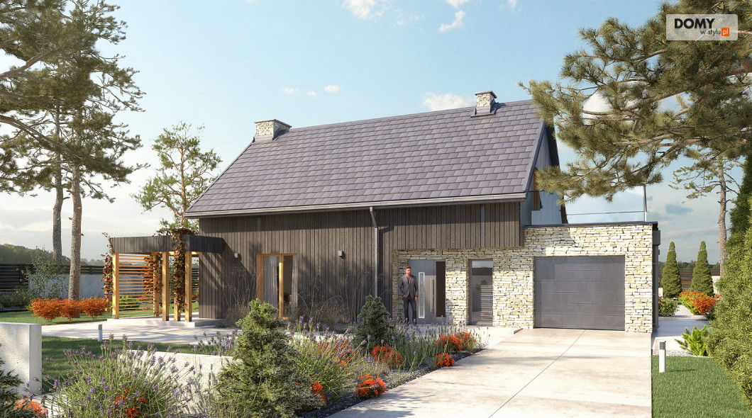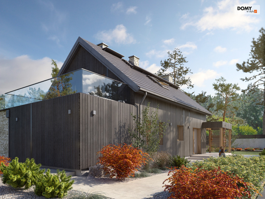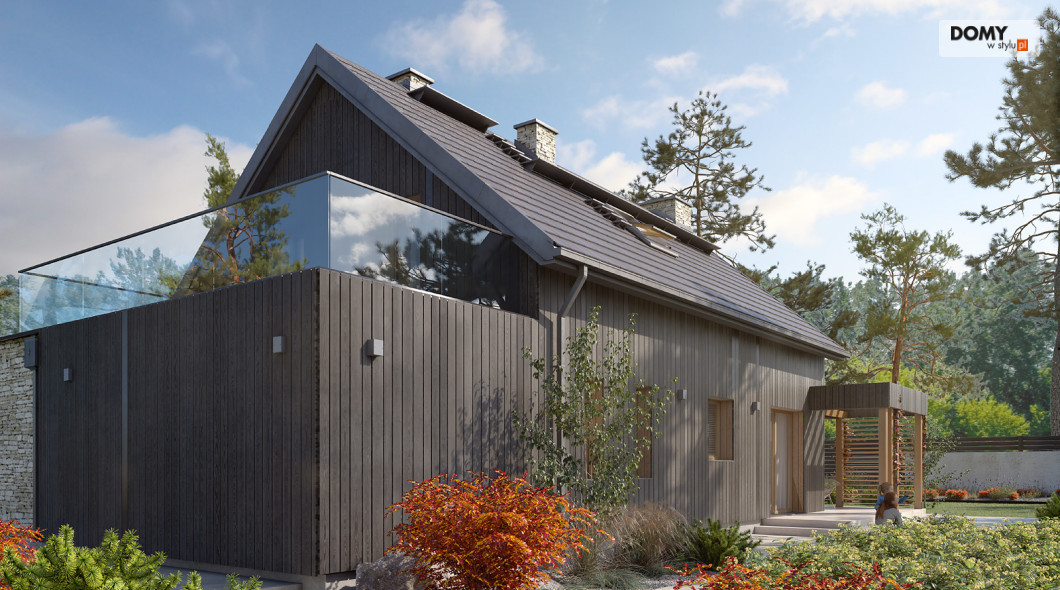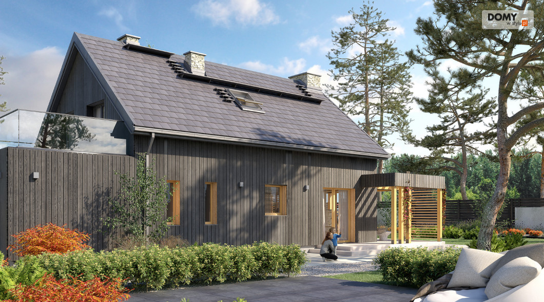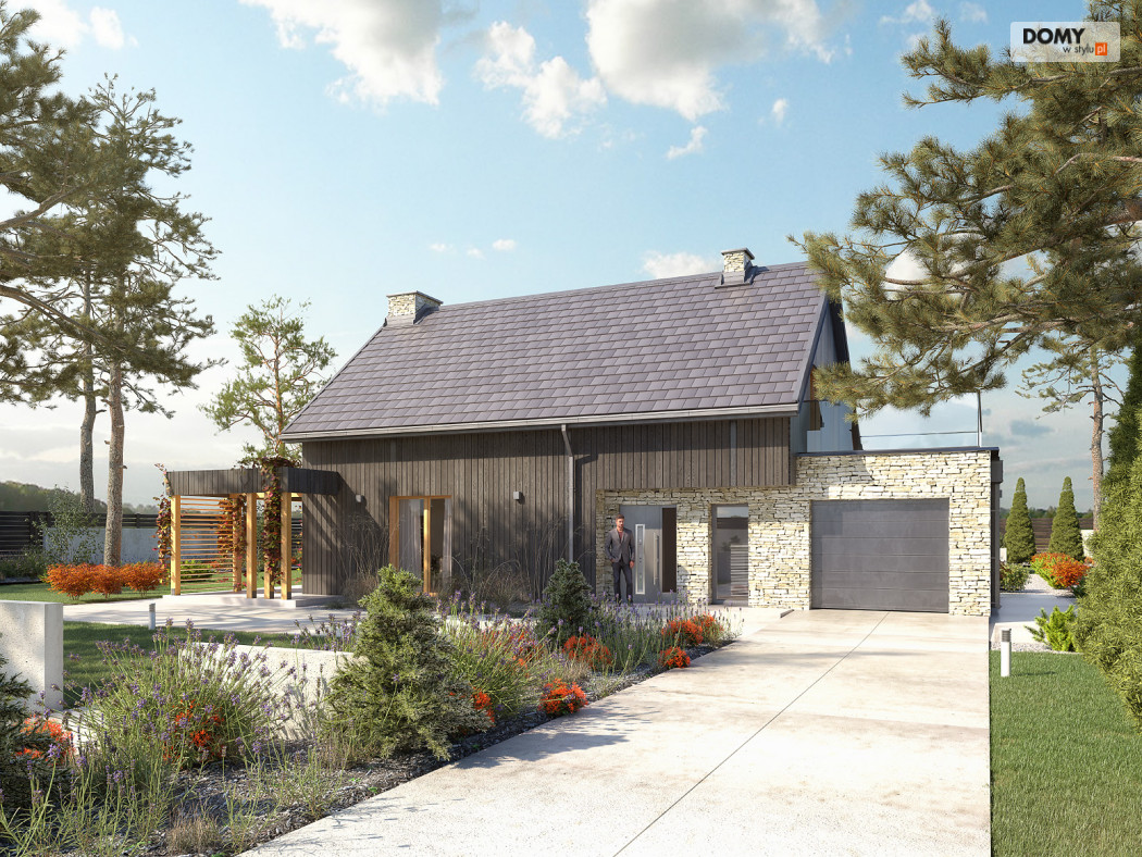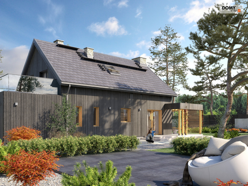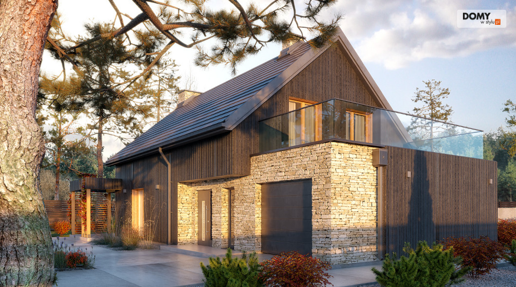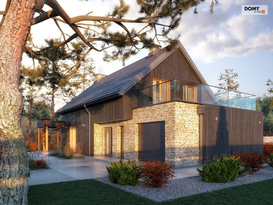 Projekt domu Weranda 6 to nowoczesny projekt domu z użytkowym poddaszem. Prosta bryła została zaprojektowana na planie prostokąta oraz przykryta dwuspadowym dachem. Są to elementy charakterystyczne dla stylu nowoczesnej stodoły. Projekt wyróżnia się także elewacją w nowoczesnym stylu, która w większości została wykończona ciemnym drewnem skontrastowanym jasną stolarką oraz kamieniem elewacyjnym w okolicy wejścia głównego. Układ funkcjonalny został podzielony na część dzienną na parterze oraz nocną na poddaszu. Wielofunkcyjna część dzienna składa się z salonu z kominkiem, jadalni oraz otwartej kuchni z barkiem śniadaniowym. Nad częścią salonu znajduje się antresola. Z salonu znajduje się wyjście na duży taras z zewnętrznym kominkiem, zadaszonym drewnianą pergolą. Na poddaszu zaprojektowano część nocna domu, na którą składają się trzy sypialnie oraz ogólnodostępna łazienka. Dwie z sypialni posiadają dostęp na taras zaprojektowany nad garażem. W projekcie znajduje się również część gospodarcza z jednostanowiskowy garażem oraz kotłownią gazową.