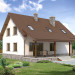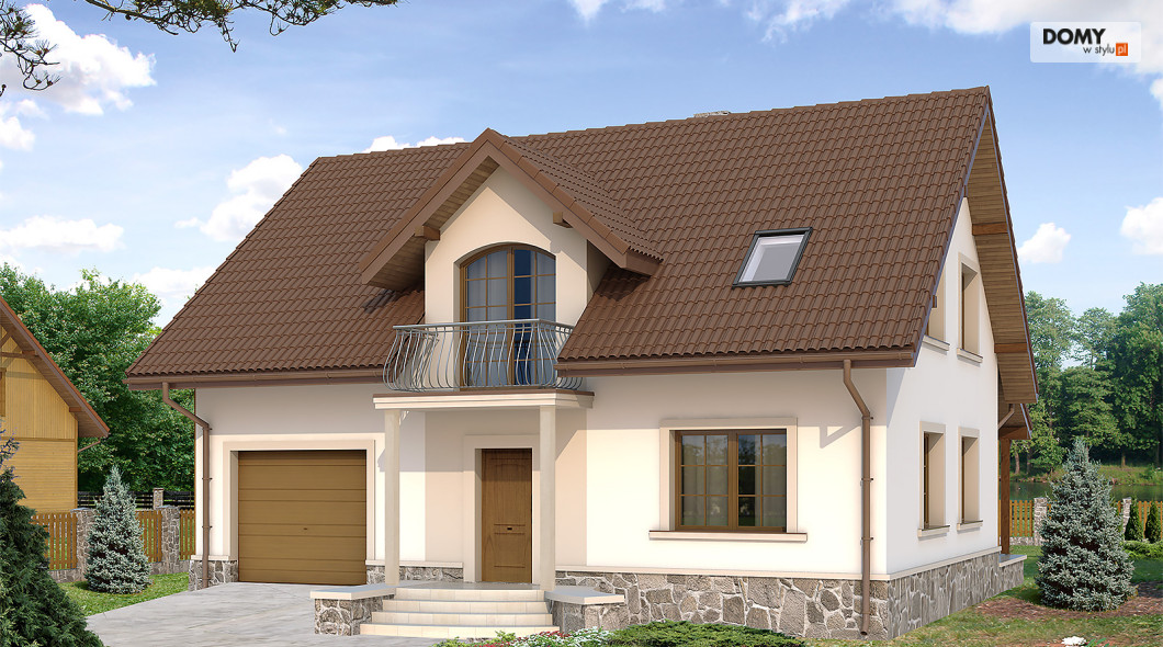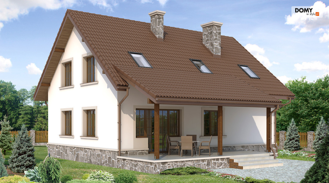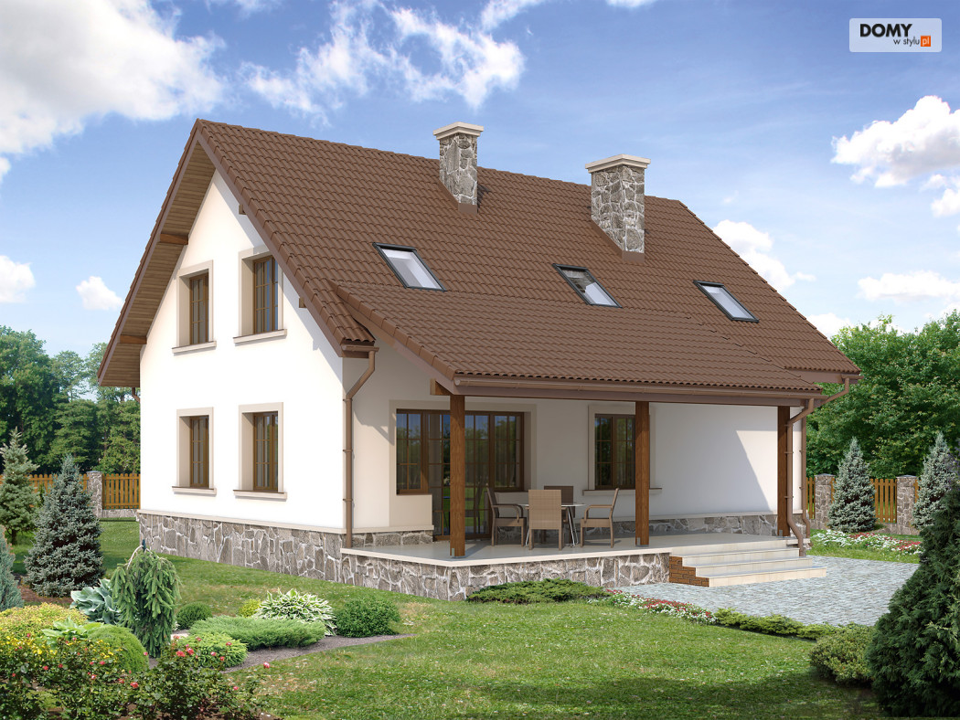 Jednorodzinny dom parterowy z użytkowym poddaszem, niepodpiwniczony, przeznaczony dla 4-osobowej rodziny. Atutem projektu jest duży zadaszony taras. Rozwiązanie pomieszczeń parteru (salonu i jadalni) umożliwia usytuowanie domu zarówno od północy, jak i południa. Na parterze zaprojektowano w części dziennej – salon z jadalnią, kuchnię, wc, w części gospodarczej – garaż i kotłownię.