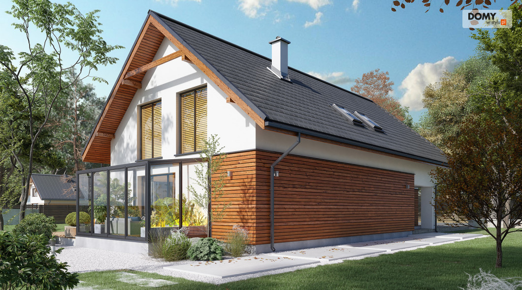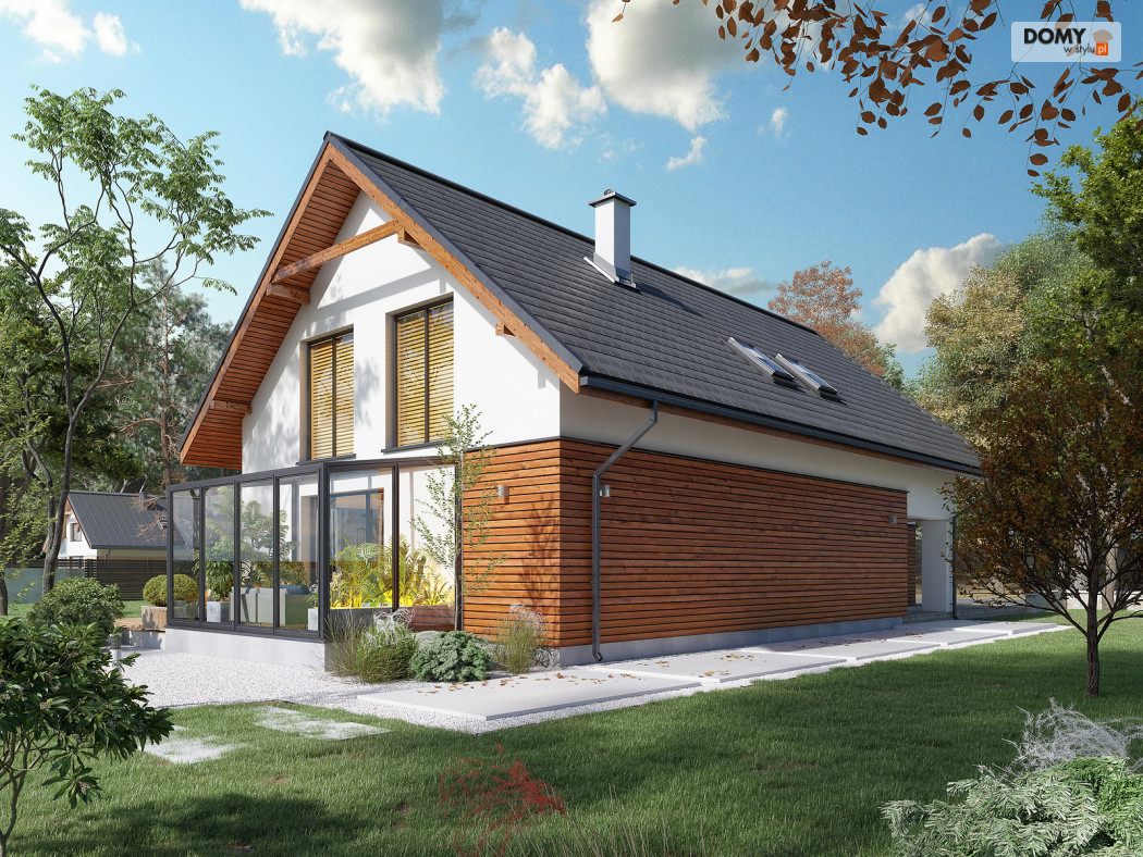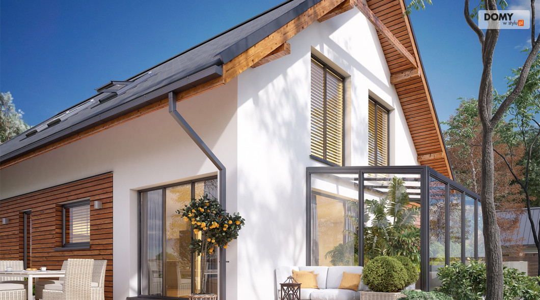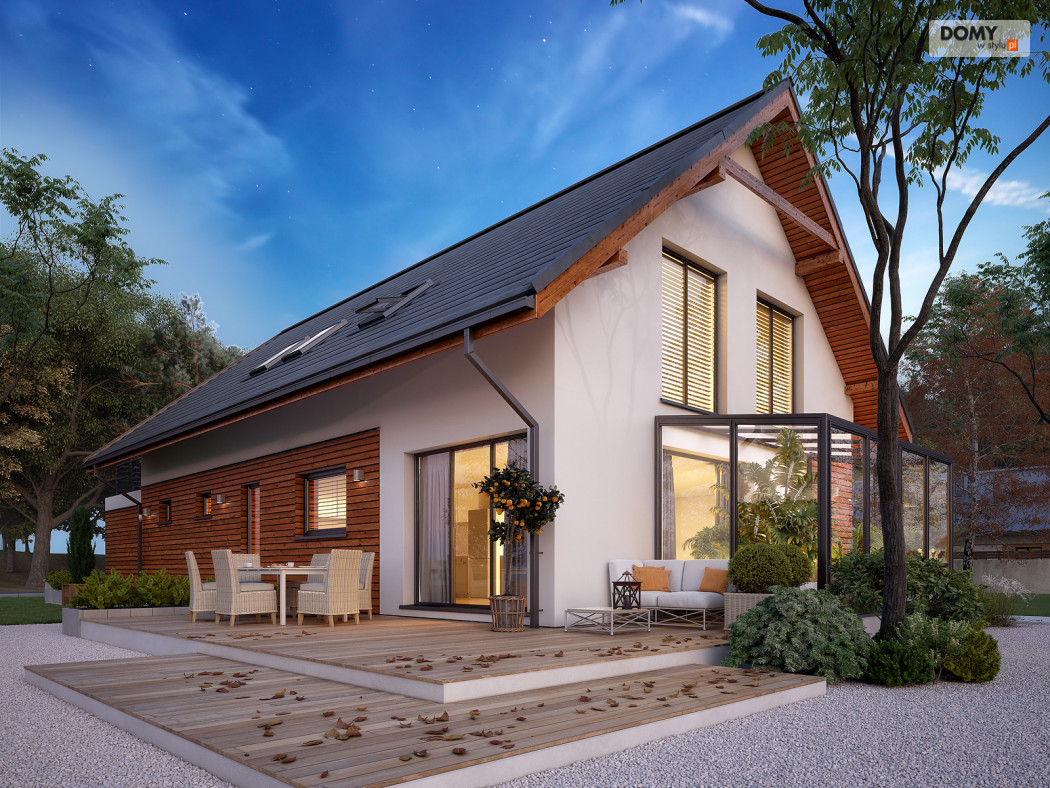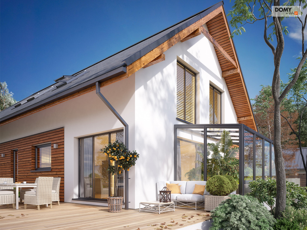 Amarylis 8 to projekt domu z użytkowym poddaszem, który idealnie sprawdzi się na wąskiej działce. Projekt wyróżnia się nowoczesną stylistyką wykończenia elewacji, na której biały tynk współgra z naturalną drewnianą okładziną oraz szklaną oranżerią z dostępem z salonu. Parter budynku stanowi strefę dzienną, w której znajduje się salon, jadalnia oraz otwarta kuchnia. Układ funkcjonalny parteru uzupełnia dodatkowy pokój, łazienka oraz schowek pod schodami. Na poddaszu zaprojektowano zaciszną strefę nocną. Znajdują się w niej cztery ustawne sypialnie, dwie łazienki oraz garderoba. Dwa pokoje posiadają bezpośredni dostęp do rozległego tarasu nad garażem. W budynku znajduje się również dwustanowiskowy garaż z dostępem przez kotłownię. W projekcie przewidziano ekologiczne rozwiązania w postaci pompy ciepła oraz systemu rekuperacji z odzyskiem ciepła.