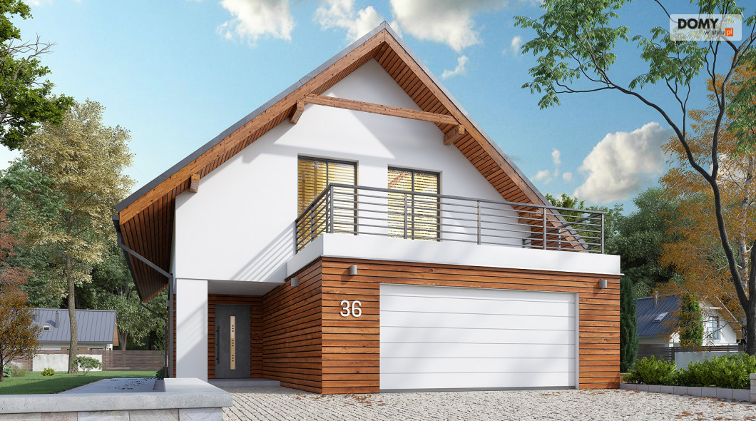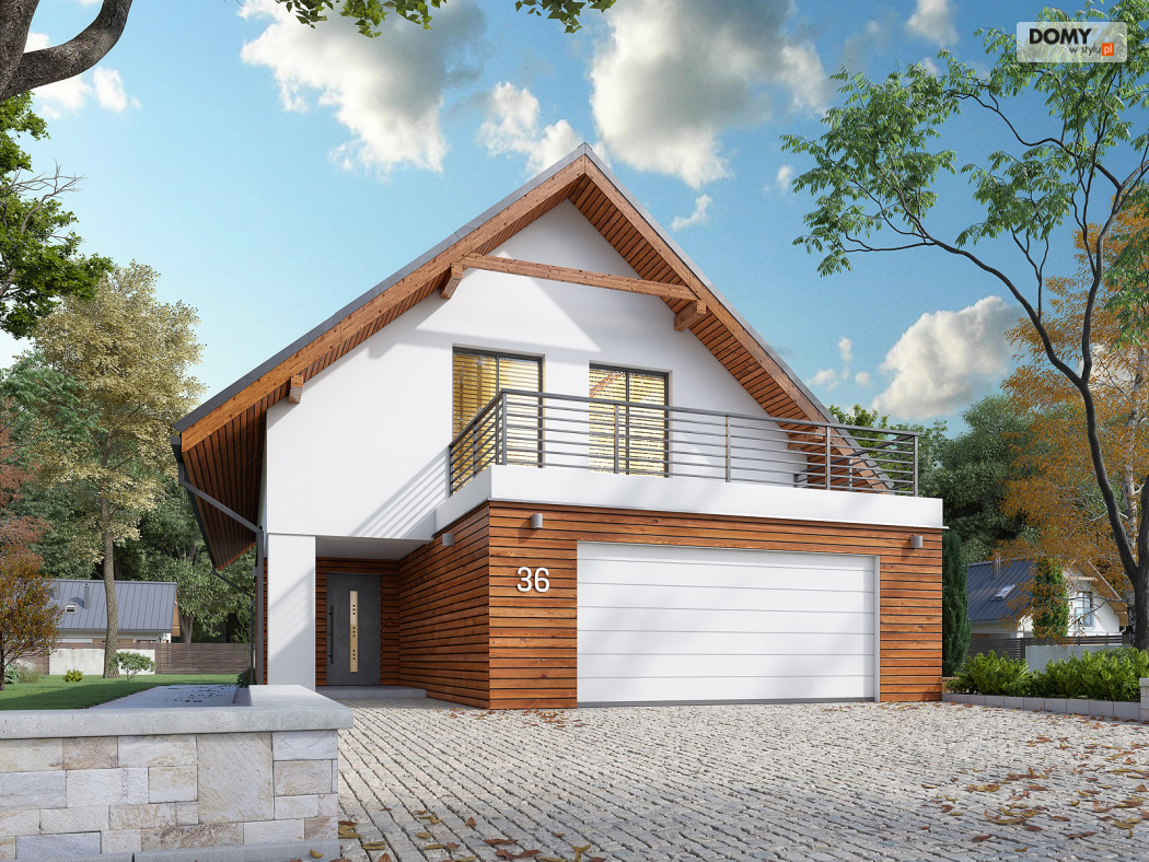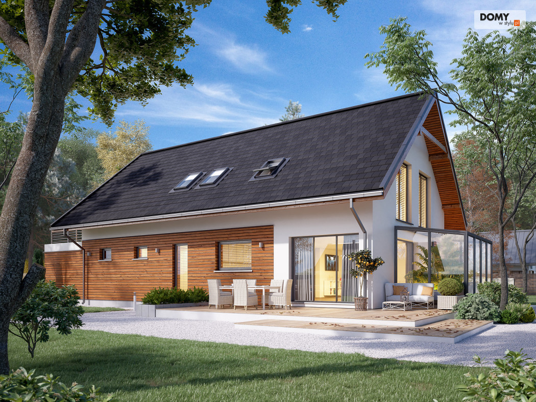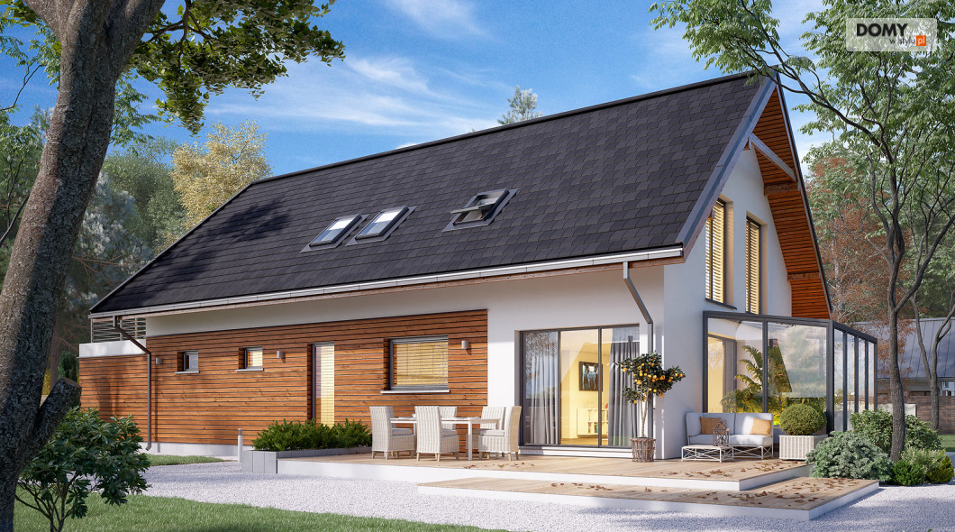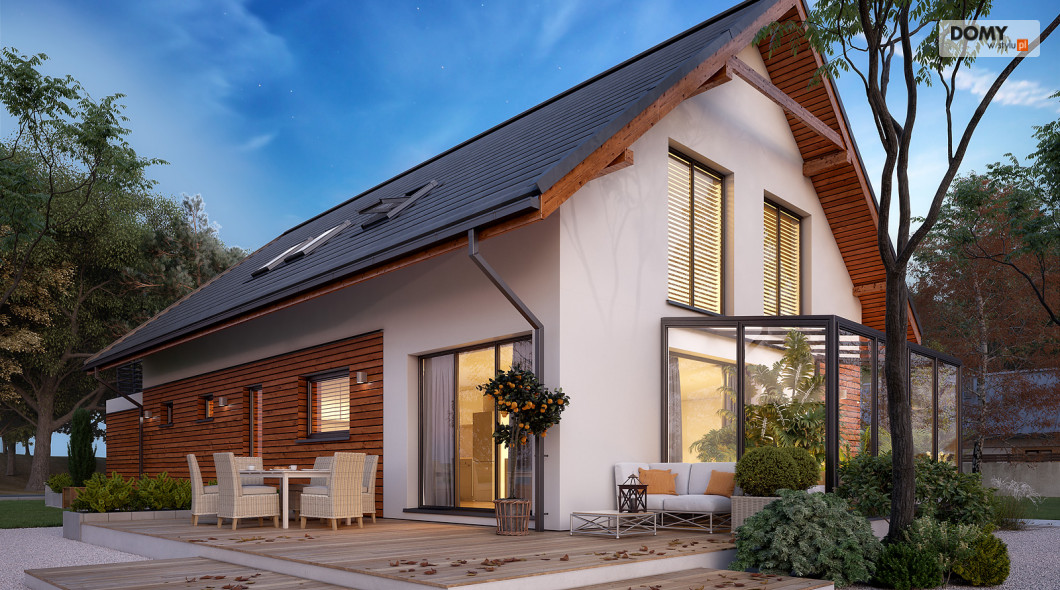Amarylis 8 to projekt domu z użytkowym poddaszem, który idealnie sprawdzi się na wąskiej działce. Projekt wyróżnia się nowoczesną stylistyką wykończenia elewacji, na której biały tynk współgra z naturalną drewnianą okładziną oraz szklaną oranżerią z dostępem z salonu. Parter budynku stanowi strefę dzienną, w której znajduje się salon, jadalnia oraz otwarta kuchnia. Układ funkcjonalny parteru uzupełnia dodatkowy pokój, łazienka oraz schowek pod schodami. Na poddaszu zaprojektowano zaciszną strefę nocną. Znajdują się w niej cztery ustawne sypialnie, dwie łazienki oraz garderoba. Dwa pokoje posiadają bezpośredni dostęp do rozległego tarasu nad garażem. W budynku znajduje się również dwustanowiskowy garaż z dostępem przez kotłownię. W projekcie przewidziano ekologiczne rozwiązania w postaci pompy ciepła oraz systemu rekuperacji z odzyskiem ciepła.