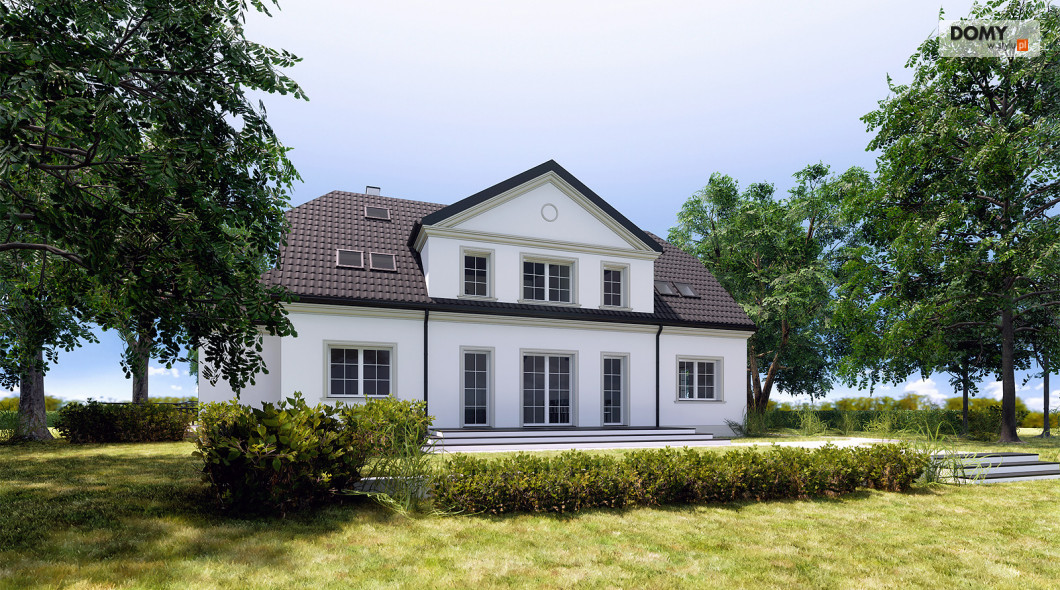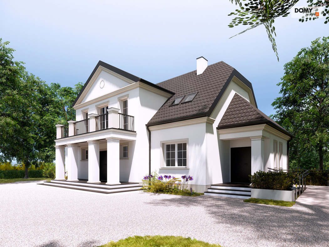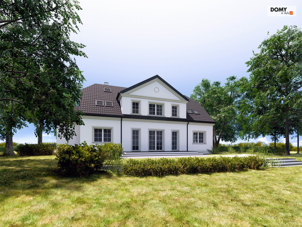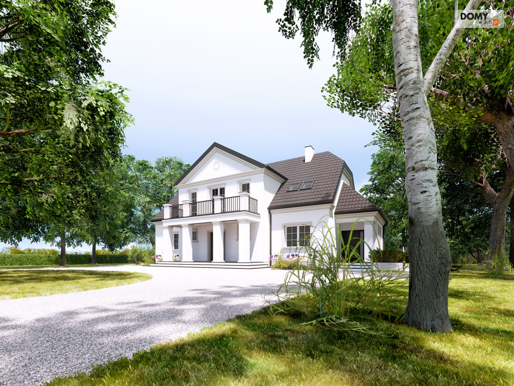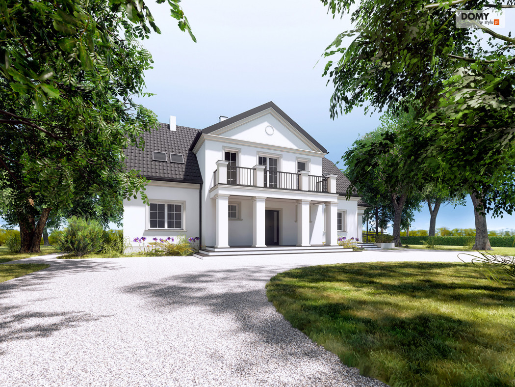 Reprezentacyjny dom o formie i detalu inspirowanym klasycystycznym dworem polskim. Oprócz części mieszkalnej w parterze budynku znajduje się wydzielona przestrzeń zaprojektowana z myślą o przydomowej pracowni z dwoma gabinetami. Poddasze zostało zaprojektowane jako strefa prywatna zawierająca trzy sypialnie, w tym jedna z garderobą, oraz pomieszczenia techniczne i pomocnicze. Dodatkowe pomieszczenie można zaadaptować np. na pralnię lub pokój hobby.