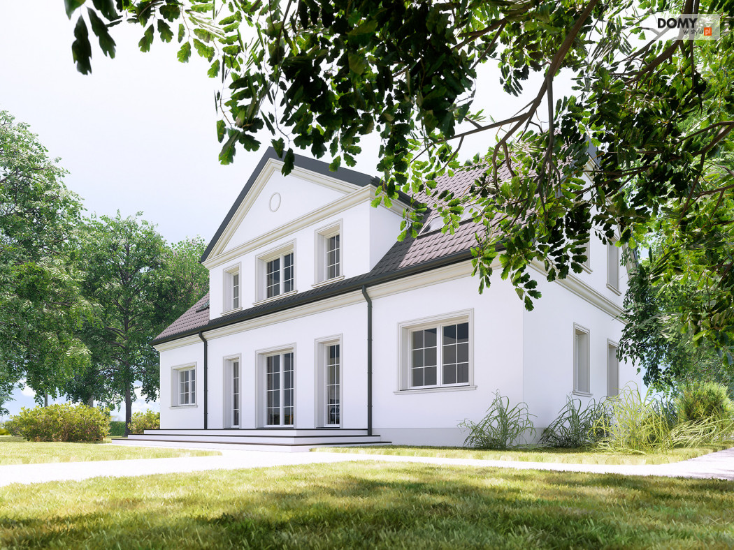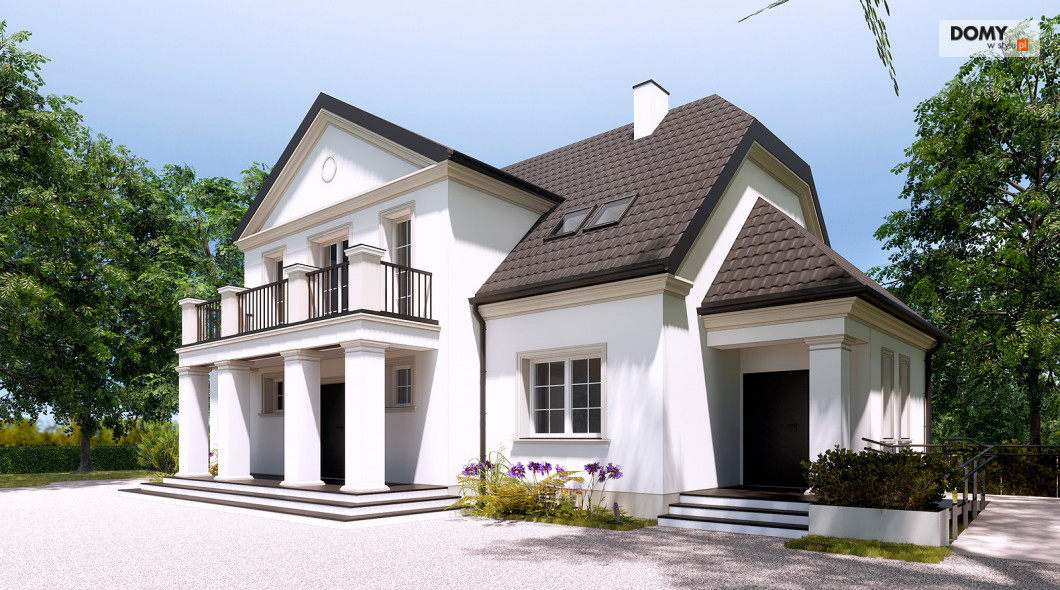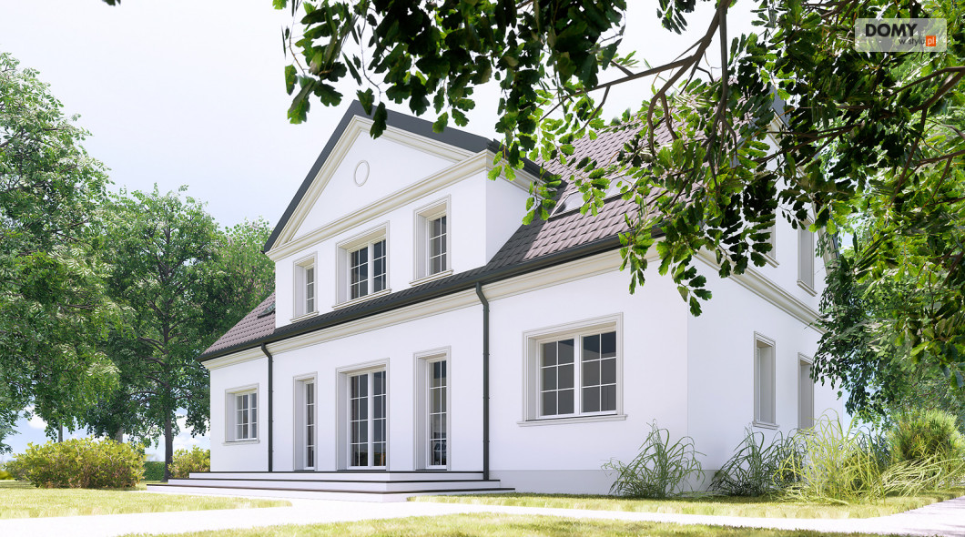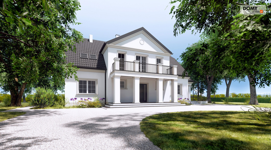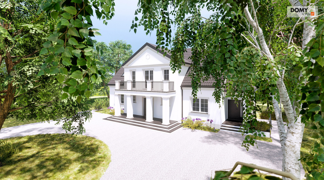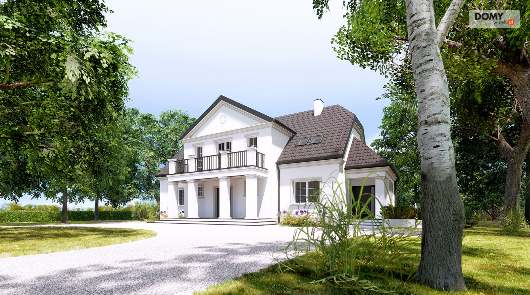 Reprezentacyjny dom o formie i detalu inspirowanym klasycystycznym dworem polskim. Oprócz części mieszkalnej w parterze budynku znajduje się wydzielona przestrzeń zaprojektowana z myślą o przydomowej pracowni z dwoma gabinetami. Poddasze zostało zaprojektowane jako strefa prywatna zawierająca trzy sypialnie, w tym jedna z garderobą, oraz pomieszczenia techniczne i pomocnicze. Dodatkowe pomieszczenie można zaadaptować np. na pralnię lub pokój hobby.