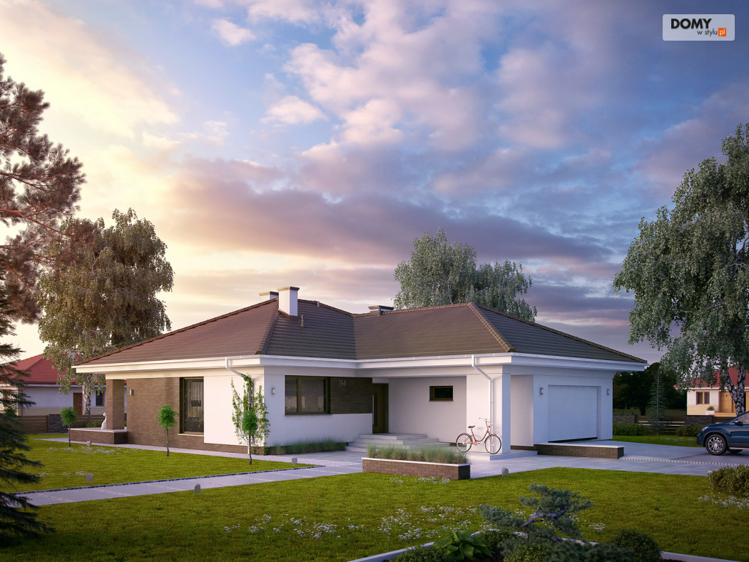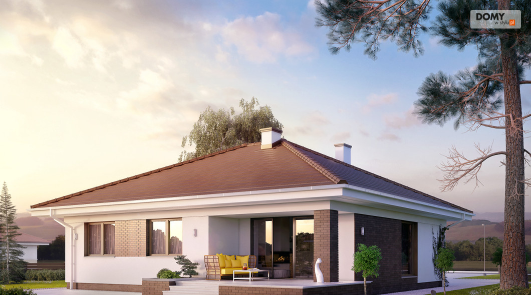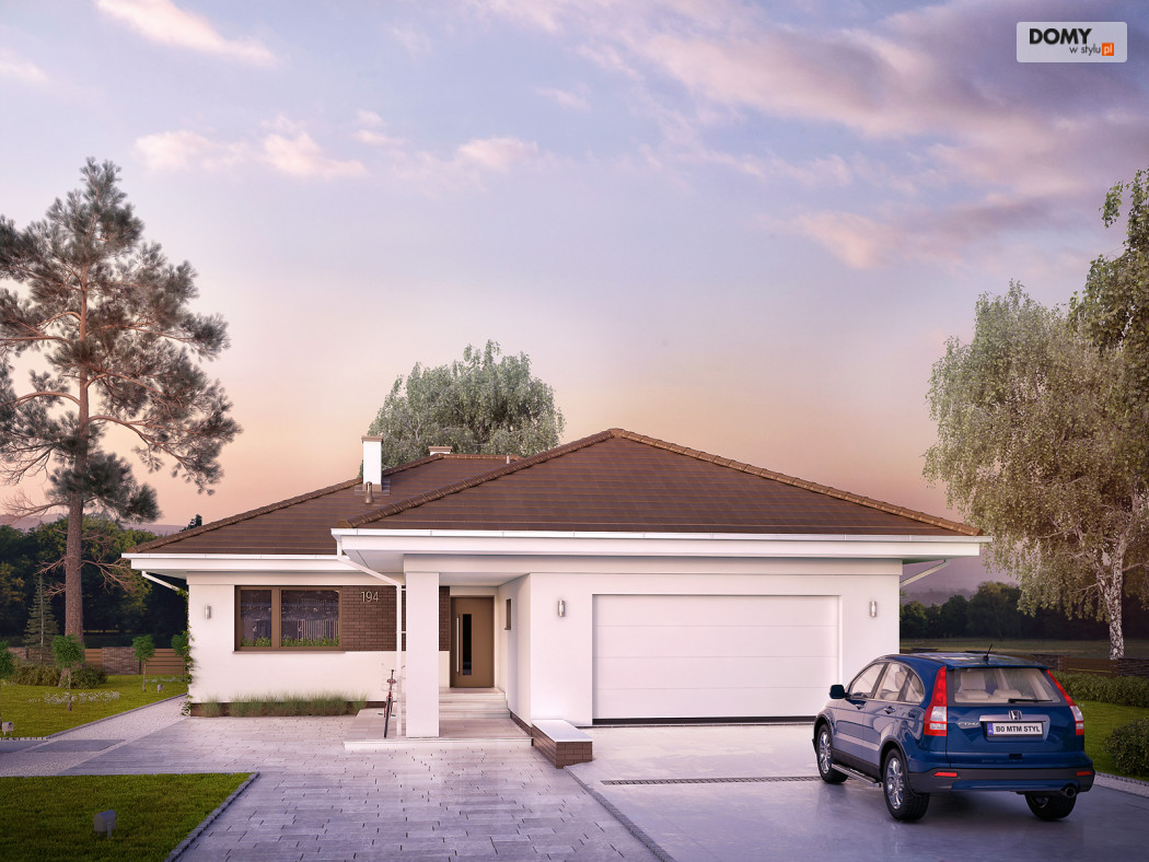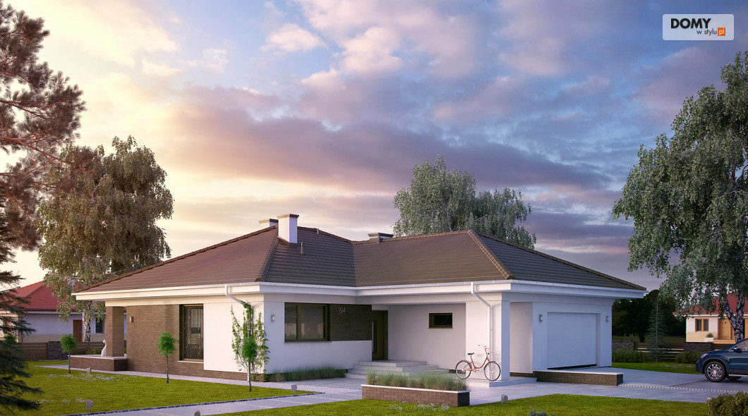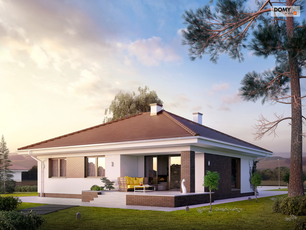 Budynek mieszkalny jednorodzinny, parterowy, niepodpiwniczony. Optymalny układ pomieszczeń zapewnia komfort 4-osobowej rodzinie. W części dziennej domu zaprojektowano kuchnię ze spiżarnią, salon połączony z jadalnią. Część nocna to trzy sypialnie oraz łazienka. W części gospodarczej zaprojektowano kotłownię i dwustanowiskowy garaż.