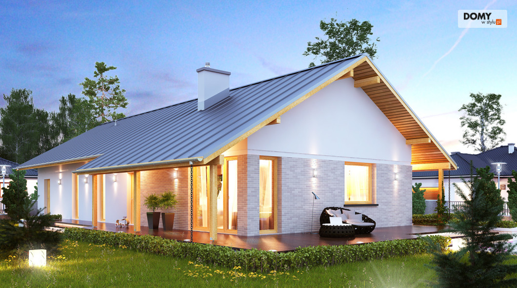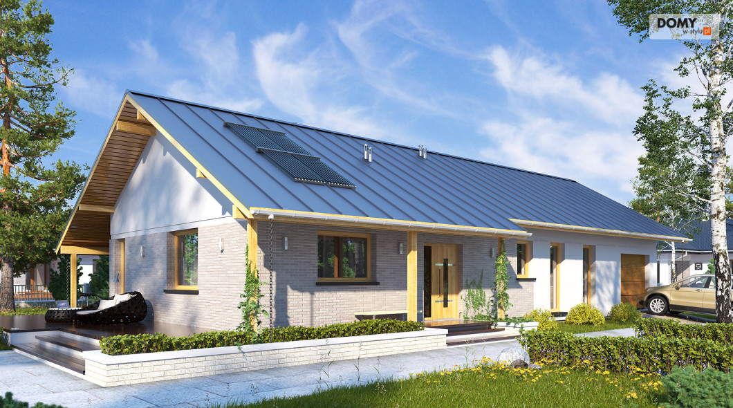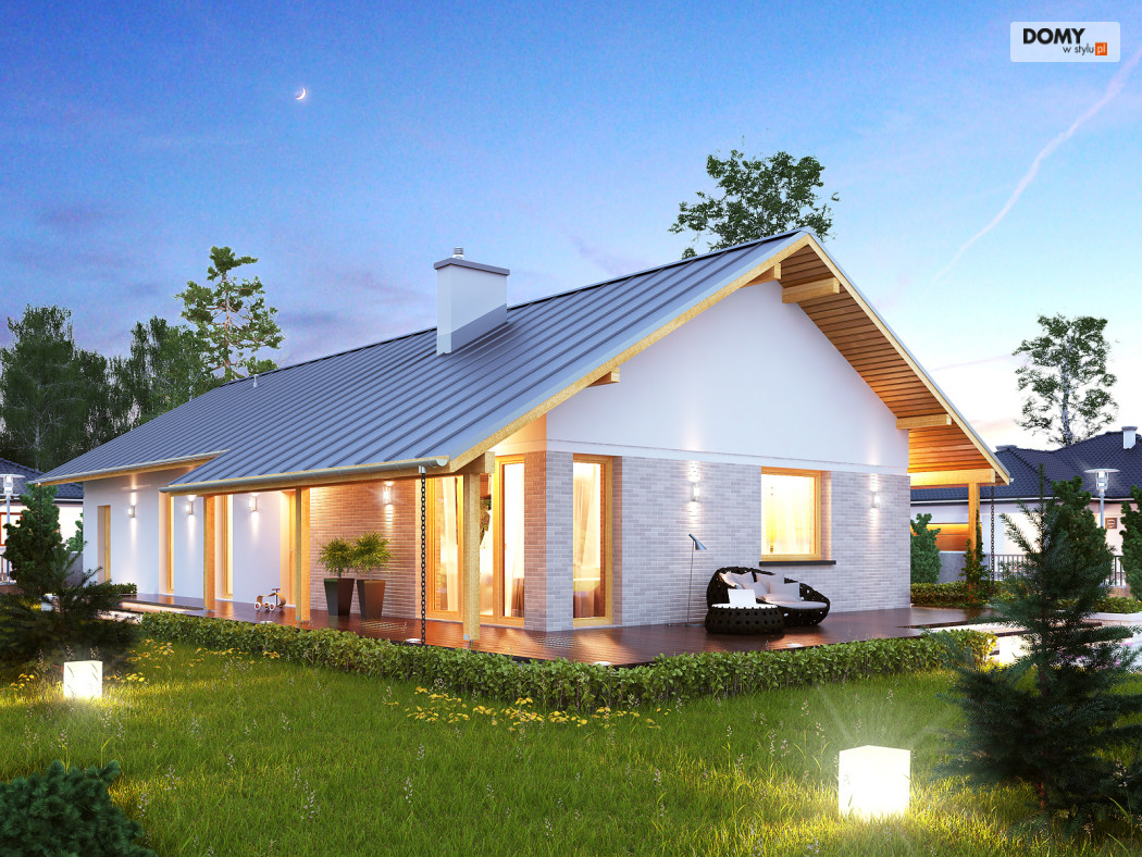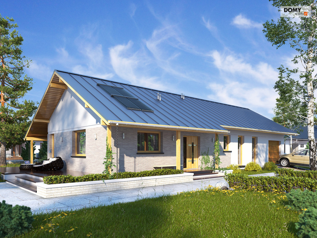Parterowy dom jednorodzinny o prostej bryle i czystym układzie funkcjonalnym z wyraźnym podziałem na część dzienną i nocną. Salon posiada wysoki sufit oraz duże przeszklenie stanowiące wyjście na taras. W domu znajdują się trzy wygodne sypialnie oraz dwie łazienki i garderoba. Kotłownia z wejściem także z zewnątrz przygotowana pod paliwo stałe. Łączna powierzchnia użytkowa domu, bez uwzględnienia powierzchni garażu, wynosi 102,56 m². Wewnątrz domu zaprojektowano trzy sypialnie oraz dwie łazienki. Na uwagę zasługuje zastosowany w projekcie model kuchni otwartej. Pomieszczeniem dodatkowym domu jest garderoba. Prezentowany projekt po zbliźniaczeniu będzie się idealnie nadawał do zabudowy szeregowej. Dom został zaprojektowany w nowoczesnym stylu. Projekt posiada wersję w odbiciu lustrzanym.