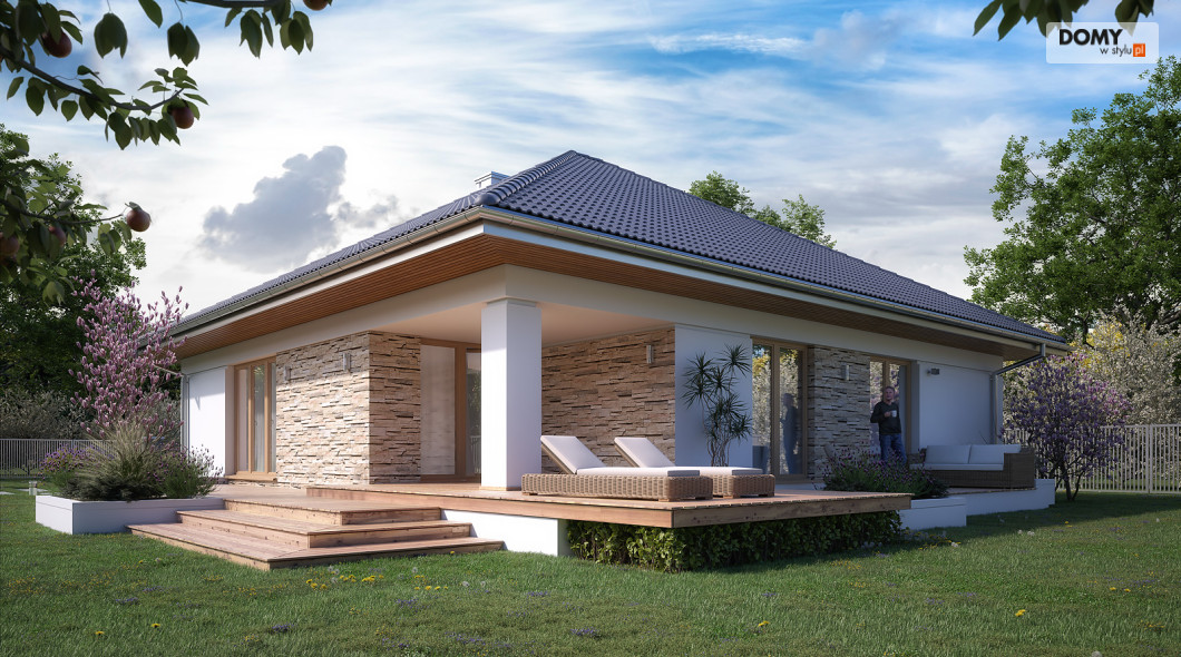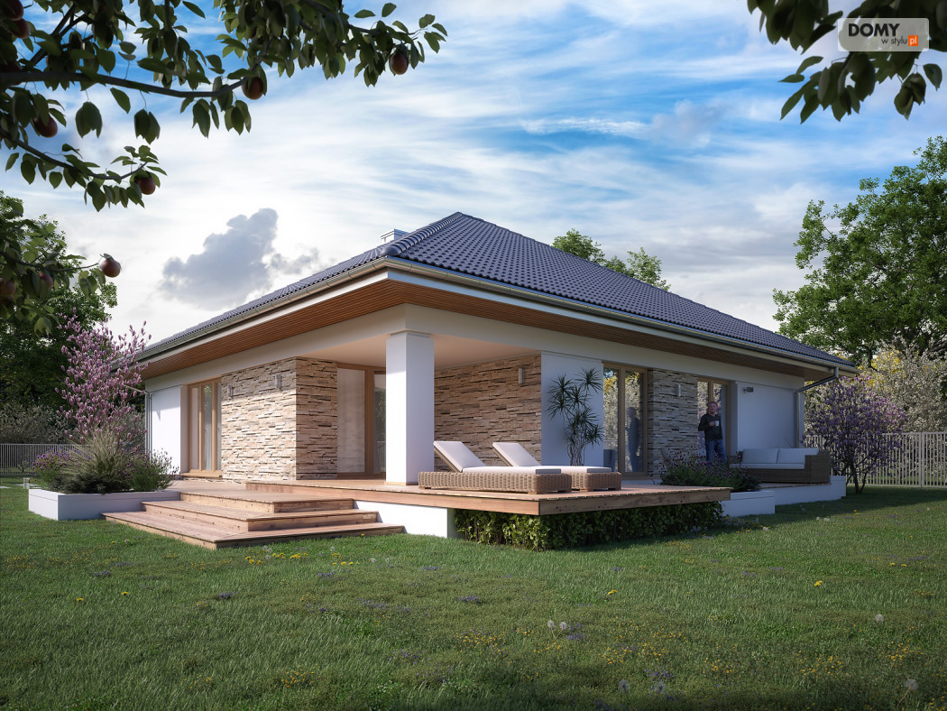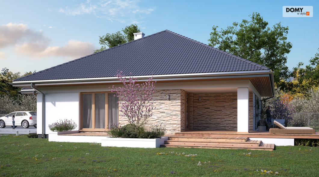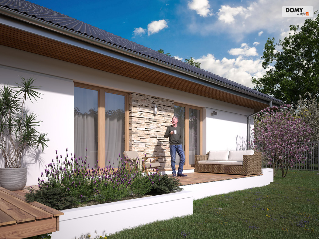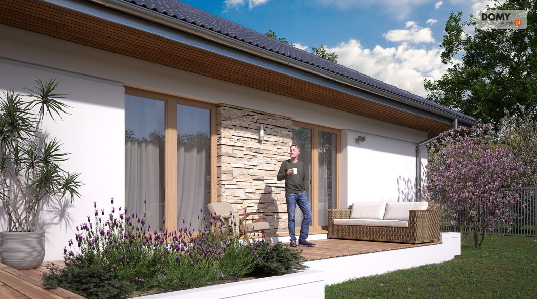 Ariel 9 to projekt domu parterowego, charakteryzujący się nowoczesną bryłą przykrytą wielospadowym dachem. W projekcie zaprojektowano piwnicę, w której poza kotłownią znajdują się dwa pomieszczenia gospodarcze. Układ funkcjonalny na parterze został podzielony na część dzienną oraz nocną. W części dziennej znajduje się przestronny salon z kominkiem i wyjściem na zadaszony taras. Salon płynnie łączy się z jadalnia oraz otwartą kuchnią ze spiżarnią. W części nocnej zaprojektowano trzy sypialnie, rodzinną łazienkę oraz WC. Dwie sypialnie posiadają wyjście na taras, który biegnie wzdłuż dwóch ścian budynku. Główna sypialnia tworzy apartament gospodarzy z własną łazienką oraz garderobą.