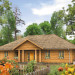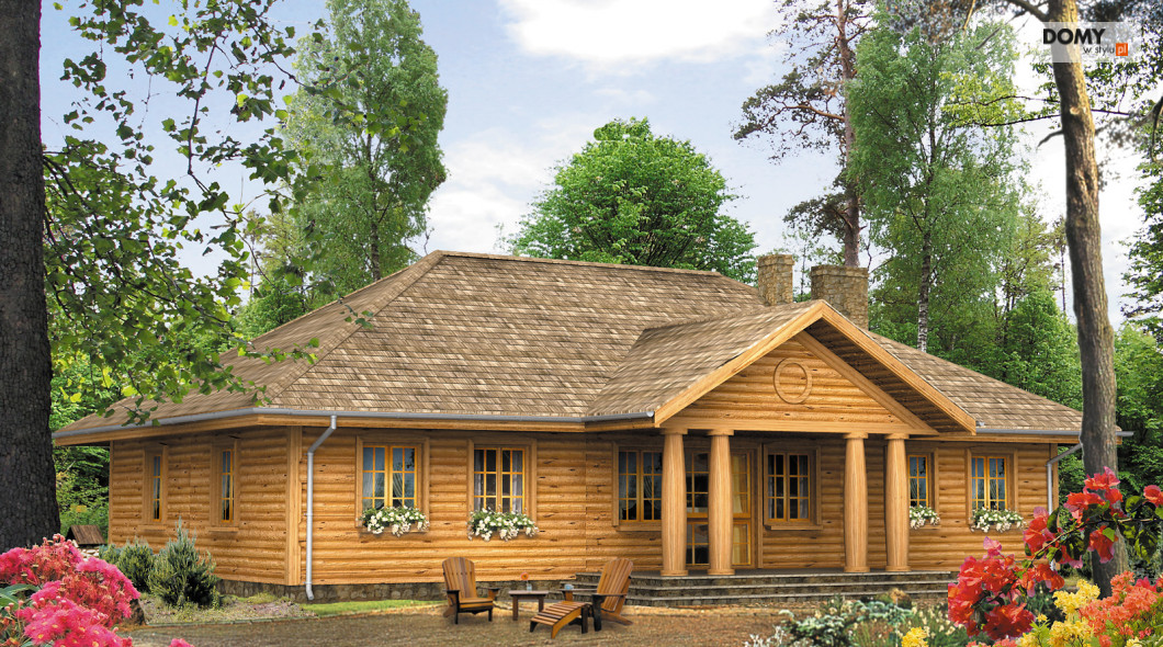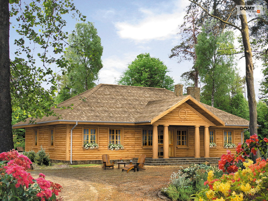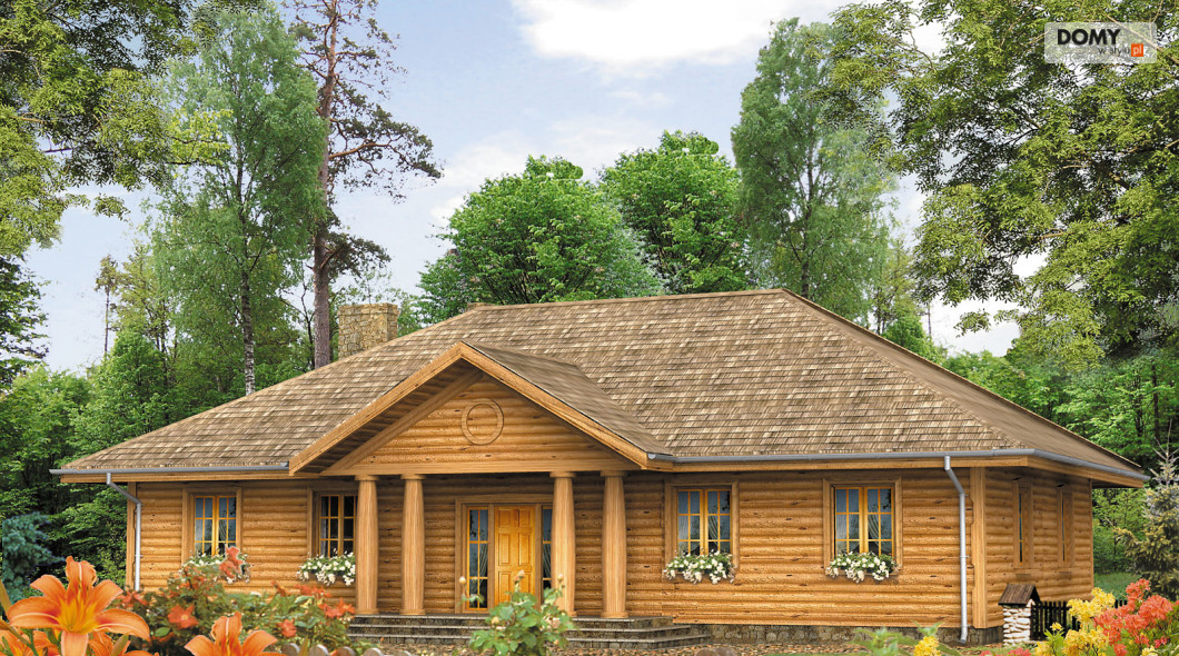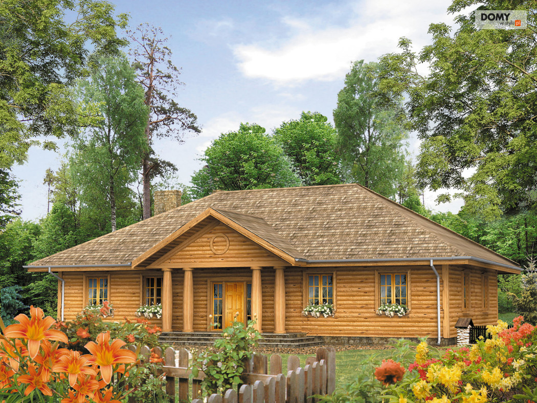 Parterowy dom drewniany dla 4 - 5-osobowej rodziny. Prosta, tradycyjna bryła z dachem kopertowym.