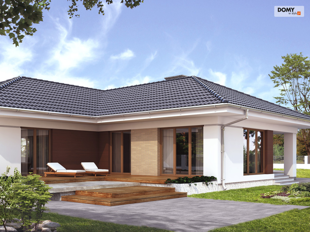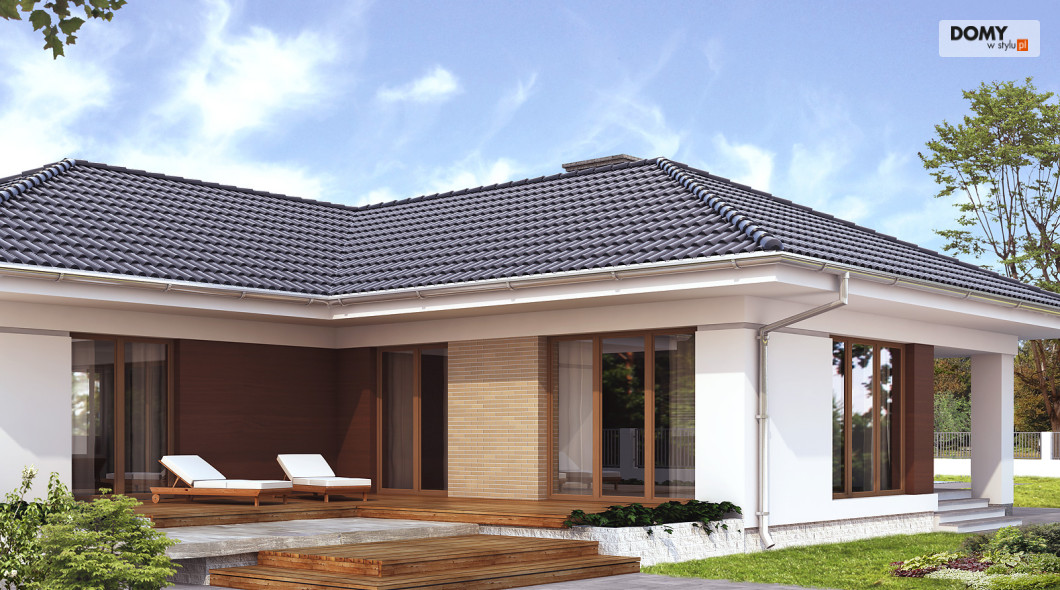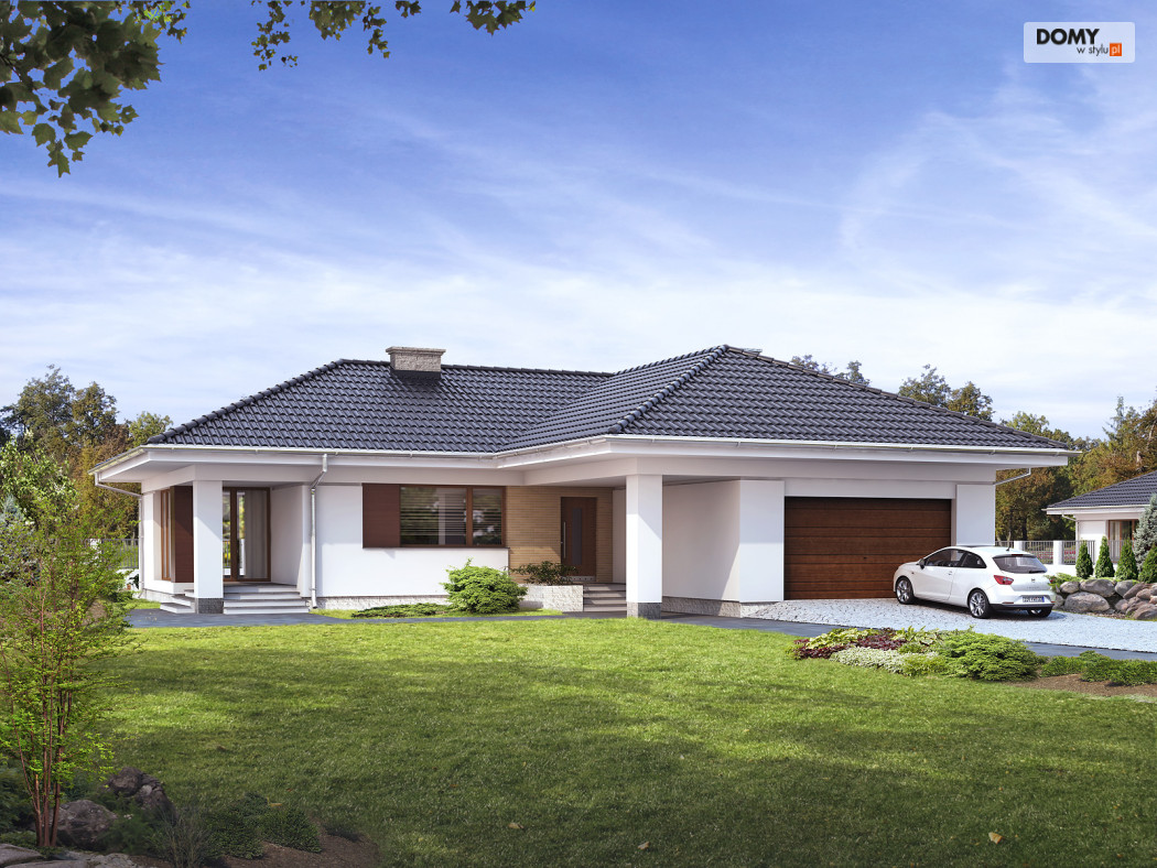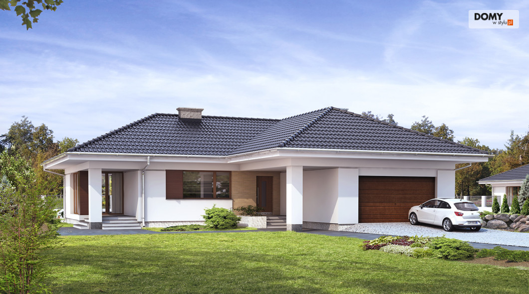 Jednorodzinny budynek mieszkalny, niepodpiwniczony. Wielkim atutem projektu są cztery sypialnie, co umożliwia wygodne funkcjonowanie 5-osobowej rodziny. W części dziennej zaprojektowano kuchnię ze spiżarnią oraz salon z jadalnią, z którego prowadzi wyjście na zadaszony taras. Część nocną stanowią cztery sypialnie, w tym jedna z własną łazienką i garderobą. W części gospodarczej przewidziano przestronną kotłownię oraz dwustanowiskowy garaż.