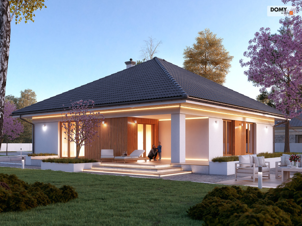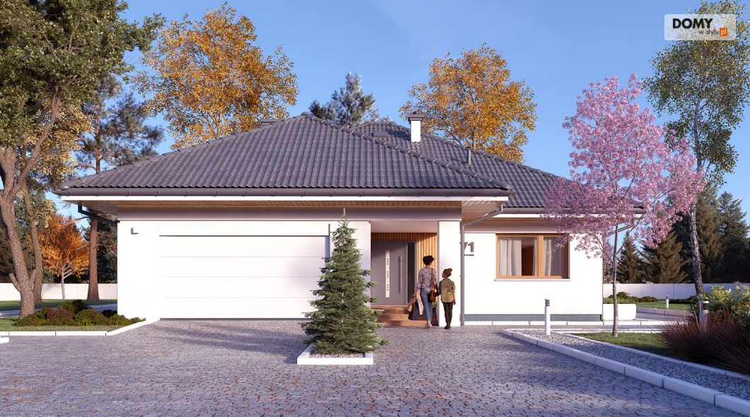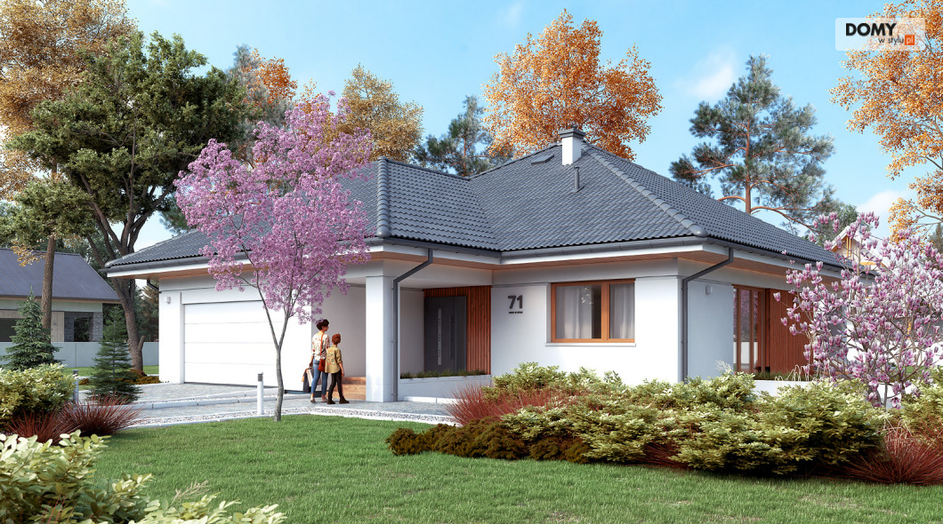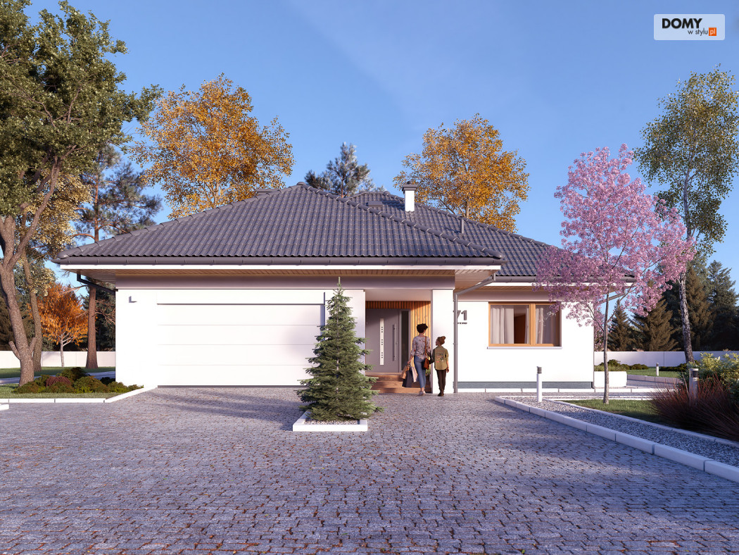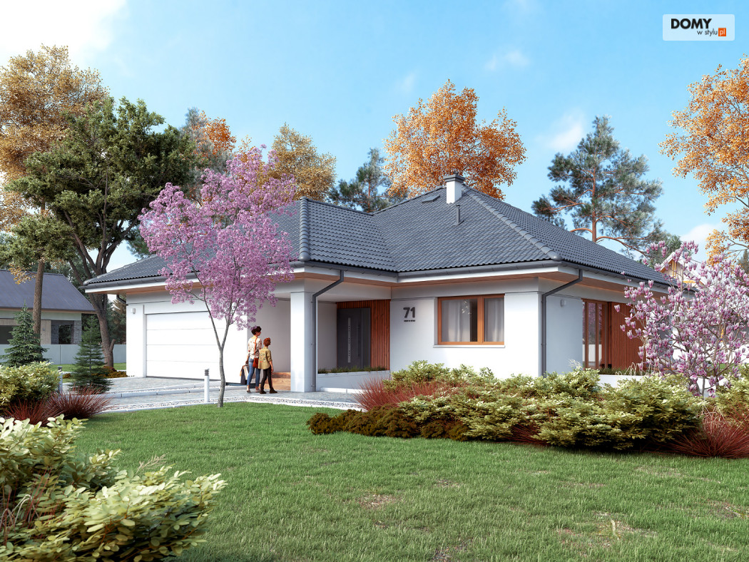 Jednorodzinny budynek mieszkalny, parterowy, niepodpiwniczony, swoim pełnym programem funkcjonalnym zapewnia optymalny komfort 4-osobowej rodzinie. W części dziennej przewidziano salon z jadalnią, kuchnię ze spiżarnią oraz wc. W części nocnej zaprojektowano trzy sypialnie, z czego jedną z łazienką i garderobą oraz łazienkę. Część gospodarczą stanowi kotłownia na paliwo stałe oraz dwustanowiskowy garaż.