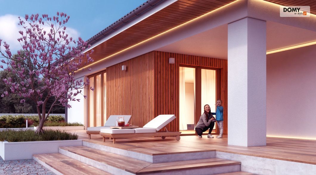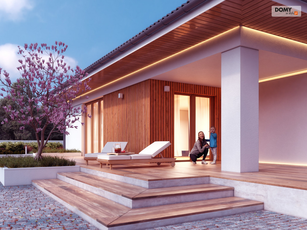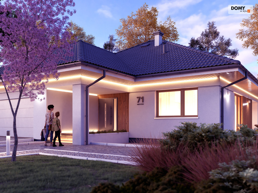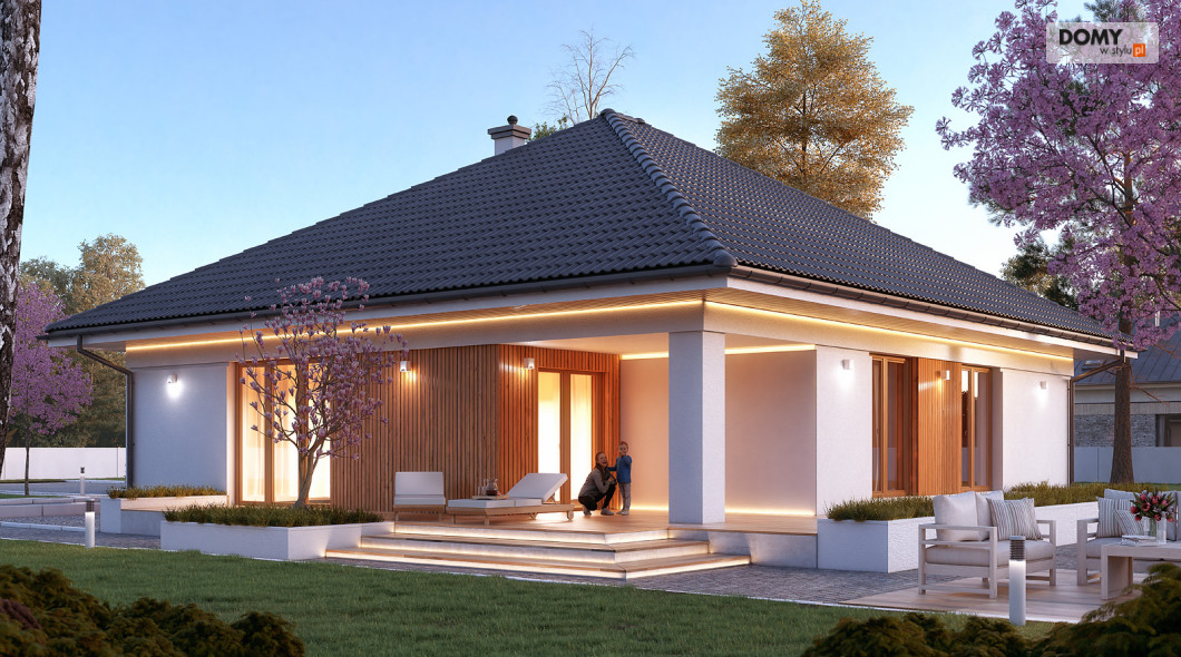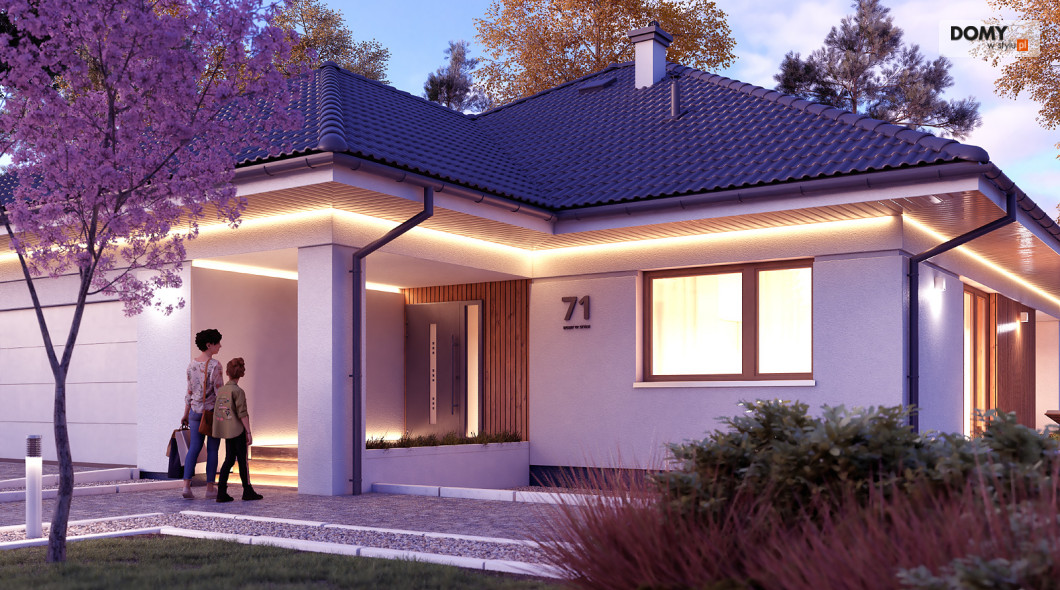 Jednorodzinny budynek mieszkalny, parterowy, niepodpiwniczony, swoim pełnym programem funkcjonalnym zapewnia optymalny komfort 4-osobowej rodzinie. W części dziennej przewidziano salon z jadalnią, kuchnię ze spiżarnią oraz wc. W części nocnej zaprojektowano trzy sypialnie, z czego jedną z łazienką i garderobą oraz łazienkę. Część gospodarczą stanowi kotłownia na paliwo stałe oraz dwustanowiskowy garaż.