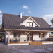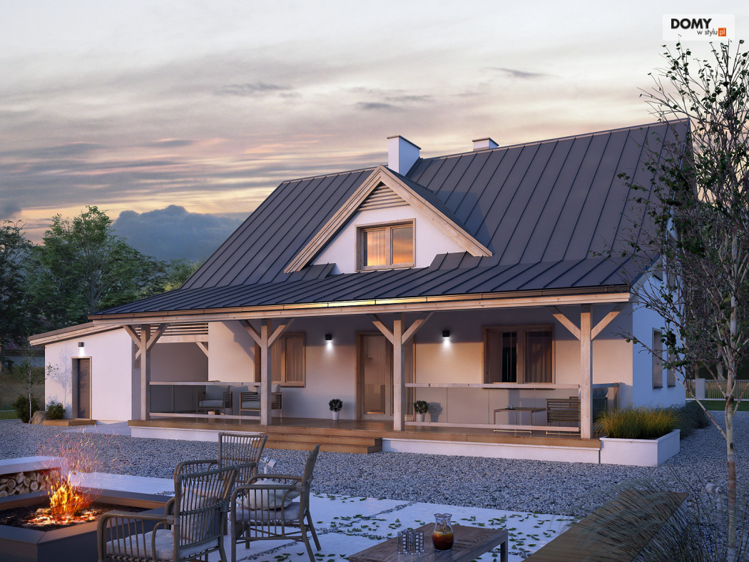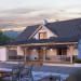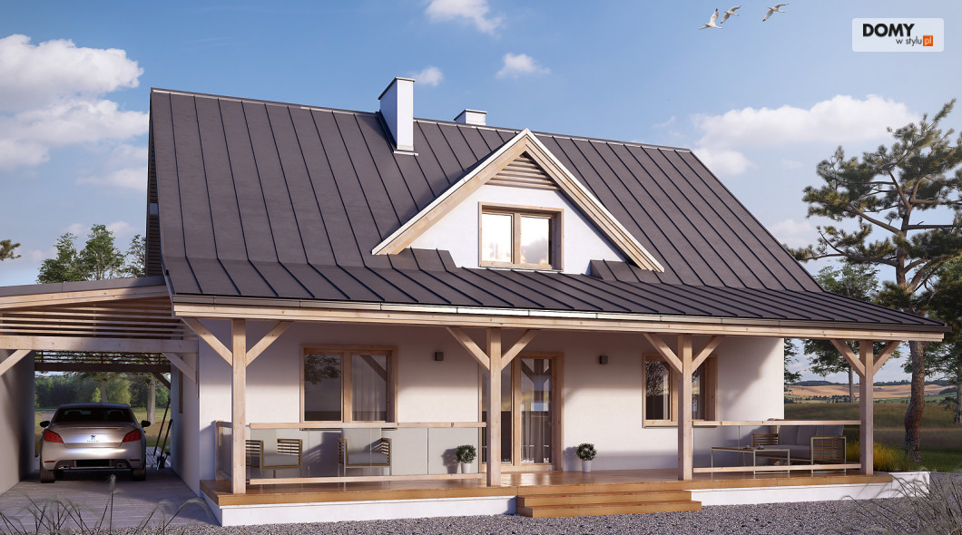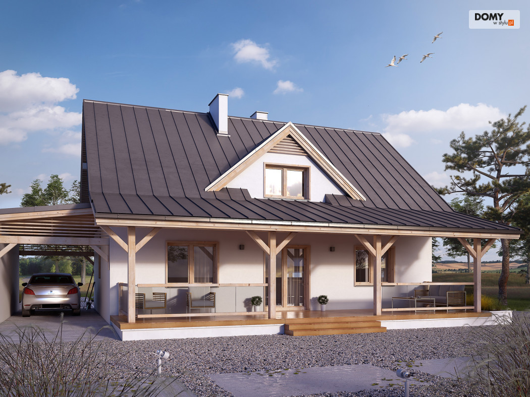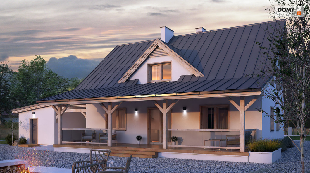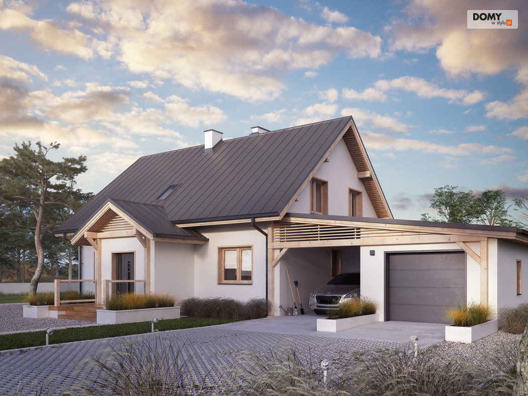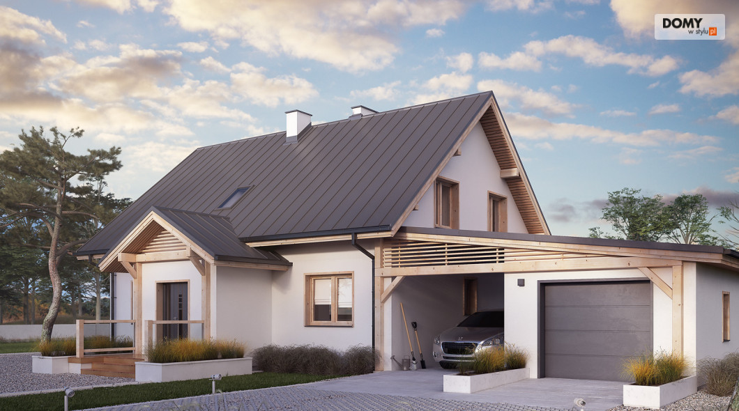 Poziomkowy 2 to dom jednorodzinny, niepodpiwniczony z użytkowym poddaszem oraz garażem z wiatą. Na parterze znajduje się salon połączony z jadalnią oraz otwarta kuchnia z łatwo dostępną spiżarnią. Atutem projektu jest dodatkowy pokój na parterze sąsiadujący z ogólnodostępną łazienką. Na poddaszu wygospodarowano trzy sypialnie, garderobę oraz łazienkę. Projekt wyróżnia się poprzez zadaszony taras od strony elewacji ogrodowej oraz przestrzeń pod wiatą, która może służyć jako dodatkowe miejsce parkingowe.