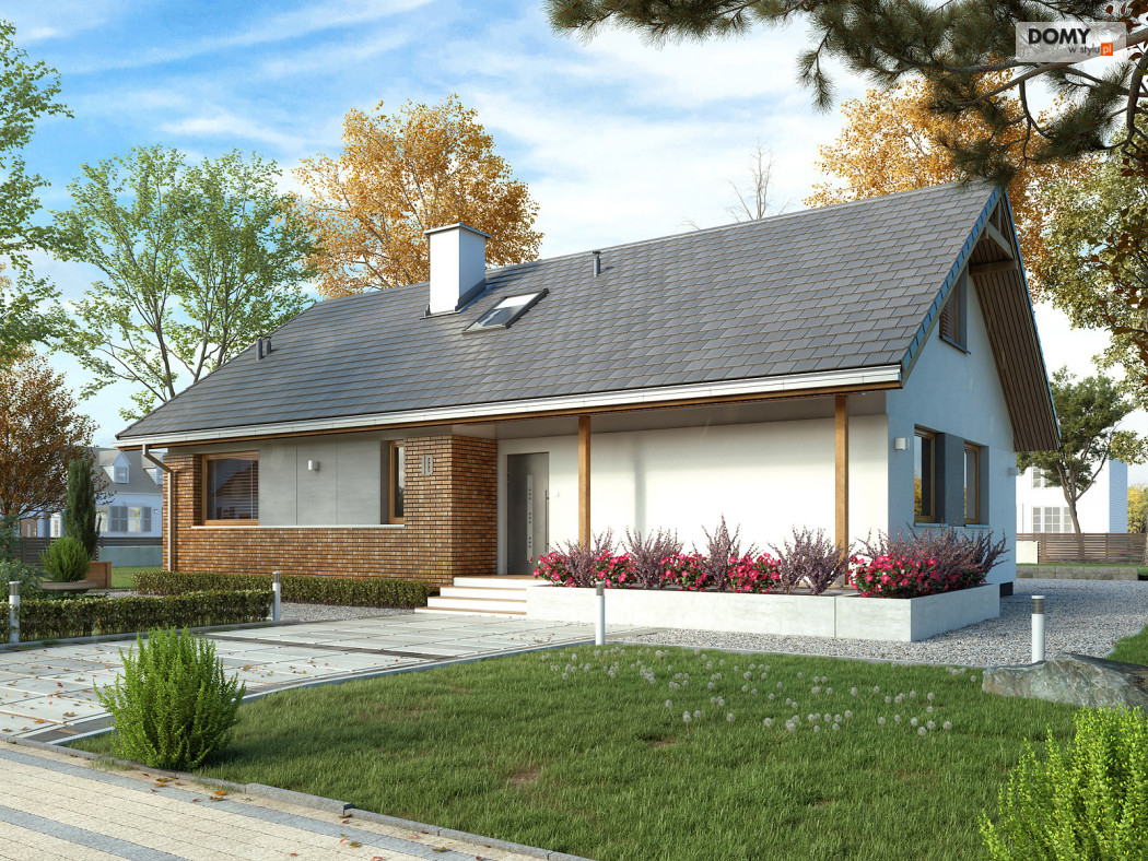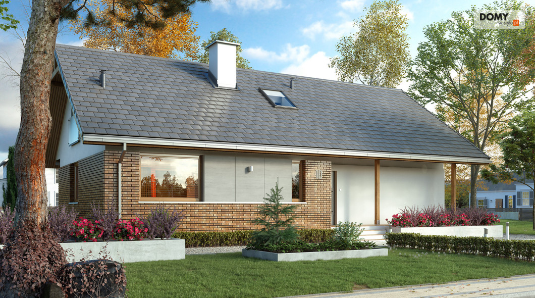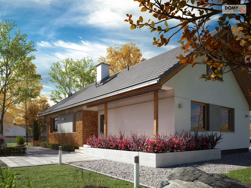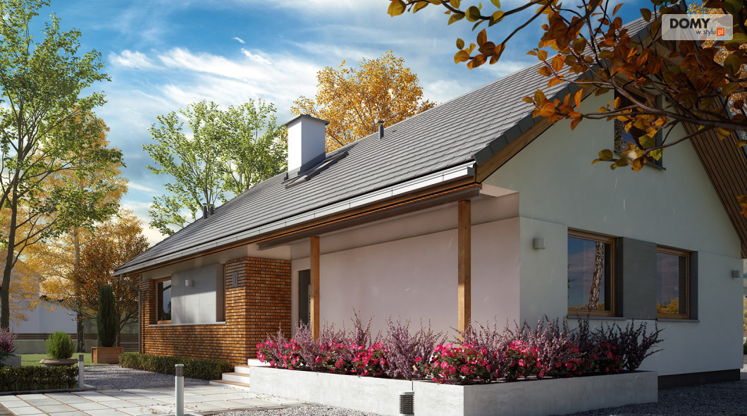 Projekt Mak 4 to projekt domu parterowego z użytkowym poddaszem. Prosta bryła budynku została przykryta dwuspadowym, co czyni dom niedrogim w budowie i utrzymaniu. W projekcie zaprojektowano nieduże poddasze użytkowe, co jest idealną opcją dla rodzin planujących wykończenie poddasza w przyszłości. Parter stanowi w pełni funkcjonalną strefę życiową z podziałem na część dzienną i nocną. W strefie dziennej znajduje się otwarta kuchnia ze spiżarnią, jadalnia oraz przestronny salon. W strefie nocnej na parterze zaprojektowano dwie sypialnie oraz wygodną łazienkę. Na poddaszu znajdują się dodatkowe dwa duże pokoje z szafami wnękowymi pod skosami oraz łazienka z prysznicem. Uzupełnieniem układu funkcjonalnego jest przedsionek z miejscem na szafę oraz wejściem do kotłowni dostosowanej zarówno pod ogrzewanie gazowe jak i na paliwo stałe.