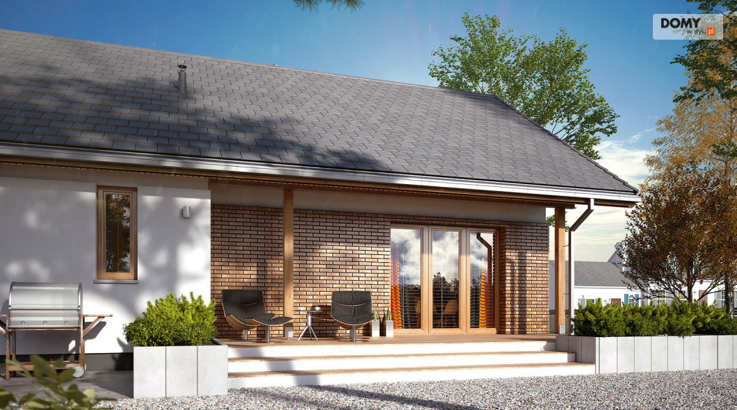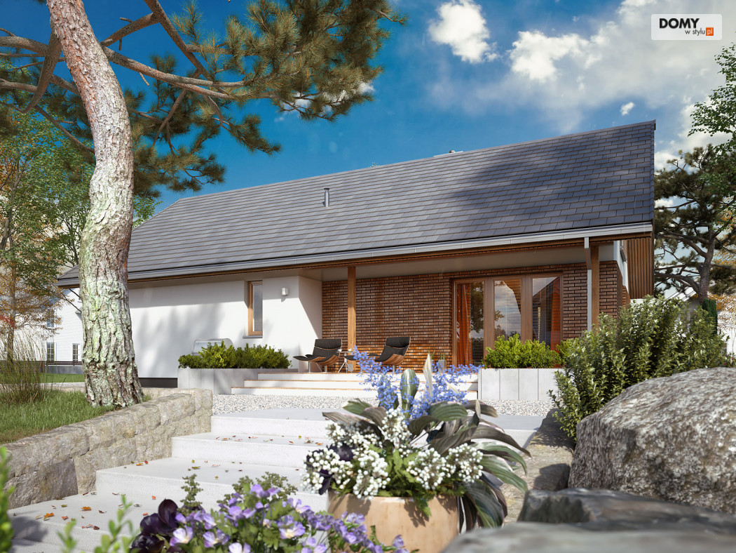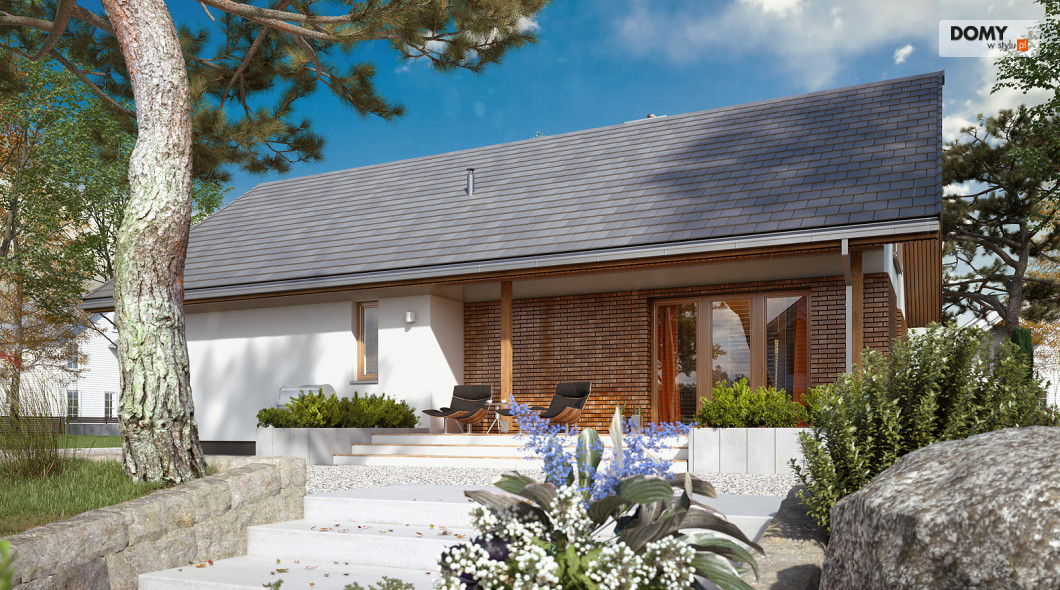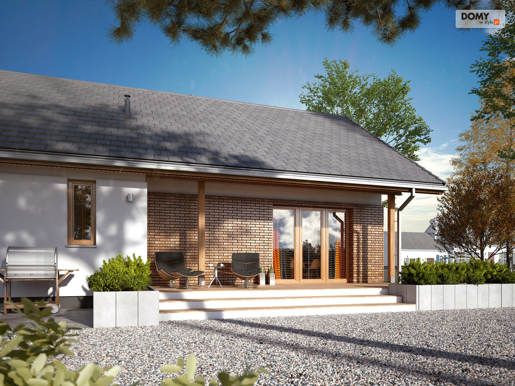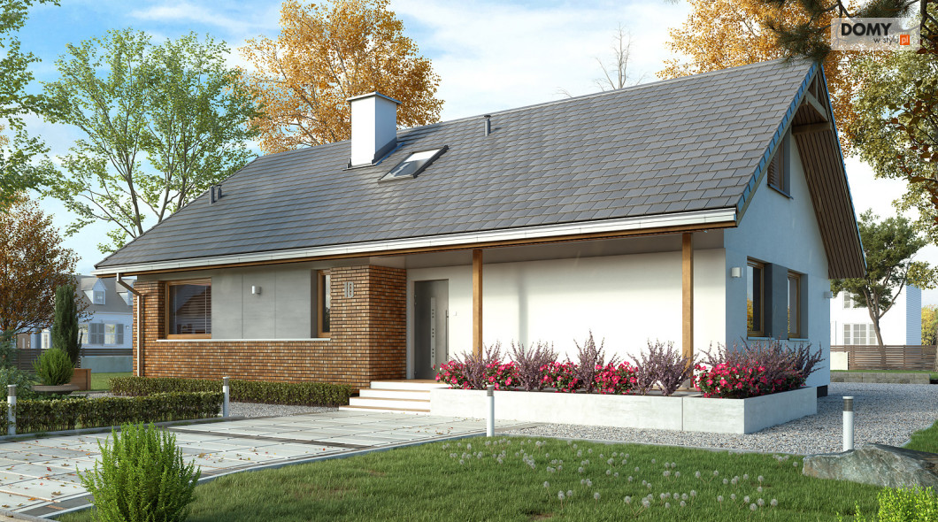 Projekt Mak 4 to projekt domu parterowego z użytkowym poddaszem. Prosta bryła budynku została przykryta dwuspadowym, co czyni dom niedrogim w budowie i utrzymaniu. W projekcie zaprojektowano nieduże poddasze użytkowe, co jest idealną opcją dla rodzin planujących wykończenie poddasza w przyszłości. Parter stanowi w pełni funkcjonalną strefę życiową z podziałem na część dzienną i nocną. W strefie dziennej znajduje się otwarta kuchnia ze spiżarnią, jadalnia oraz przestronny salon. W strefie nocnej na parterze zaprojektowano dwie sypialnie oraz wygodną łazienkę. Na poddaszu znajdują się dodatkowe dwa duże pokoje z szafami wnękowymi pod skosami oraz łazienka z prysznicem. Uzupełnieniem układu funkcjonalnego jest przedsionek z miejscem na szafę oraz wejściem do kotłowni dostosowanej zarówno pod ogrzewanie gazowe jak i na paliwo stałe.