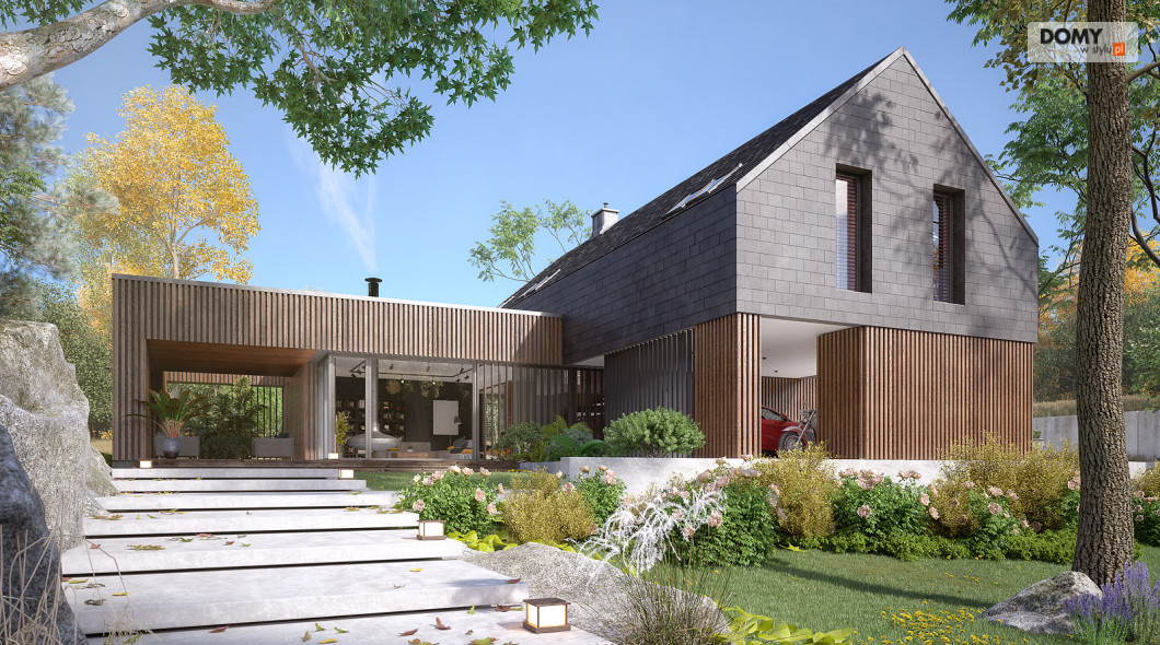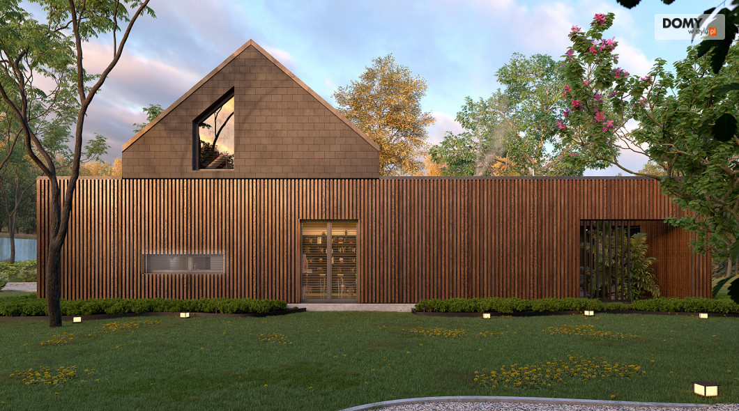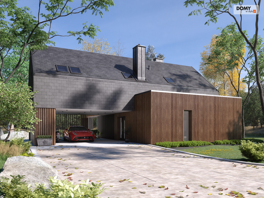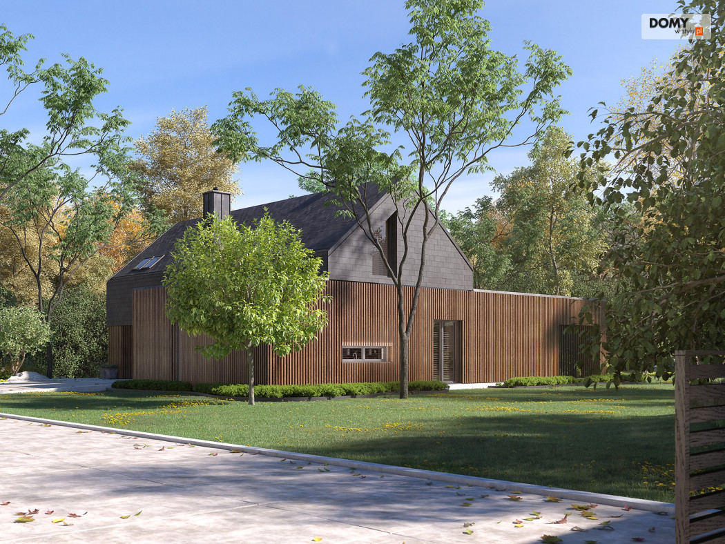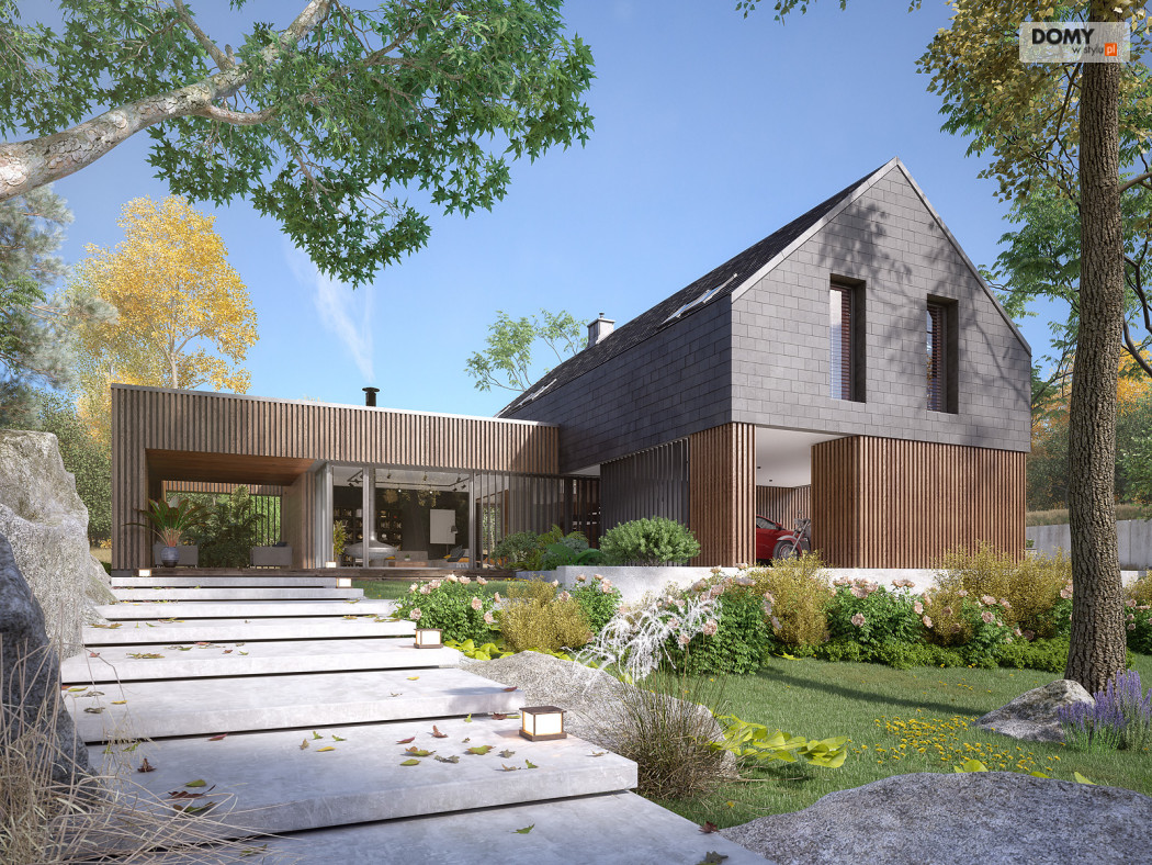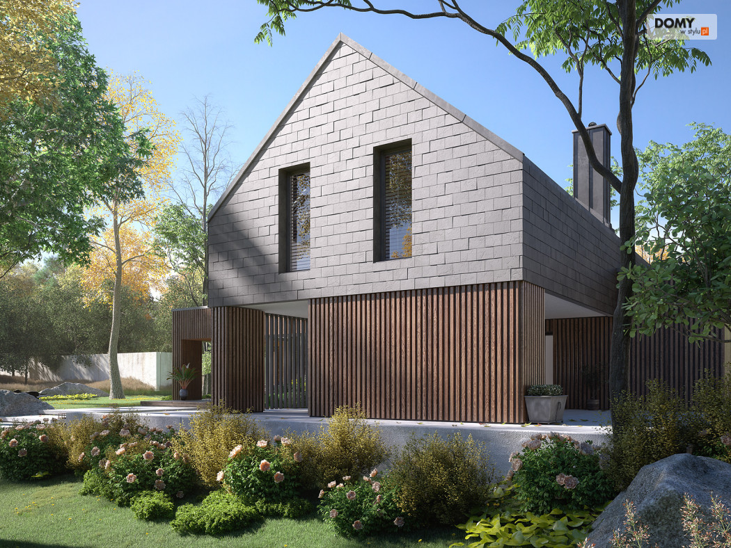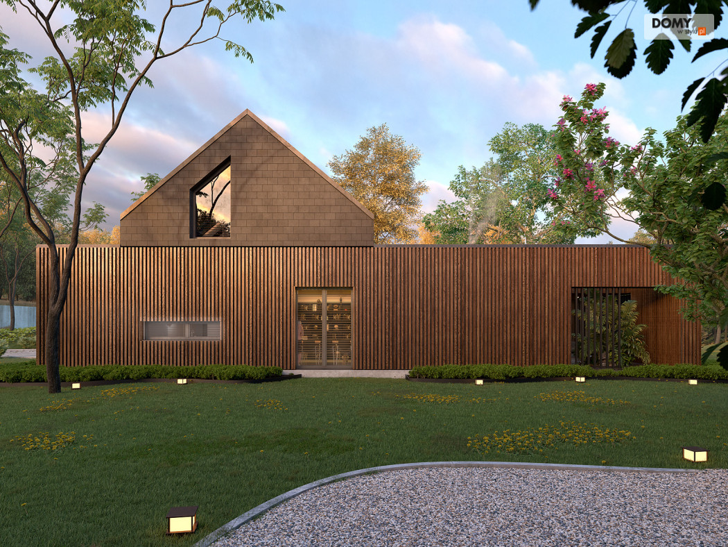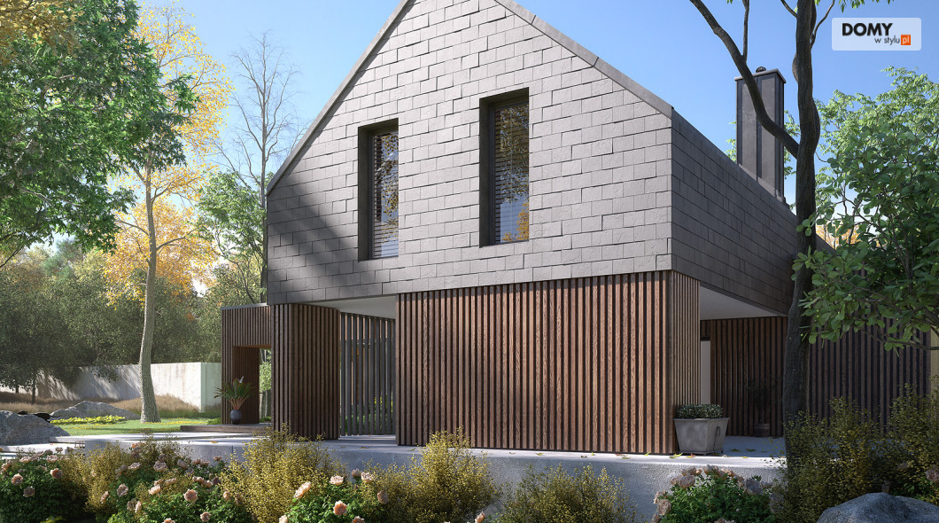 Platan to projekt reprezentacyjnego domu o nowoczesnej architekturze. Ta wersja projektu powstała z myślą o 4-osobowej rodzinie. Czytelna idea projektu, w której rozdzielenie układu funkcjonalnego odpowiada dwóm odrębnym bryłom ustawionym względem siebie prostopadle, na różnej wysokości. Dolna bryła kryje otwartą przestrzeń dzienną, z panoramicznym oknem łączącym duży salon z ogrodem i zadaszonym tarasem. Na parterze znajduje się również reprezentacyjna część wejściowa z klatką schodową, a także kuchnia z dużym schowkiem mogącym służyć jako spiżarnia oraz garderoba. Górna bryła to poddasze przeznaczone dla domowników. Zaprojektowano trzy sypialnie, w tym jedna z osobną łazienką i garderobą. Projekt może stanowić punkt wyjścia do modyfikacji i zaprojektowania domu dostosowanego do indywidualnych potrzeb.