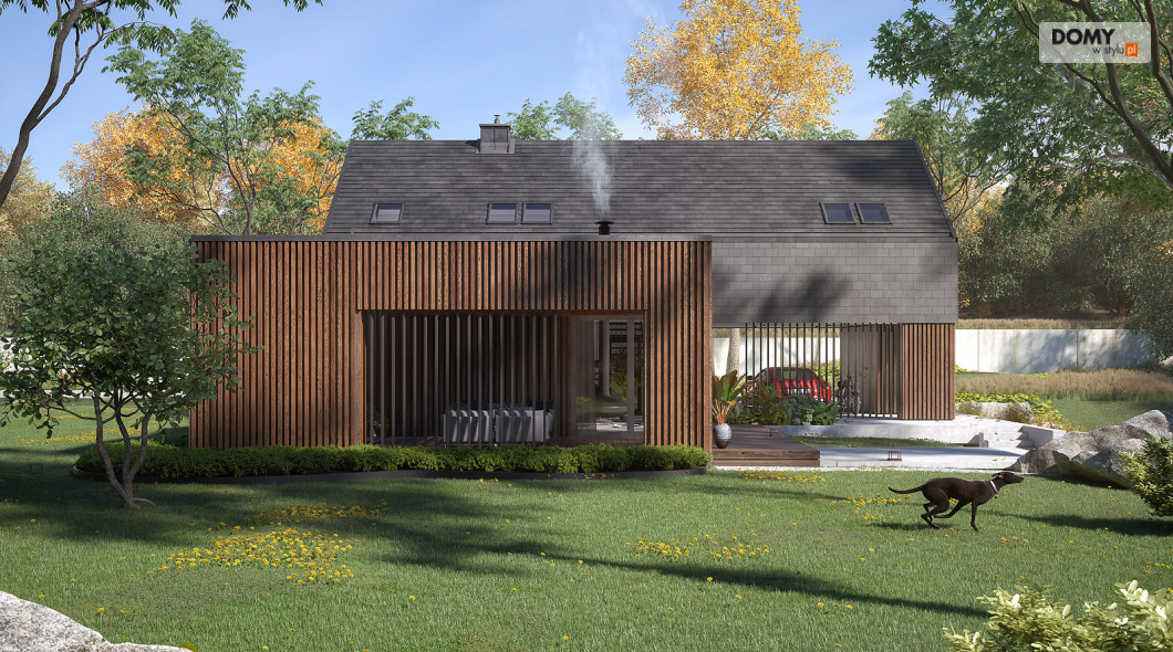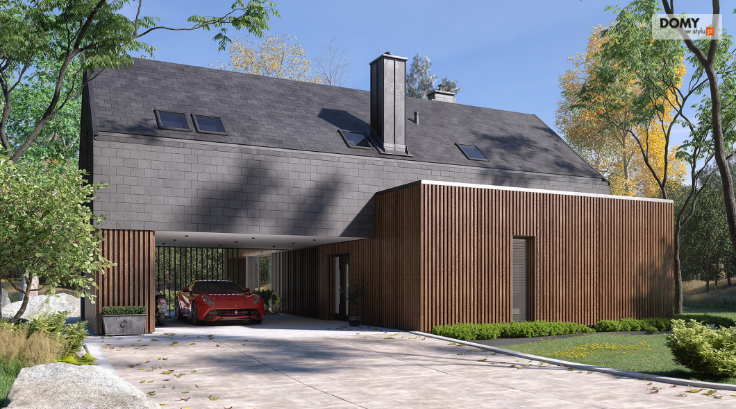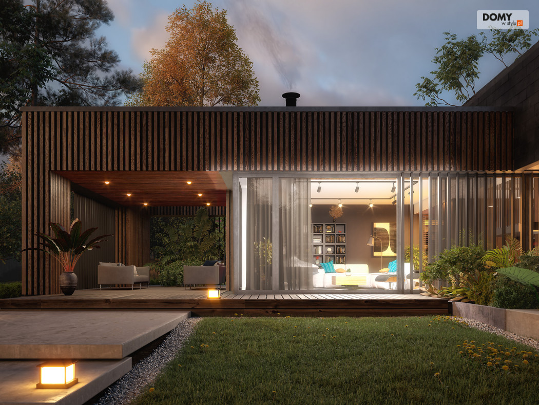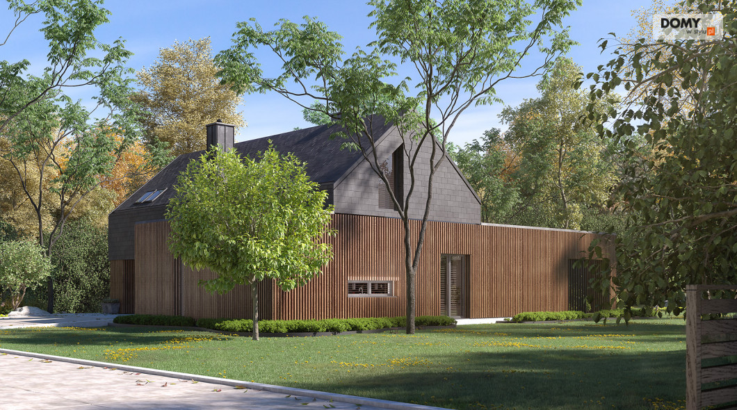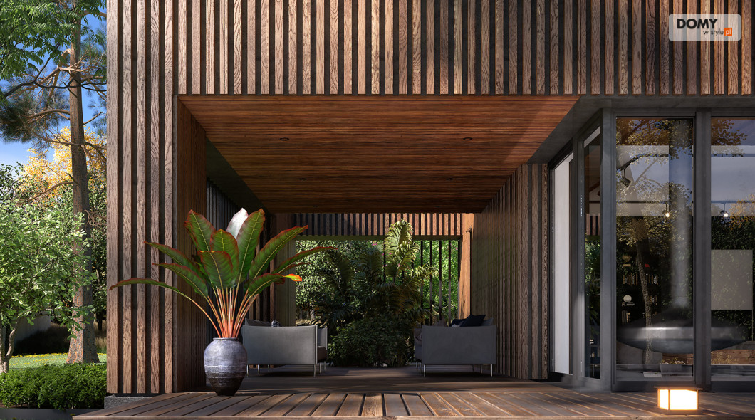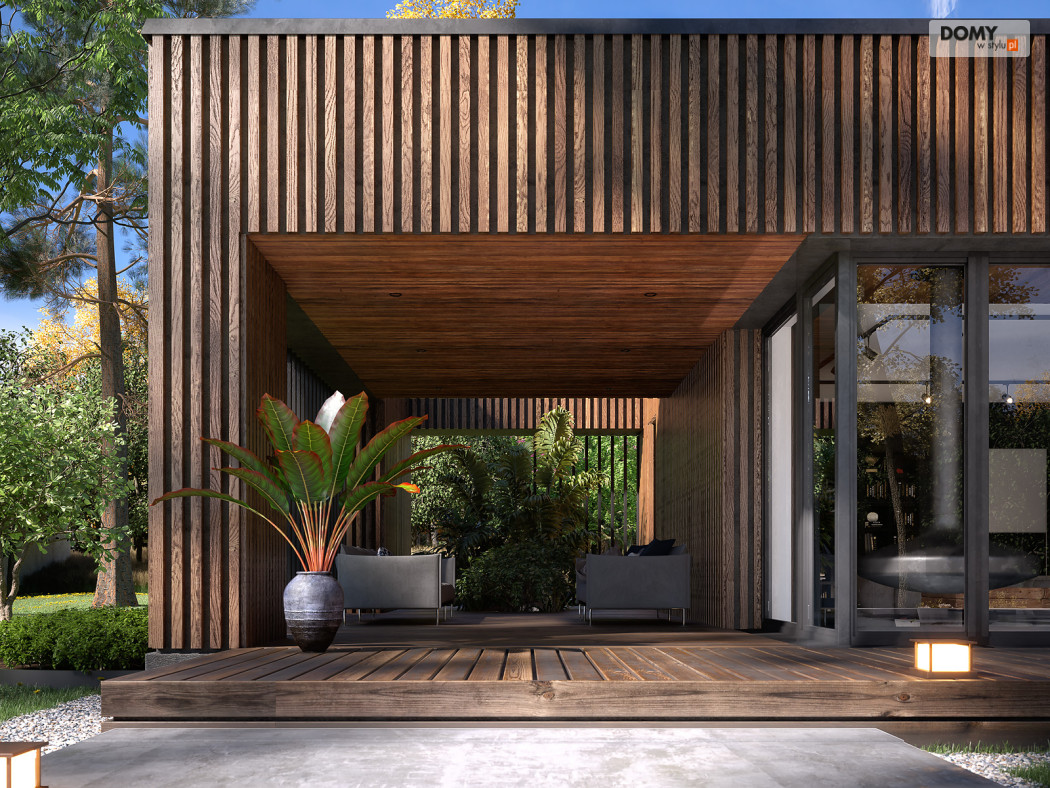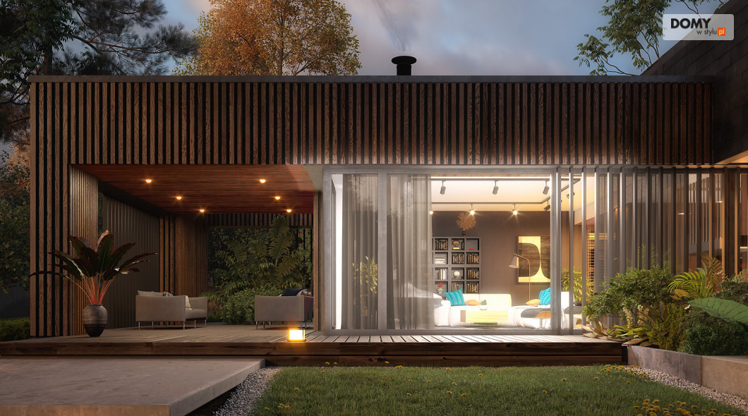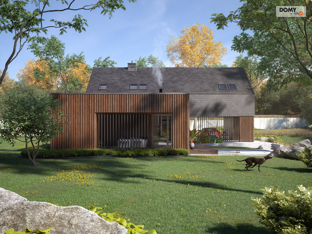Platan to projekt reprezentacyjnego domu o nowoczesnej architekturze. Ta wersja projektu powstała z myślą o 4-osobowej rodzinie. Czytelna idea projektu, w której rozdzielenie układu funkcjonalnego odpowiada dwóm odrębnym bryłom ustawionym względem siebie prostopadle, na różnej wysokości. Dolna bryła kryje otwartą przestrzeń dzienną, z panoramicznym oknem łączącym duży salon z ogrodem i zadaszonym tarasem. Na parterze znajduje się również reprezentacyjna część wejściowa z klatką schodową, a także kuchnia z dużym schowkiem mogącym służyć jako spiżarnia oraz garderoba. Górna bryła to poddasze przeznaczone dla domowników. Zaprojektowano trzy sypialnie, w tym jedna z osobną łazienką i garderobą. Projekt może stanowić punkt wyjścia do modyfikacji i zaprojektowania domu dostosowanego do indywidualnych potrzeb.