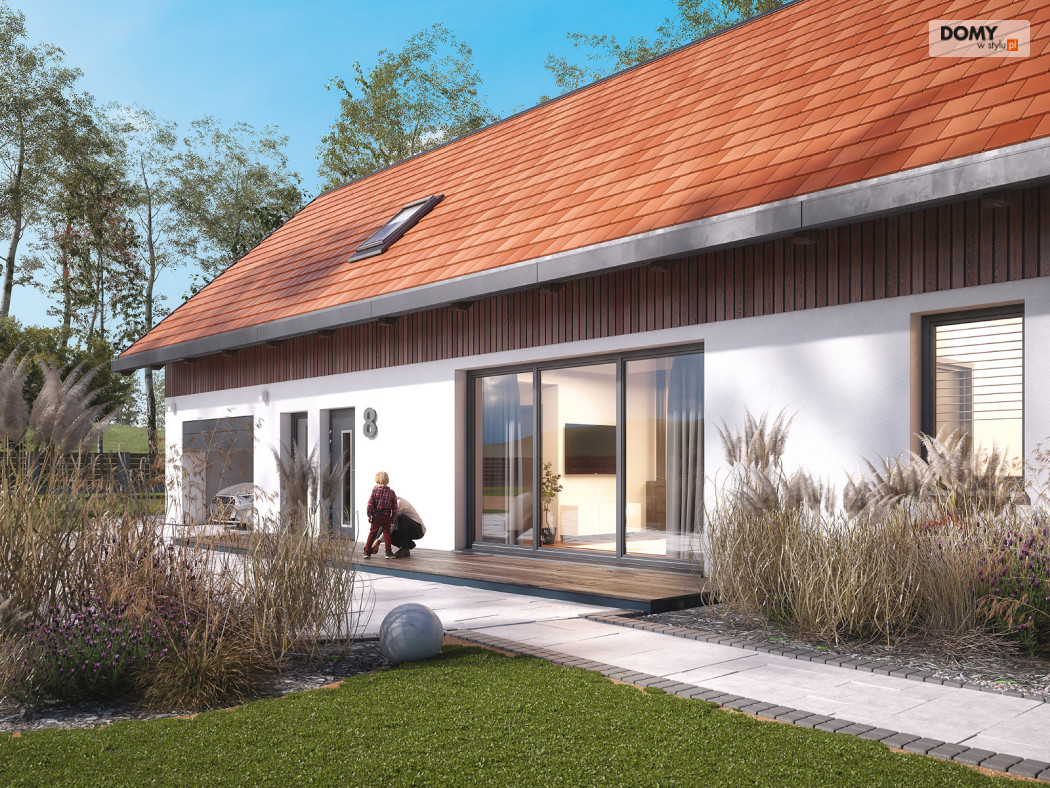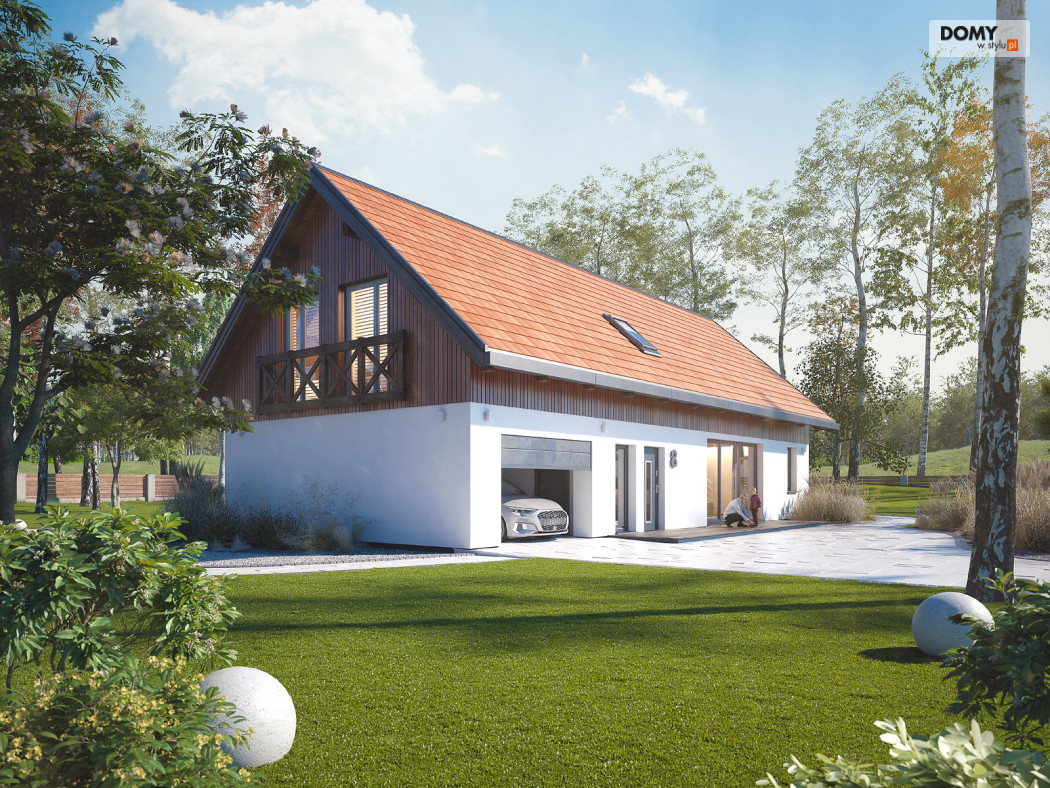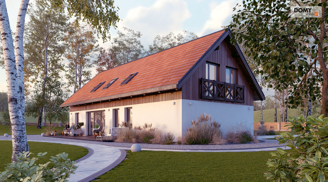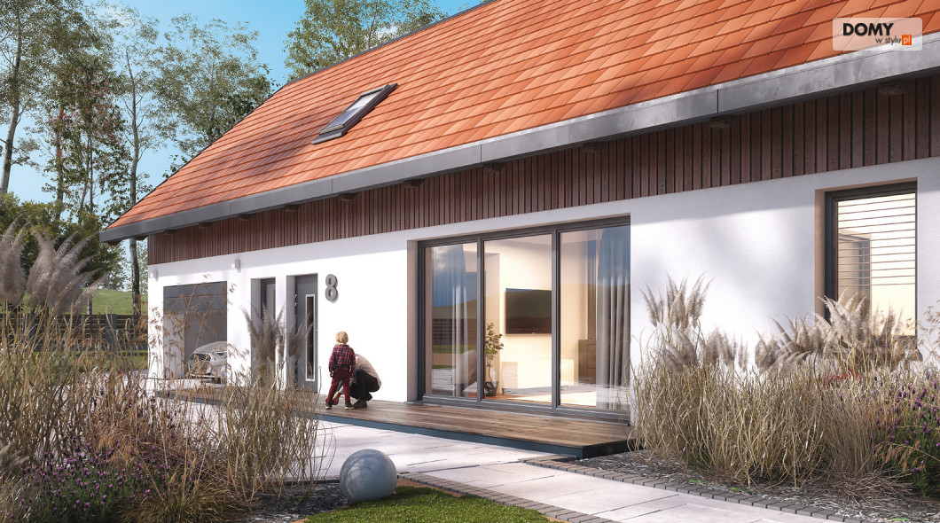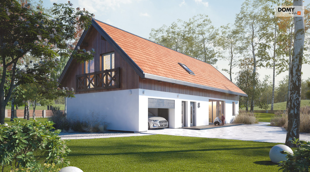 Projekt domu Tytus to dom z użytkowym poddaszem zaprojektowany w stylu nowoczesnej stodoły. Prosta bryła z dwuspadowym dachem oraz licznymi przeszkleniami to wyznaczniki tego popularnego stylu architektonicznego. Wykończenie elewacji w postaci jasnego tynku i drewnianej szalówki idealnie współgra z dachówką ceramiczną w kolorze ceglastym. Układ wnętrza charakteryzuje się otwartą przestrzenią dzienną z szerokimi przeszkleniami, wysokim sufitem oraz antresolą. W salonie znajdują się wysokie, przesuwne przeszklenia po obu stronach budynku, które zapewniają dużą ilość naturalnego światła oraz umożliwiają połączenie wnętrza z przylegającym do domu ogrodem. Cześć dzienną poza salonem tworzy jadalnia oraz zlokalizowana tuż obok kuchnia ze spiżarnią. Układ funkcjonalny parteru uzupełnia główna sypialnia, łazienka oraz pomieszczenie gospodarcze z możliwością aranżacji na dodatkową łazienkę, pralnię lub garderobę. Na poddasze prowadzą jednobiegowe schody. Poza przestronną antresolą zaprojektowano na nim dwie dodatkowe sypialnie oraz łazienkę z wanną i prysznicem. W bryle budynku zaprojektowano również jednostanowiskowy garaż z miejscem do przechowywania lub majsterkowania.