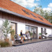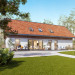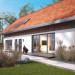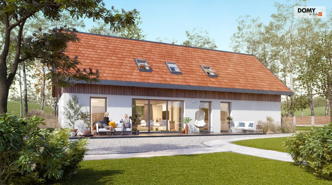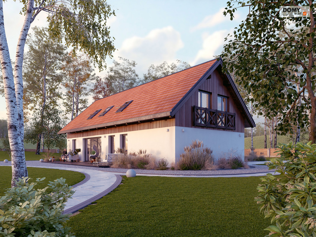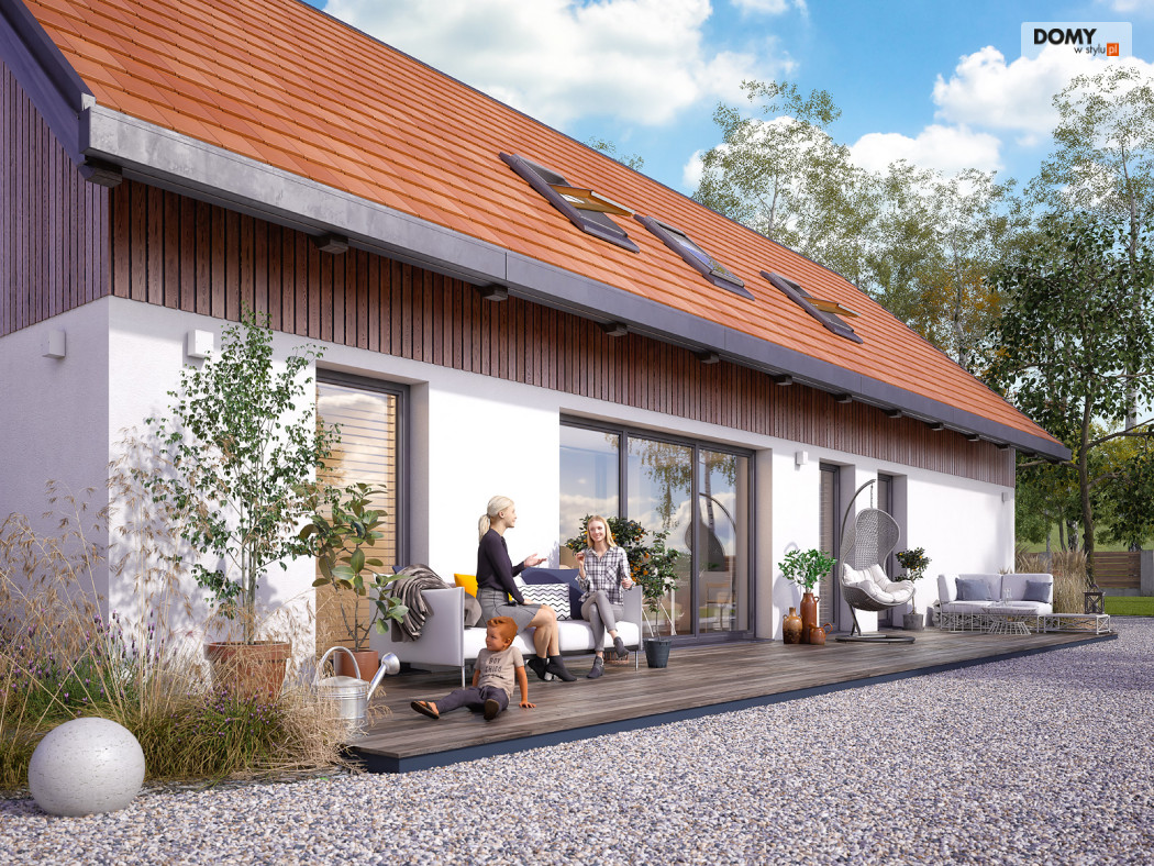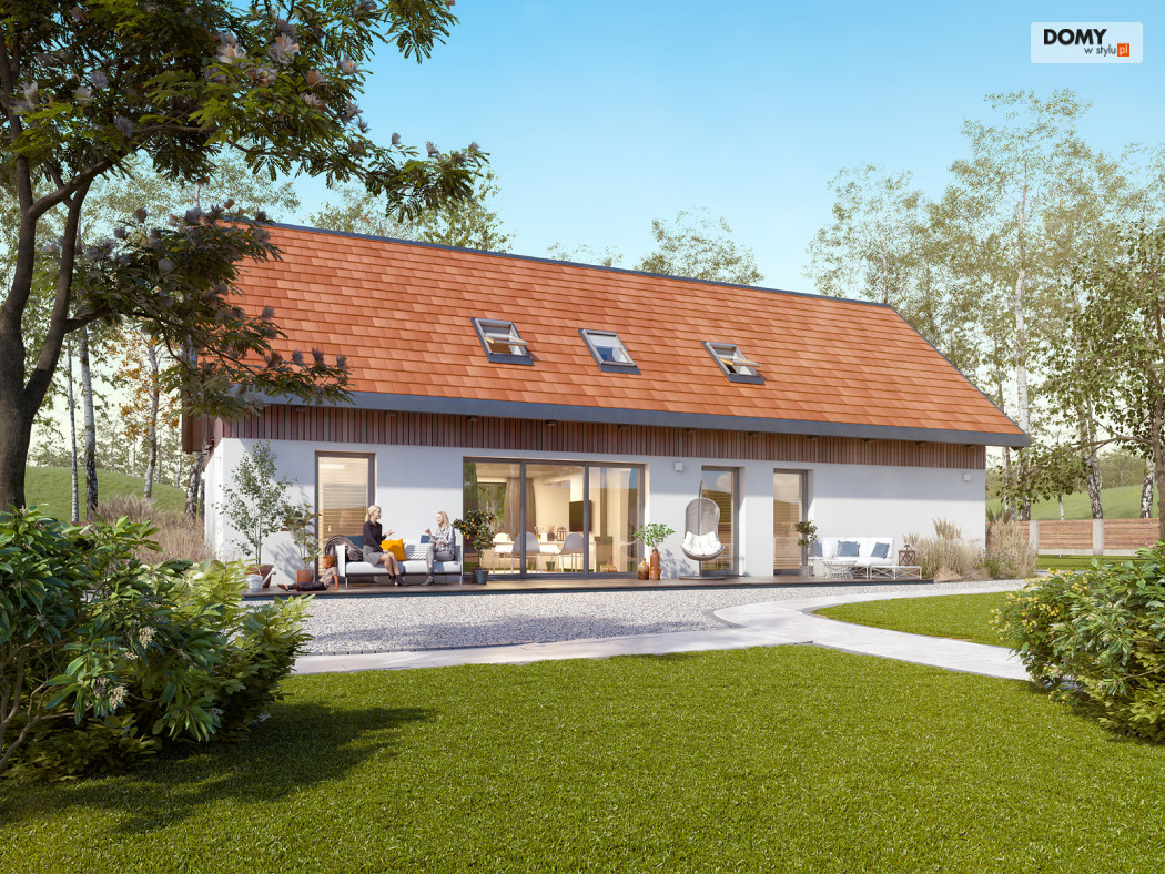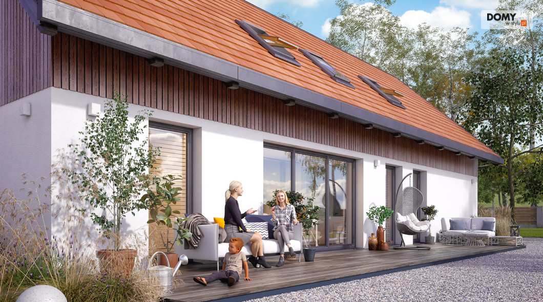 Projekt domu Tytus to dom z użytkowym poddaszem zaprojektowany w stylu nowoczesnej stodoły. Prosta bryła z dwuspadowym dachem oraz licznymi przeszkleniami to wyznaczniki tego popularnego stylu architektonicznego. Wykończenie elewacji w postaci jasnego tynku i drewnianej szalówki idealnie współgra z dachówką ceramiczną w kolorze ceglastym. Układ wnętrza charakteryzuje się otwartą przestrzenią dzienną z szerokimi przeszkleniami, wysokim sufitem oraz antresolą. W salonie znajdują się wysokie, przesuwne przeszklenia po obu stronach budynku, które zapewniają dużą ilość naturalnego światła oraz umożliwiają połączenie wnętrza z przylegającym do domu ogrodem. Cześć dzienną poza salonem tworzy jadalnia oraz zlokalizowana tuż obok kuchnia ze spiżarnią. Układ funkcjonalny parteru uzupełnia główna sypialnia, łazienka oraz pomieszczenie gospodarcze z możliwością aranżacji na dodatkową łazienkę, pralnię lub garderobę. Na poddasze prowadzą jednobiegowe schody. Poza przestronną antresolą zaprojektowano na nim dwie dodatkowe sypialnie oraz łazienkę z wanną i prysznicem. W bryle budynku zaprojektowano również jednostanowiskowy garaż z miejscem do przechowywania lub majsterkowania.