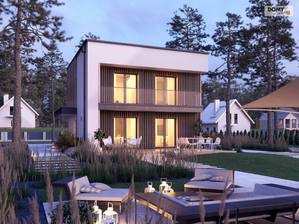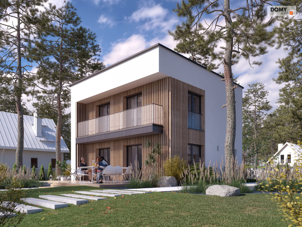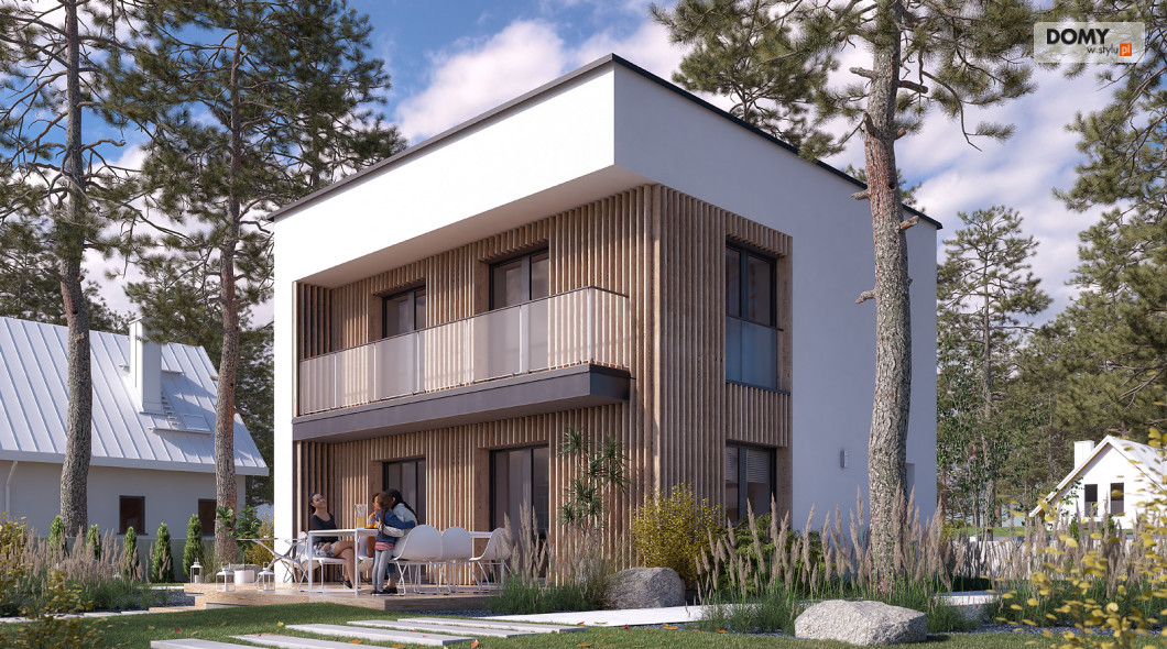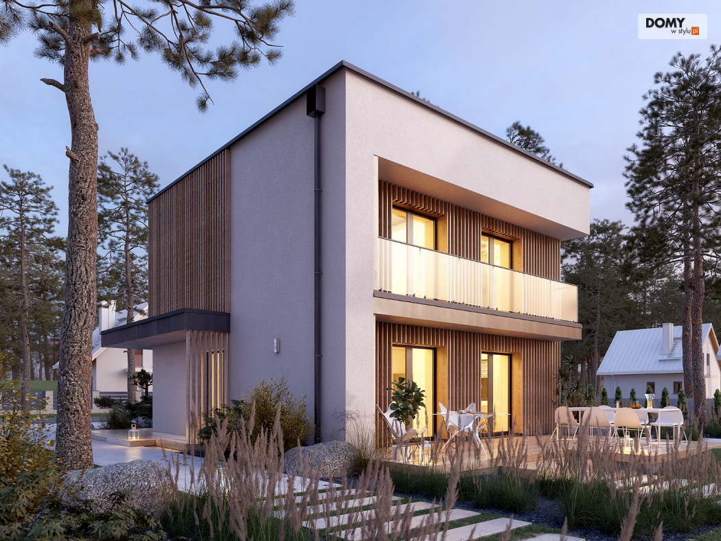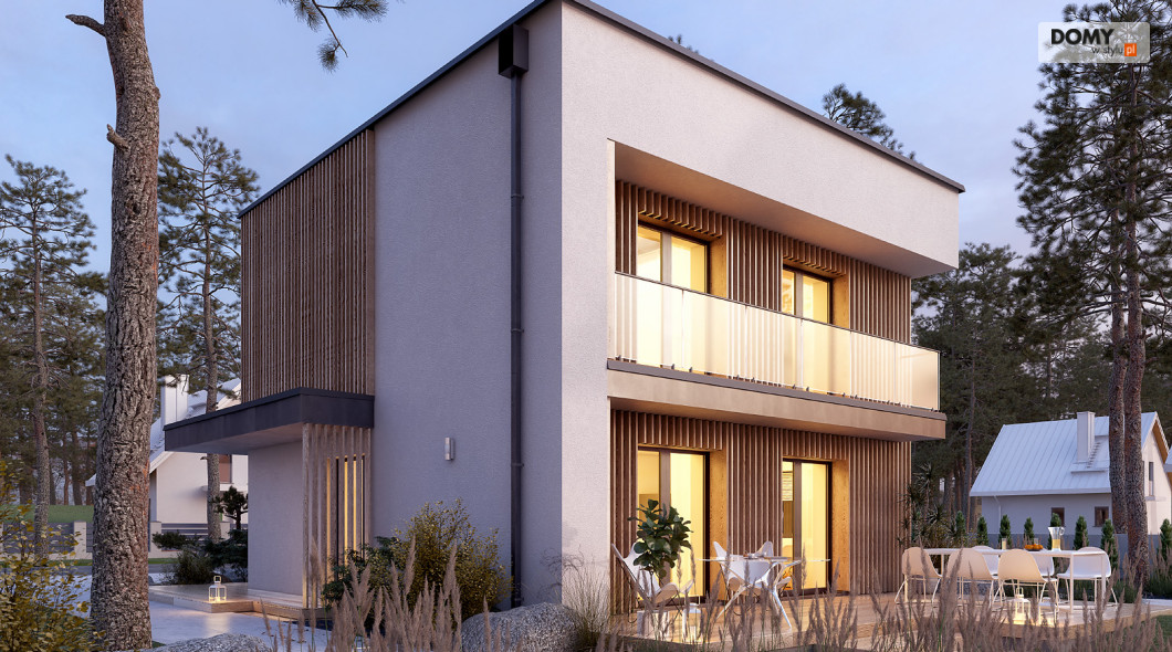 Lopra 3 to nowoczesny projekt piętrowego domu, którego nieduża powierzchnia zabudowy poniżej 70 m2, umożliwia jego realizację bez pozwolenia na budowę. Prosta bryła budynku z płaskim dachem zyskuje na atrakcyjności, dzięki zastosowaniu różnorodności materiałów wykończeniowych. Układ funkcjonalny w projekcie został podzielony pomiędzy dwie kondygnacje. Strefa dzienna została zaprojektowana na parterze i składa się z salonu, jadalni oraz kuchni. Wysokie przeszklenia w części dziennej dobrze doświetlają wnętrze oraz łączą je ze strefą wypoczynkową na tarasie. W kuchni zaprojektowano długi blat roboczy oraz półwysep z barkiem śniadaniowym. Strefa nocna na piętrze składa się z dwóch sypialni oraz łazienki. Obie sypialnie mają dostęp do wspólnego balkonu od strony ogrodu, który stanowi jednocześnie zadaszenie tarasu na parterze.