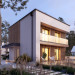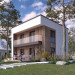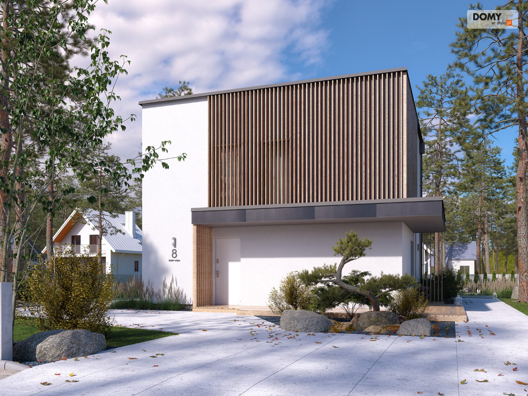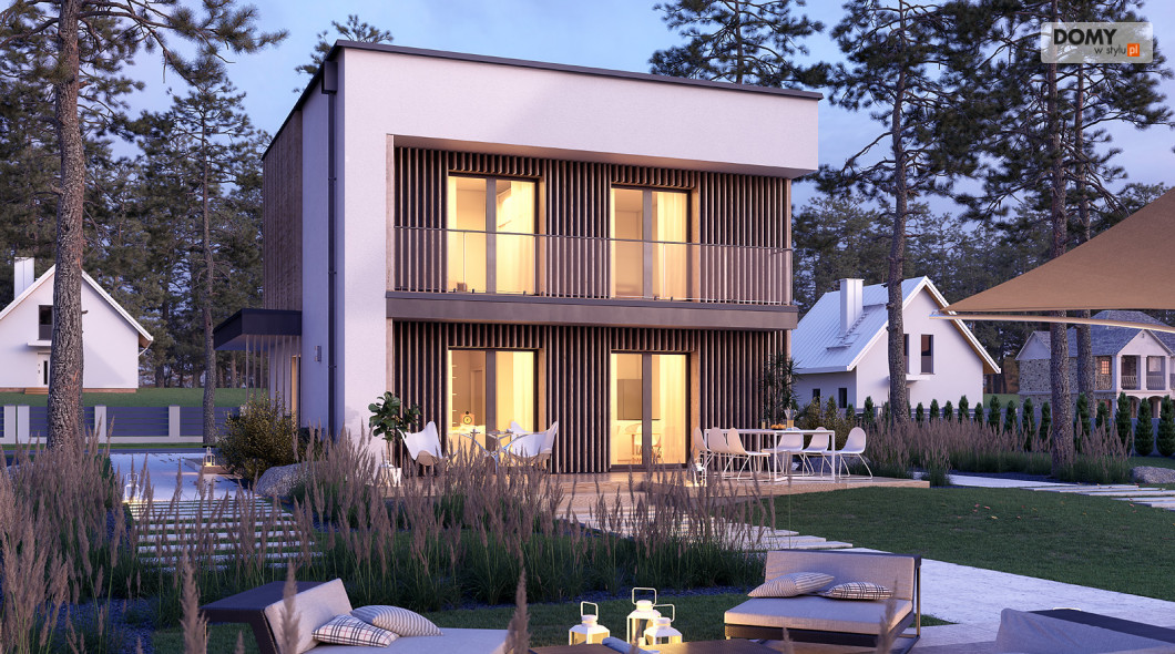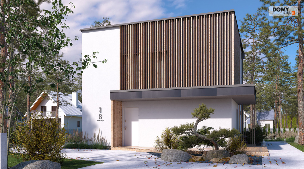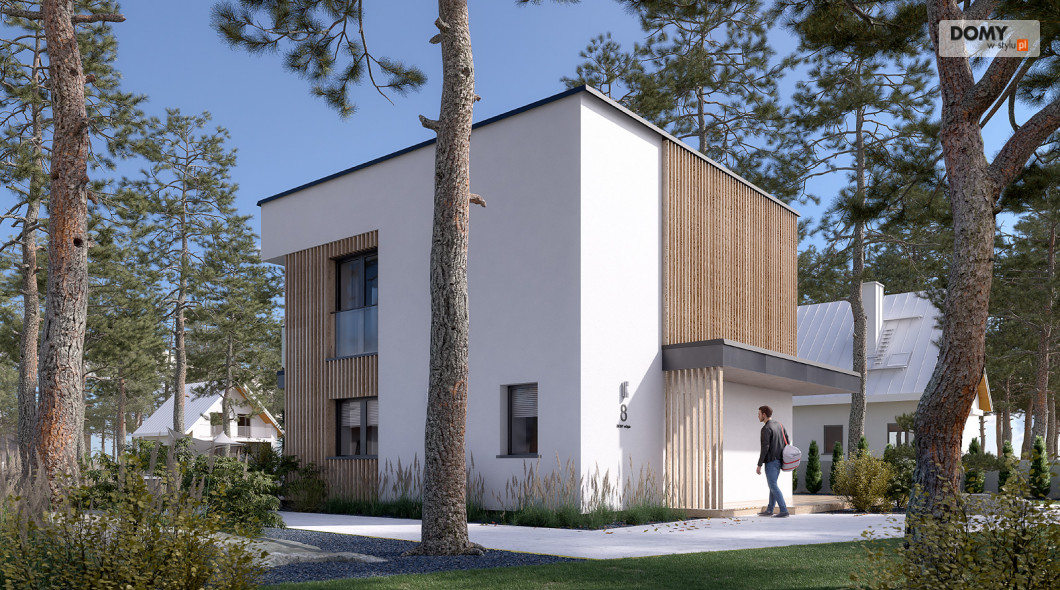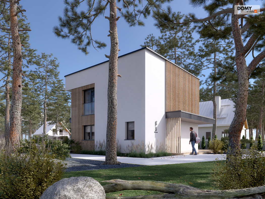 Lopra 3 to nowoczesny projekt piętrowego domu, którego nieduża powierzchnia zabudowy poniżej 70 m2, umożliwia jego realizację bez pozwolenia na budowę. Prosta bryła budynku z płaskim dachem zyskuje na atrakcyjności, dzięki zastosowaniu różnorodności materiałów wykończeniowych. Układ funkcjonalny w projekcie został podzielony pomiędzy dwie kondygnacje. Strefa dzienna została zaprojektowana na parterze i składa się z salonu, jadalni oraz kuchni. Wysokie przeszklenia w części dziennej dobrze doświetlają wnętrze oraz łączą je ze strefą wypoczynkową na tarasie. W kuchni zaprojektowano długi blat roboczy oraz półwysep z barkiem śniadaniowym. Strefa nocna na piętrze składa się z dwóch sypialni oraz łazienki. Obie sypialnie mają dostęp do wspólnego balkonu od strony ogrodu, który stanowi jednocześnie zadaszenie tarasu na parterze.