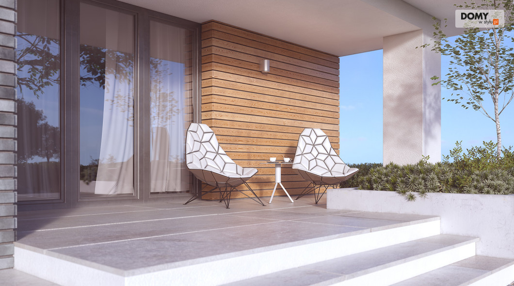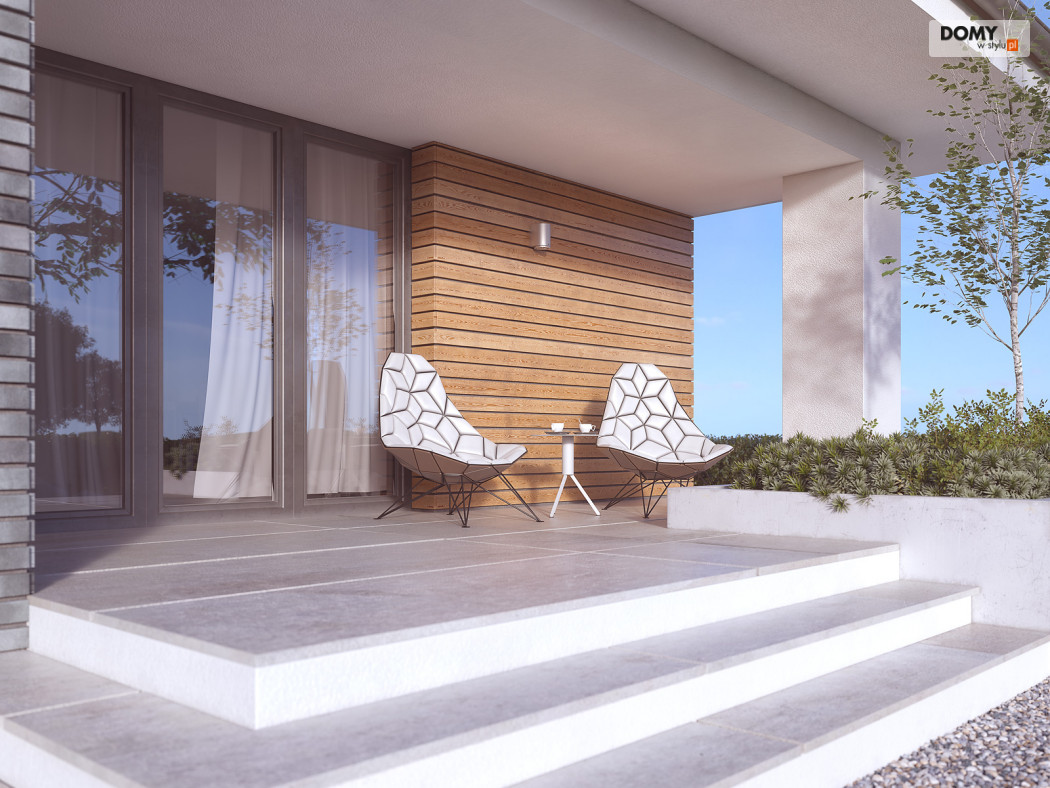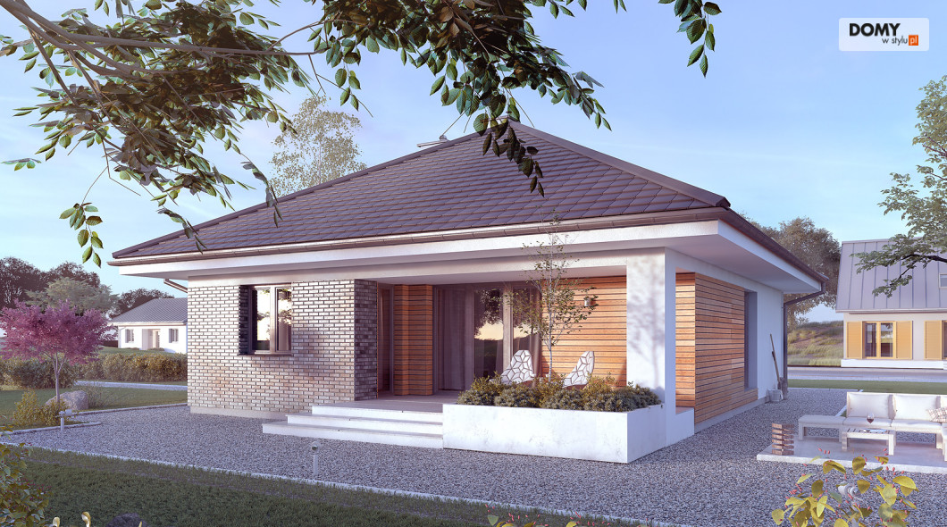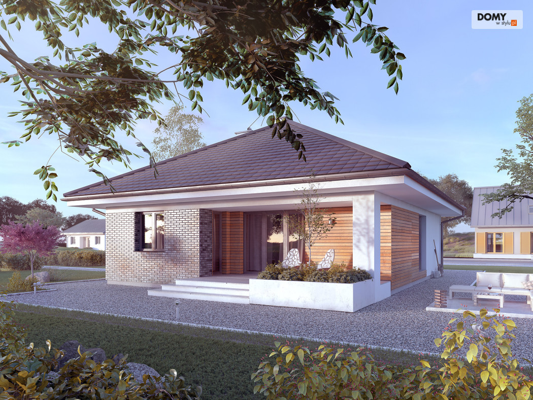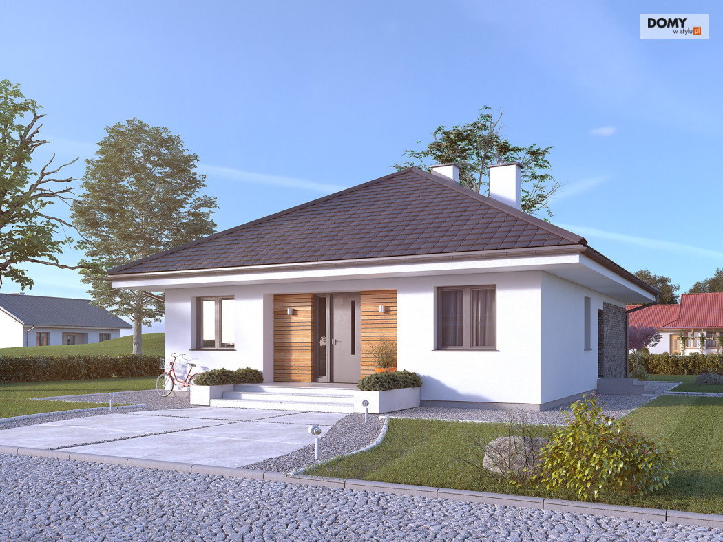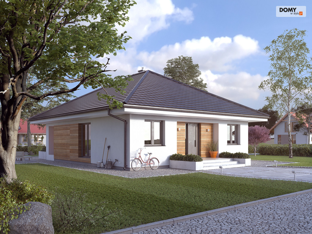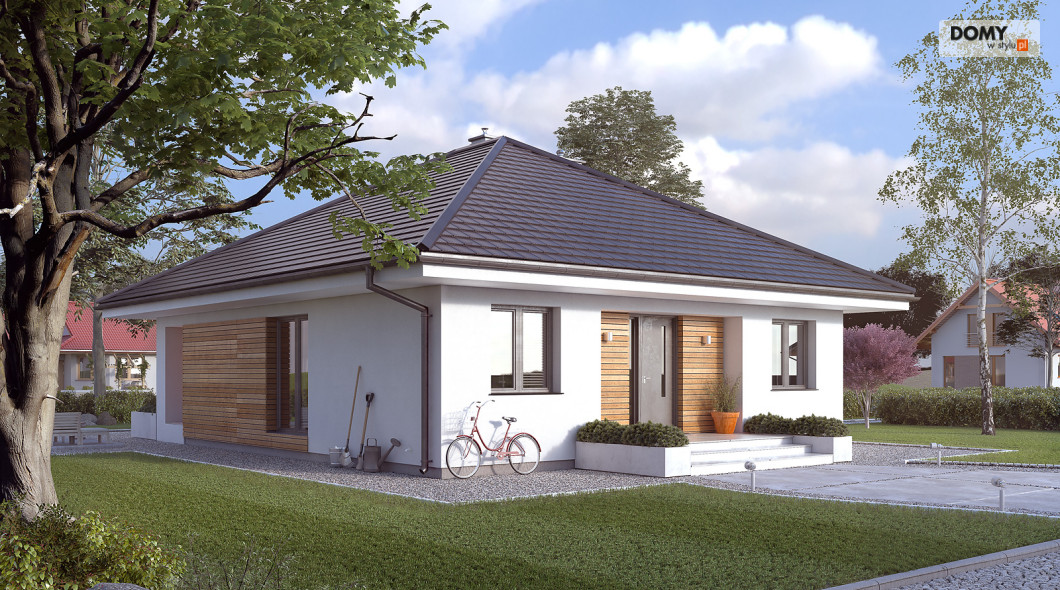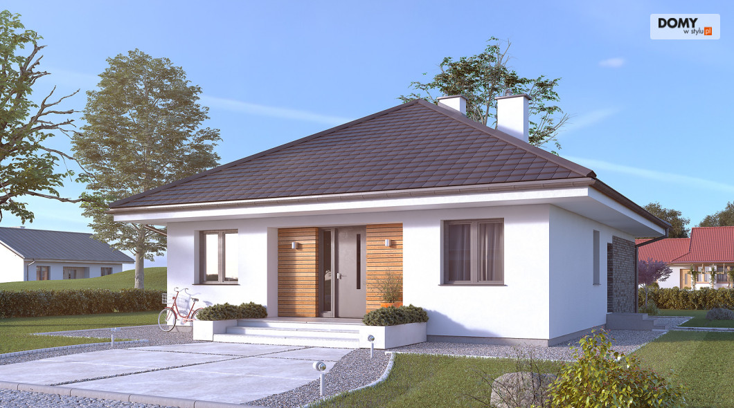 Elka 4 to projekt domu parterowego o prostej bryle. Mimo niewielkiej powierzchni użytkowej, projekt jest bardzo funkcjonalny. Strefę dzienną tworzy salon z kuchnią, spiżarnią i jadalnią, który jest otwarty na ogród poprzez duże przeszklenie. Strefa nocna to dwie sypialnie. Dodatkowo na parterze znajduje się ogólnodostępna łazienka oraz kotłownia. Praktycznym rozwiązaniem jest także mała garderoba przy wiatrołapie.