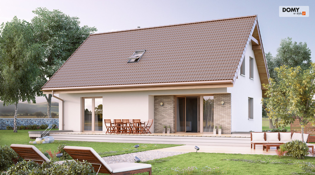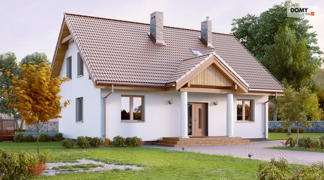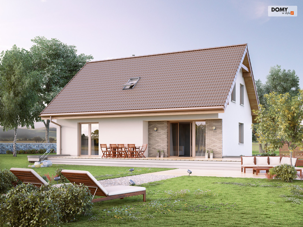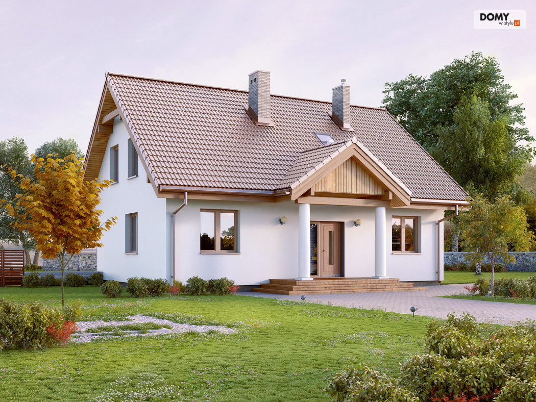 Tradycyjny dom mieszkalny. Ponadczasowa architektura domu nawiązująca do dobrych klasycznych wzorców polskiego domu mieszkalnego. Atutami projektu są przestronne wnętrza z dodatkową sypialnia i łazienką na parterze oraz trzy wygodne sypialnie na poddaszu. Pod schodami zaprojektowano pomieszczenie gospodarcze-spiżarnię.