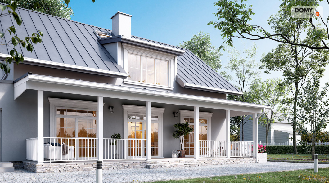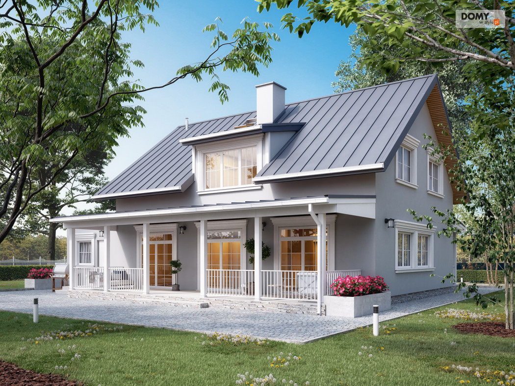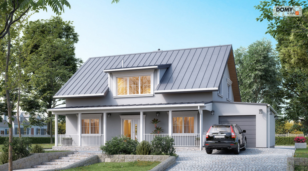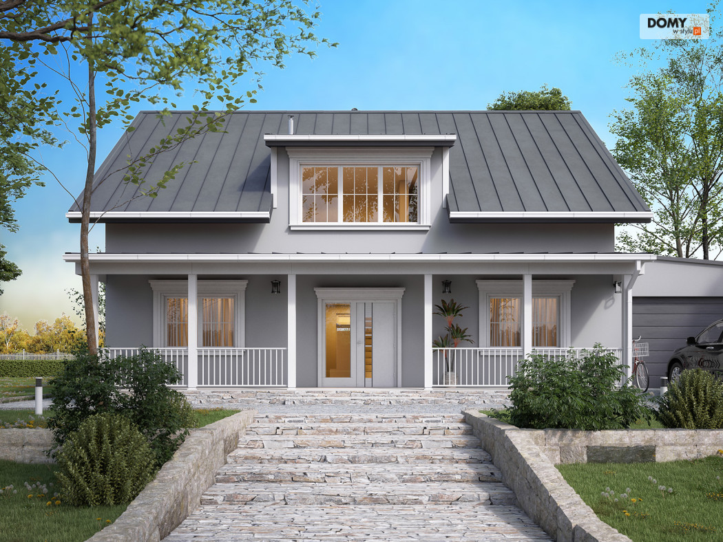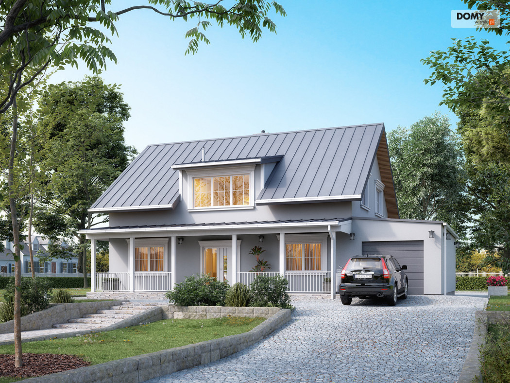 Jagodowy 2 dr-T to projekt domu z użytkowym poddaszem i jednostanowiskowym garażem. Prosta bryła budynku została przykryta dwuspadowym dachem pokrytym blachą na rąbek stojący. Zestawienie jasnej elewacji z szarym dachem oraz stolarką ze szprosami nadaje budynkowi niezwykłego uroku i klasy. Niewątpliwym atutem projektu jest zadaszona weranda, znajdująca się zarówno od frontu jak i ogrodu. Część dzienną domu stanowi otwarta przestrzeń. Składają się na nią kuchnia, jadalnia oraz salon z kominkiem. Na parterze zaprojektowano także dodatkową sypialnię oraz sąsiadującą z nią łazienkę. Poddasze to azyl jego mieszkańców. Zaprojektowano tu trzy wygodne sypialnie oraz rodzinną łazienkę. Projekt z całą pewnością zaspokoi potrzeby 4 -osobowej rodziny.