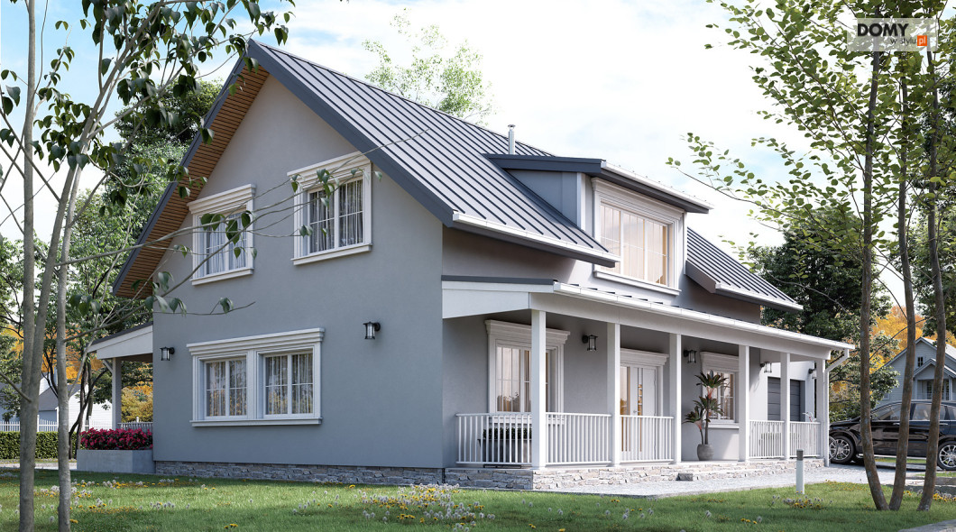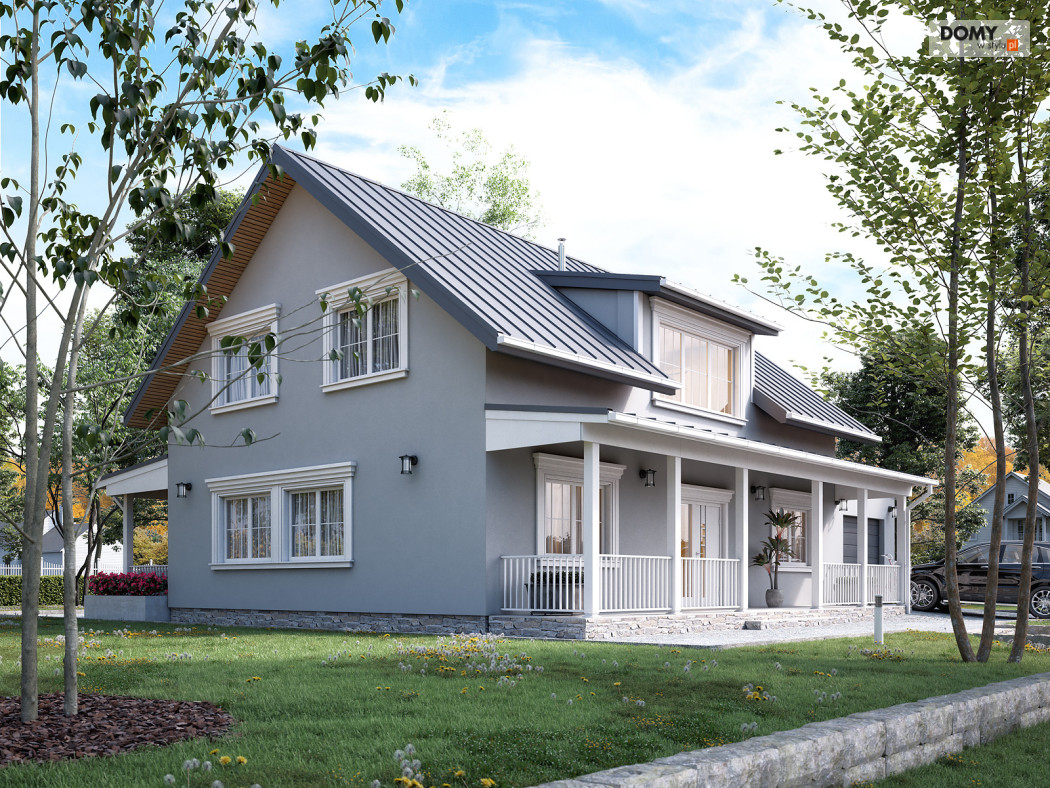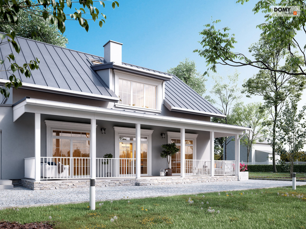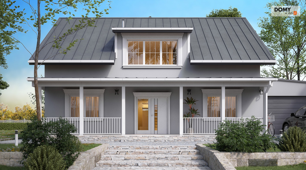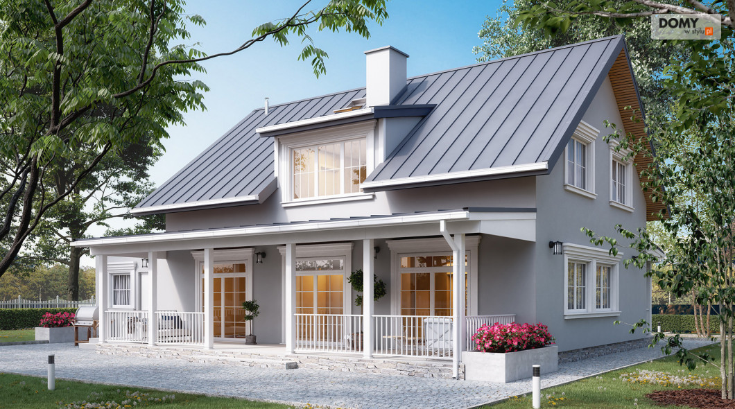 Jagodowy 2 dr-T to projekt domu z użytkowym poddaszem i jednostanowiskowym garażem. Prosta bryła budynku została przykryta dwuspadowym dachem pokrytym blachą na rąbek stojący. Zestawienie jasnej elewacji z szarym dachem oraz stolarką ze szprosami nadaje budynkowi niezwykłego uroku i klasy. Niewątpliwym atutem projektu jest zadaszona weranda, znajdująca się zarówno od frontu jak i ogrodu. Część dzienną domu stanowi otwarta przestrzeń. Składają się na nią kuchnia, jadalnia oraz salon z kominkiem. Na parterze zaprojektowano także dodatkową sypialnię oraz sąsiadującą z nią łazienkę. Poddasze to azyl jego mieszkańców. Zaprojektowano tu trzy wygodne sypialnie oraz rodzinną łazienkę. Projekt z całą pewnością zaspokoi potrzeby 4 -osobowej rodziny.