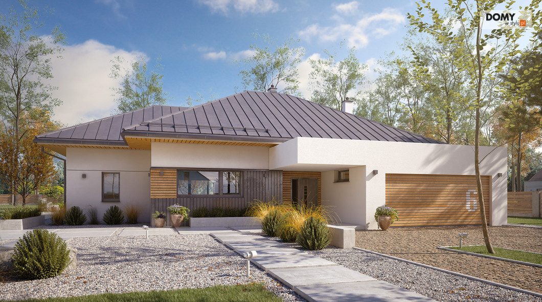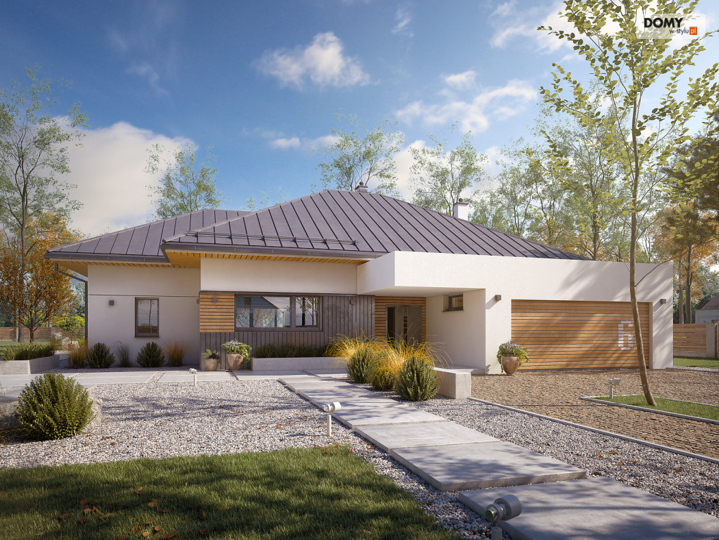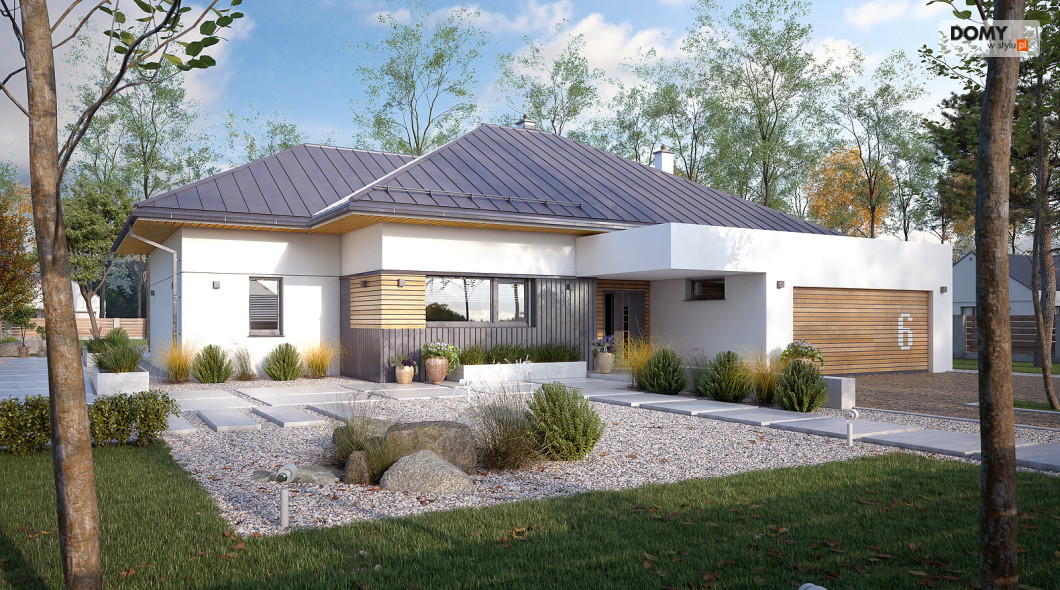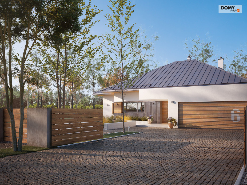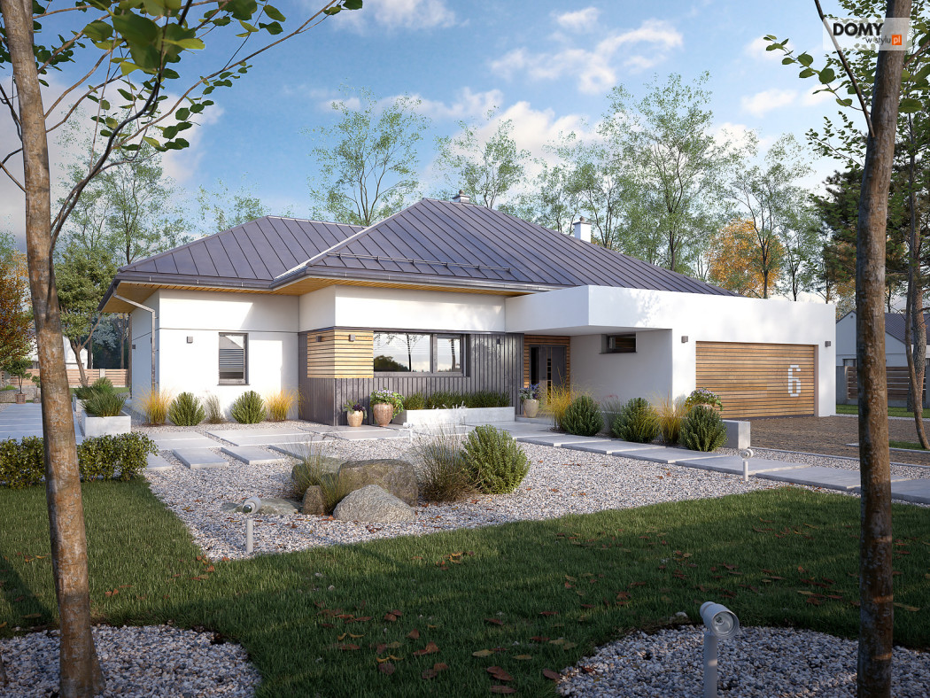 Projekt domu Cytrus 6 to projekt domu parterowego z dużymi możliwościami. Nowoczesny charakter bryły budynku powoduje, że na długo zapada w pamięć. Ten projekt domu jest wręcz stworzony dla 5-6cioosobowej rodziny. Na szczególną uwagę zasługuje podział części nocnej w tym projekcie. Główna sypialnia rodziców została zaprojektowana w oddzielnej części domu niż pozostałe 3 sypialnie. Dzięki takiemu rozwiązaniu, każdy z mieszkańców domu, może cieszyć się ciszą i spokojem. Piękny przestronny salon z miejscem na duży wspólny stół, w ciepłe dni można dodatkowo powiększyć otwierając drzwi na taras. Dla miłośników gotowania na pewno przypadnie do gustu kuchnia, która posiada niezliczoną liczbę blatów do kulinarnych eksperymentów. Szeroki dwustanowiskowy garaż pomieści również nie jeden rower lub kajak.