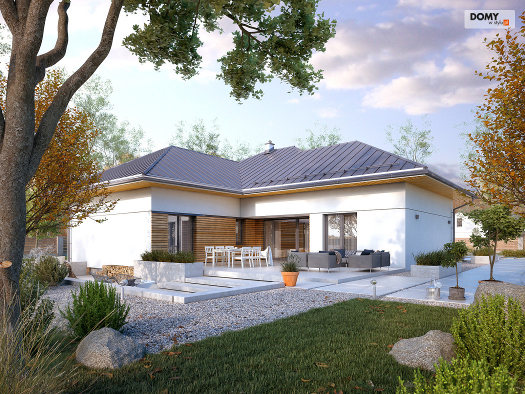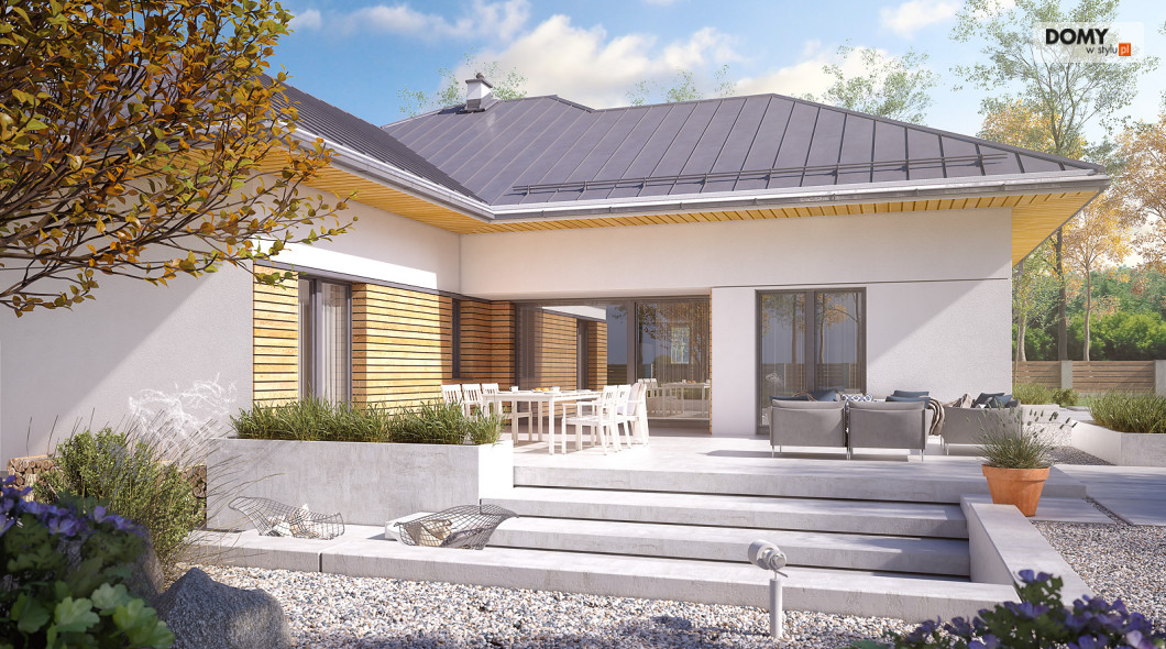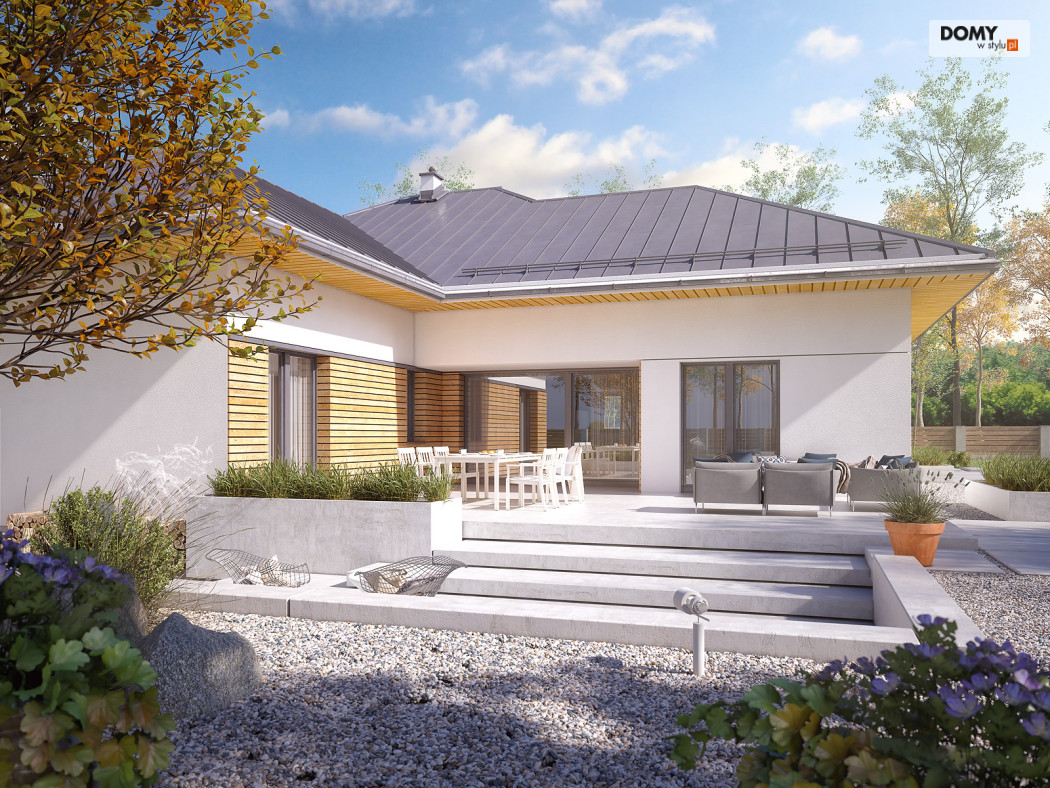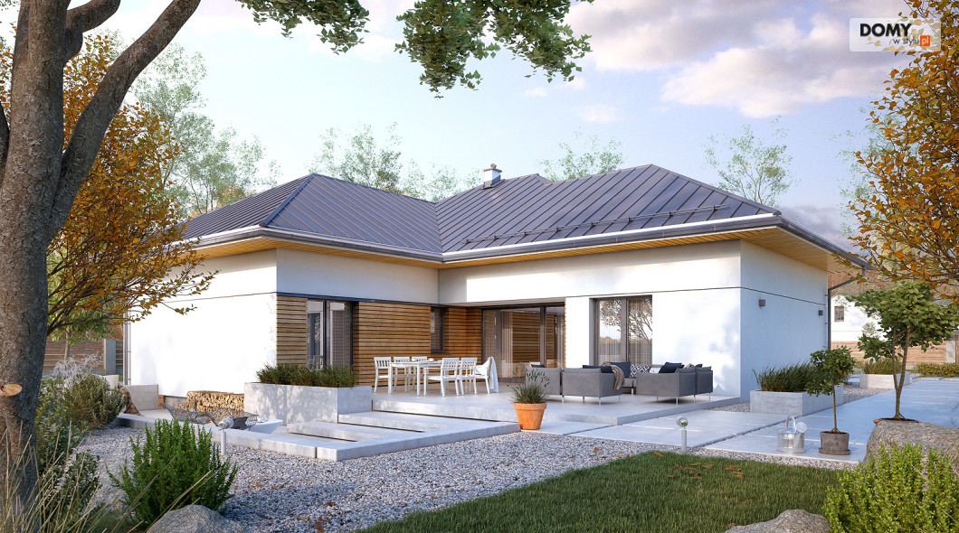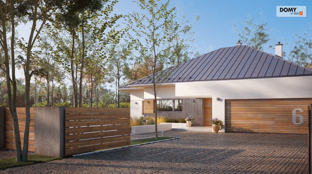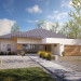 Projekt domu Cytrus 6 to projekt domu parterowego z dużymi możliwościami. Nowoczesny charakter bryły budynku powoduje, że na długo zapada w pamięć. Ten projekt domu jest wręcz stworzony dla 5-6cioosobowej rodziny. Na szczególną uwagę zasługuje podział części nocnej w tym projekcie. Główna sypialnia rodziców została zaprojektowana w oddzielnej części domu niż pozostałe 3 sypialnie. Dzięki takiemu rozwiązaniu, każdy z mieszkańców domu, może cieszyć się ciszą i spokojem. Piękny przestronny salon z miejscem na duży wspólny stół, w ciepłe dni można dodatkowo powiększyć otwierając drzwi na taras. Dla miłośników gotowania na pewno przypadnie do gustu kuchnia, która posiada niezliczoną liczbę blatów do kulinarnych eksperymentów. Szeroki dwustanowiskowy garaż pomieści również nie jeden rower lub kajak.