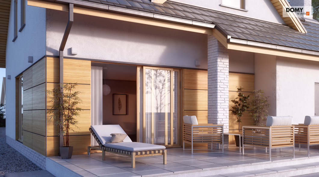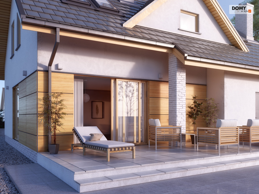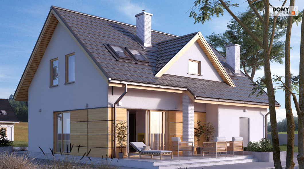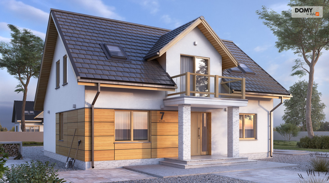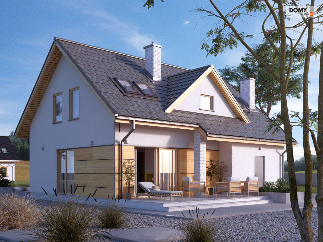 Jest to nowoczesny projekt domu parterowego z użytkowym poddaszem. Prosta bryła budynku została przykryta dwuspadowym dachem pokrytym dachówką ceramiczną. Na parterze znajduje się otwarta cześć dzienna, na którą składa się salon, jadalnia oraz otwarta kuchnia. Przy kuchni zaprojektowana także praktyczną spiżarnię. Na parterze znajduje się również sypialnia z sąsiadującą z nią łazienką oraz duże pomieszczenie gospodarcze z przeznaczeniem na kotłownię, które posiada oddzielne wyjście z zewnątrz budynku. Na poddaszu zaprojektowano trzy sypialnie oraz rodzinną łazienkę. Główna sypialnia gospodarzy posiada wyjście na balkon zlokalizowany nad wejściem głównym do budynku.