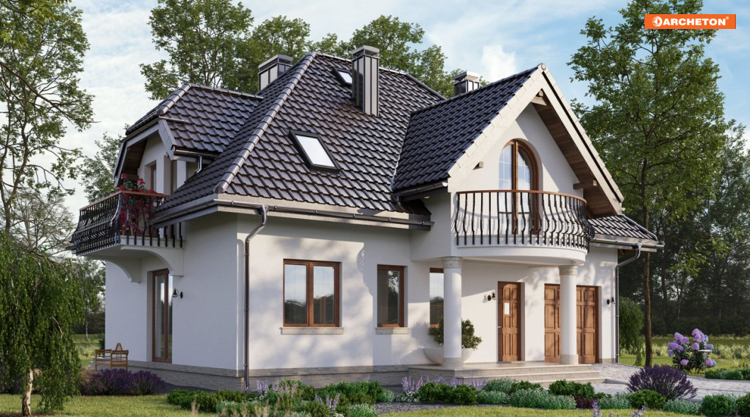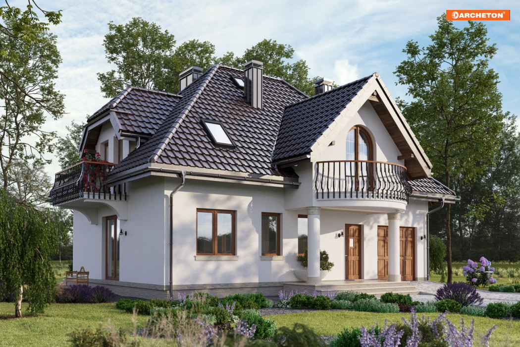 W projekcie domu Ślężan zastosowano rzadko spotykaną konstrukcję dachu czterospadowego, bardzo stromą, z krótką kalenicą równoległą do drogi dojazdowej. Bryłę rozrysowano na planie zwartego prostokąta o złotych proporcjach. Mieści się w niej dwupoziomowe mieszkanie oraz garaż z kotłownią dostępny z sieni. Jest to jedyne takie rozwiązanie z zakresu powierzchni użytkowej 120-130 m2, także ze względu na bardzo dekoracyjny, nieco historyzujący charakter architektury. Frontowy, symetrycznie umieszczony w elewacji podcień na kolumnach niesie wysuniętą lukarnę z owalnym balkonem. Prowadzi on przez sień połączoną z garażem, a dalej z dużą kotłownią, do sporego holu, z którego dostępna jest część dzienna oraz schody na poddasze. Salon i kuchnia są oddzielone ścianami nośnymi ale konstrukcja pozwala dowolnie, indywidualnie ustalić stopień otwarcia przestrzeni. Wszystkie pięć sypialni na poddaszu to pokoje doświetlone oknami dachowymi oraz drzwiami balkonów w lukarnach dachu. Pomieszczenia w projekcie domu Ślężan nie są duże ale ustawne i zapewniają wygodę sześciorgu mieszkańcom.