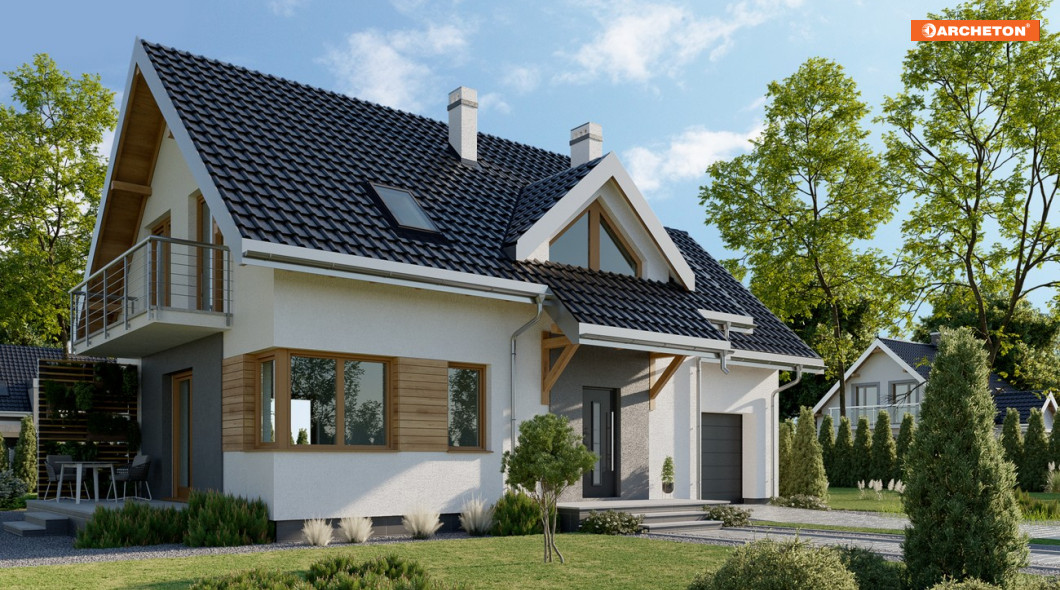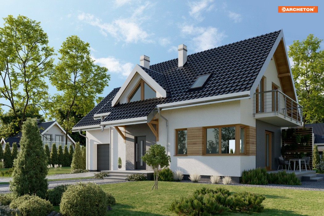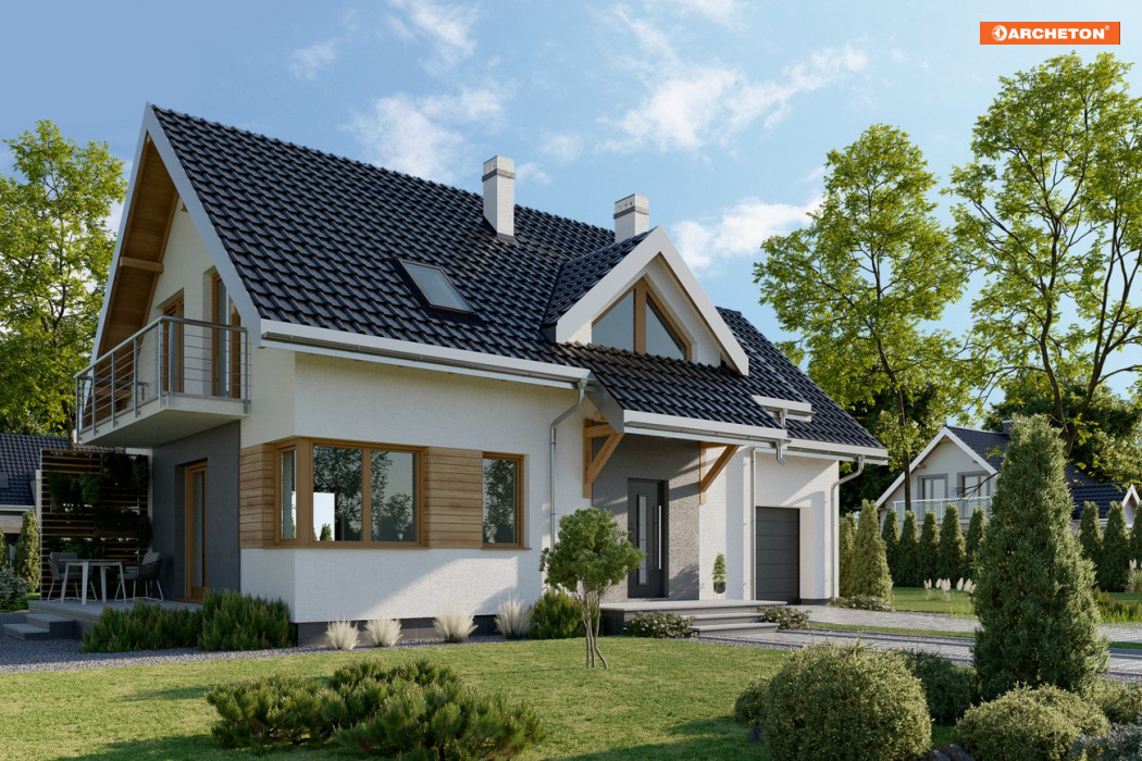 Wszystkie wersje Maliny mają zbliżony rozkład i wielkość pomieszczeń. Sień łącząca mieszkanie z częścią gospodarczą prowadzi przez mały hol z łazienką do otwartej kuchni i salonu. Bardzo efektowne jest wejście na schody ze spocznikiem wprost z pokoju dziennego przy kominku. Jego trzony zblokowano z kominem kotłowni, dostępnej z garażu, ale znajdującej się w obrysie głównej bryły. Poddasze zagospodarowano na cztery sypialnie z dużą łazienką. Projekt domu Malina prezentuje tradycyjne rozwiązania plastyczne z balkonami i nowoczesnym detalem narożnego okna w kuchni.