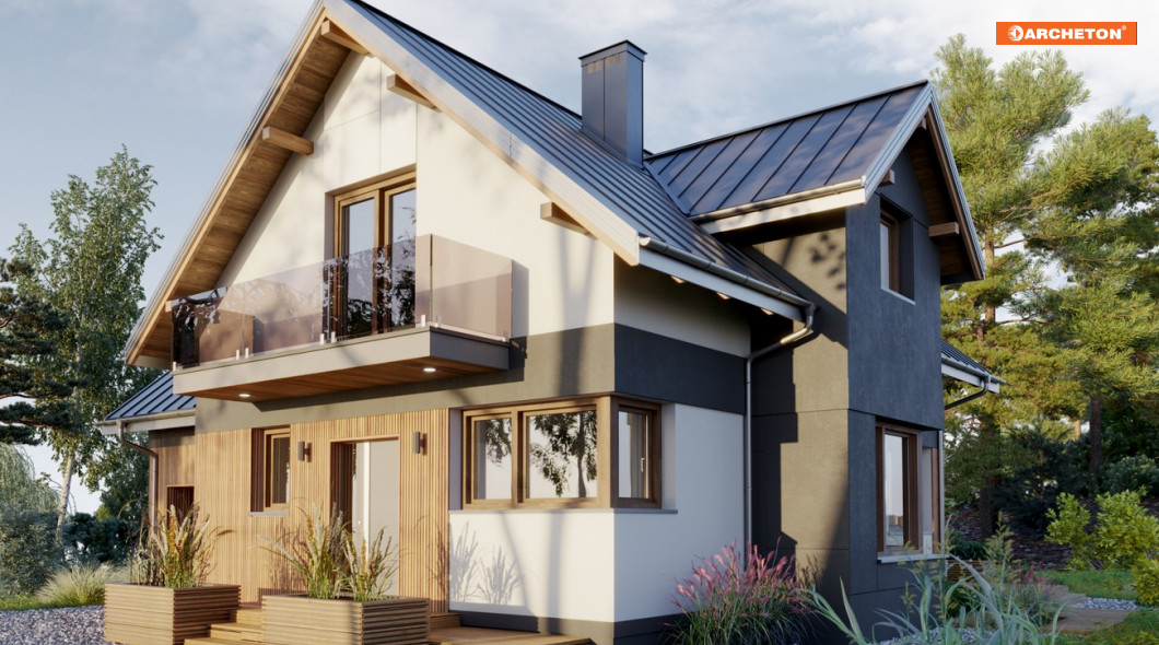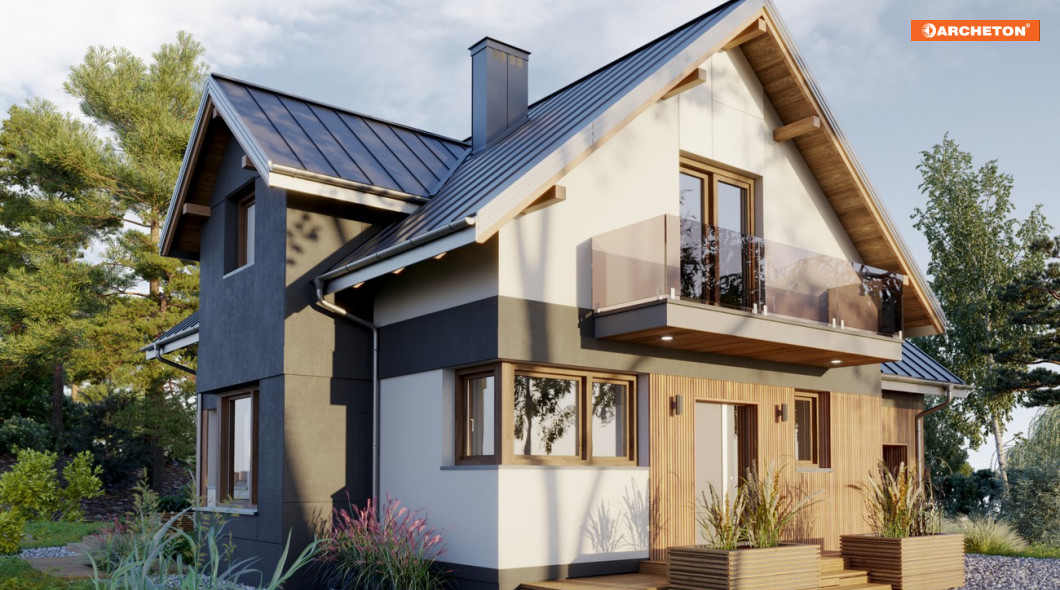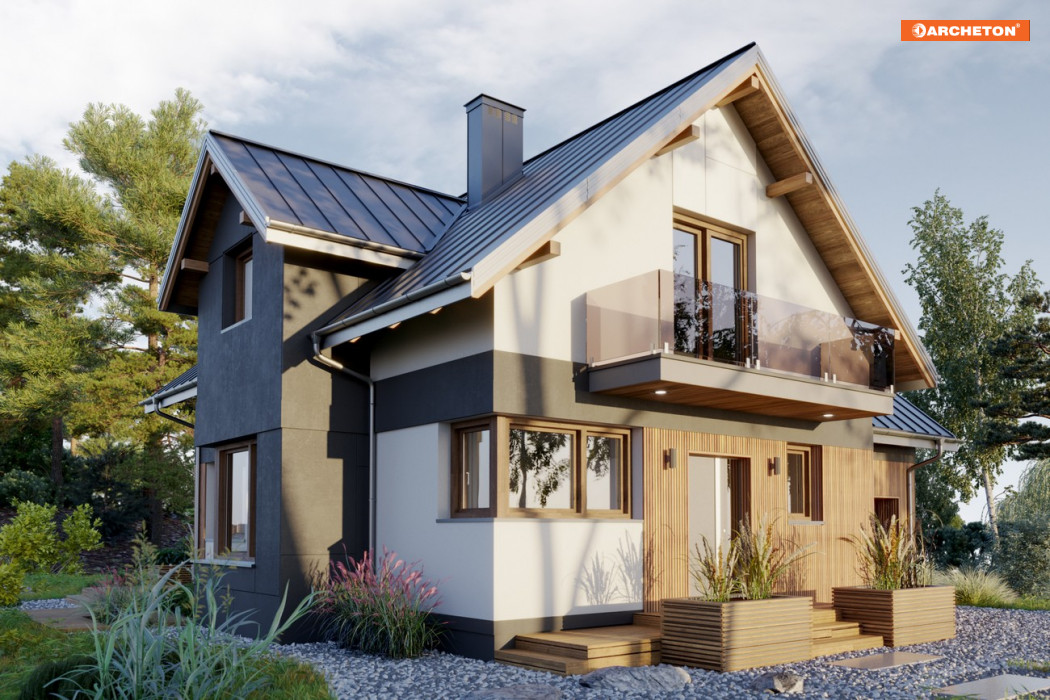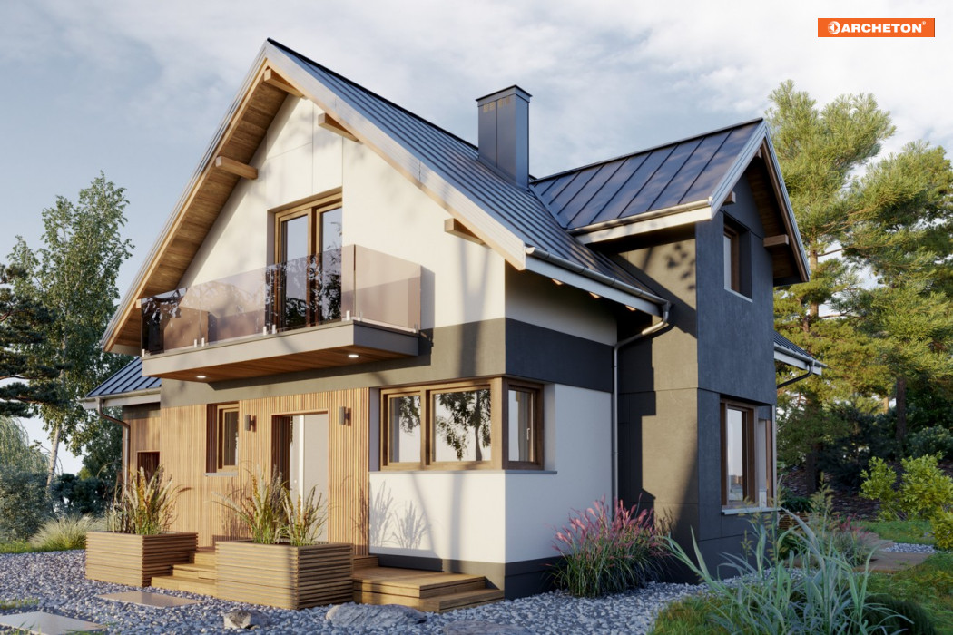 Projekt domu Koliba Astro jest jedną z propozycji domu parterowego z użytkowym poddaszem i z dostawionym garażem, o powierzchni 120-130m2, o bryle zbudowanej na planie litery T. Inaczej niż w zbliżonej programem i powierzchnią ale podpiwniczonej Sybilli, kalenice dwuspadowych dachów nad ramionami rzutu są prostopadłe. Przyziemie części gospodarczej zajmuje garaż i kotłownia, połączone z mieszkaniem przejściem pod schodami. Tak jak w podobnej Kai, front wyższej części mieszkalnej z wyrazistym szczytem dachu i wejściem głównym osłoniętym balkonem, wysuwa się do przodu, a układ ten podkreśla prosty, dwukondygnacyjny ryzalit z jadalnią w ścianie bocznej i z lukarną doświetlającą łazienkę poddasza. Parter mieści kuchnię, przestronny salon i łazienkę. Łączy je jadalnia, osłonięta od holu wygodną wnęką na szafę. Otwarty układ powiększa przestrzeń, a całe wnętrze strefy dziennej pełne jest słońca o każdej porze dnia, także dzięki narożnym oknom, które wyróżniają projekt domu Koliba Astro w Rodzinie Koliby. Poddasze we wszystkich wariantach jest dwupoziomowe, z czterema sypialniami, z których główną wyposażono w garderobę i usytuowano od frontu.
