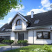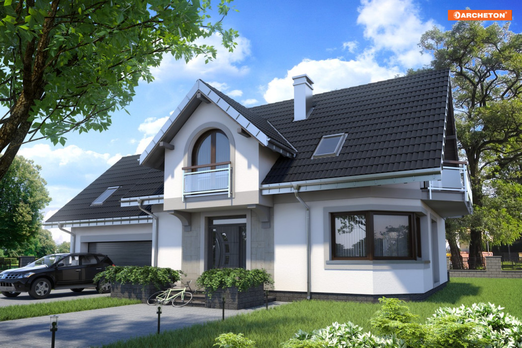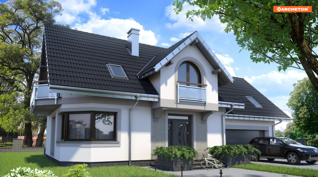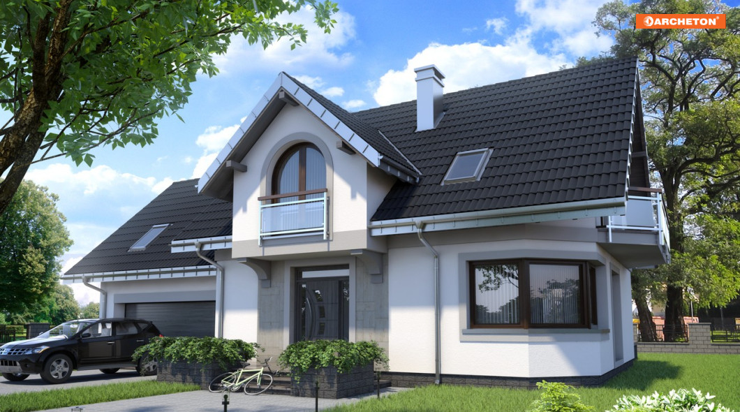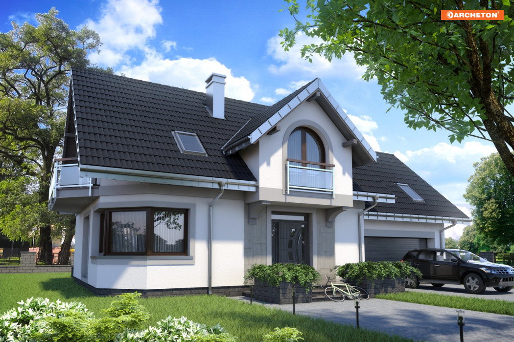 Heladia to projekt jednego z największych, w grupie średniej wielkości, domów parterowych z użytkowym poddaszem. Charakterystyczny element ściętego, przeszklonego narożnika okna kuchennego i dwustanowiskowy garaż z dużą kotłownią łączą w nim różne rozwiązania wariantów rodziny Heliotropa. Podobnie malownicza, choć nieco bardziej zwarta bryła zamyka komfortowe mieszkanie oraz dostępną z jego sieni część gospodarczą zaznaczoną osobnym obrysem i niższym dachem. Otwarty parter proponuje w Heladii rozbudowany pokój dzienny z możliwością całkowitego wydzielenia części kominkowej powiększonej ryzalitem. Wyjątkowo duża kuchnia może zostać zarówno otwarta jak i w pełni zamknięta od strony salonu. Na drugiej kondygnacji, pod dwuspadowymi dachami są cztery pokoje, łazienka oraz, na osobnym poziomie nad garażem, główna sypialnia z własną łazienką i pralnia. Sylwetkę cieniują balkony w elewacjach bocznych i dwie duże lukarny: od frontu i ogrodu. Uwagę w projekcie domu Heladia przykuwa także reprezentacyjne wejście osłonięte wykuszem z półkolistymi drzwiami balkonowymi typu porte fenetre, a na tyłach posesji - wieloboczne przeszklenie w salonie.
