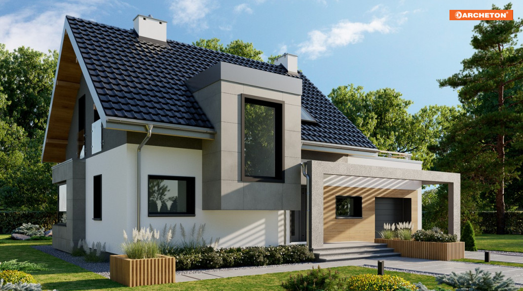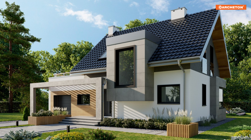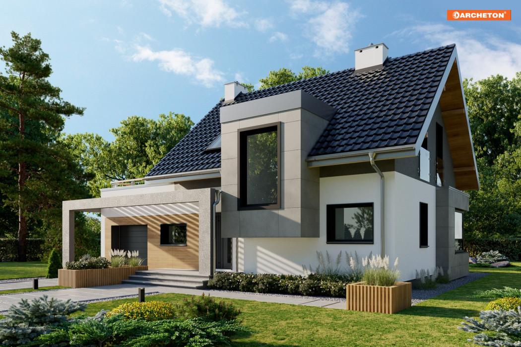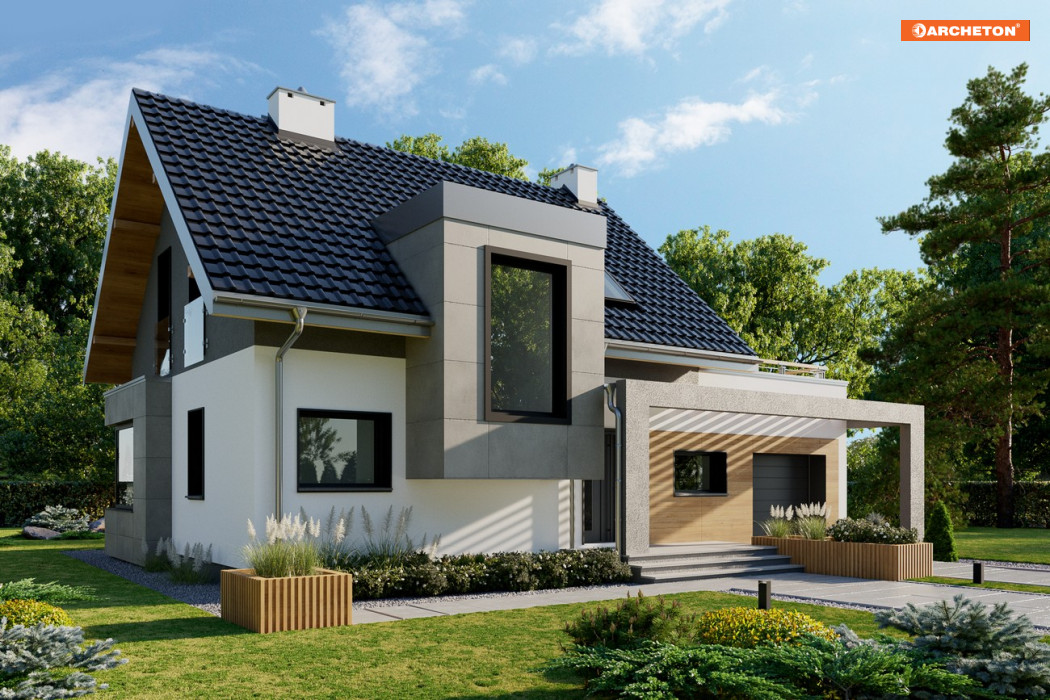 Projekt domu Lara jest pierwszym w ofercie Archetonu, w którym, przy stosunkowo niewielkiej powierzchni użytkowej, przewidziano tak obszerną strefę gospodarczą. Trakt garażu, zlicowany z bryłą główną i zwieńczony tarasem, ma aż 5m szerokości!