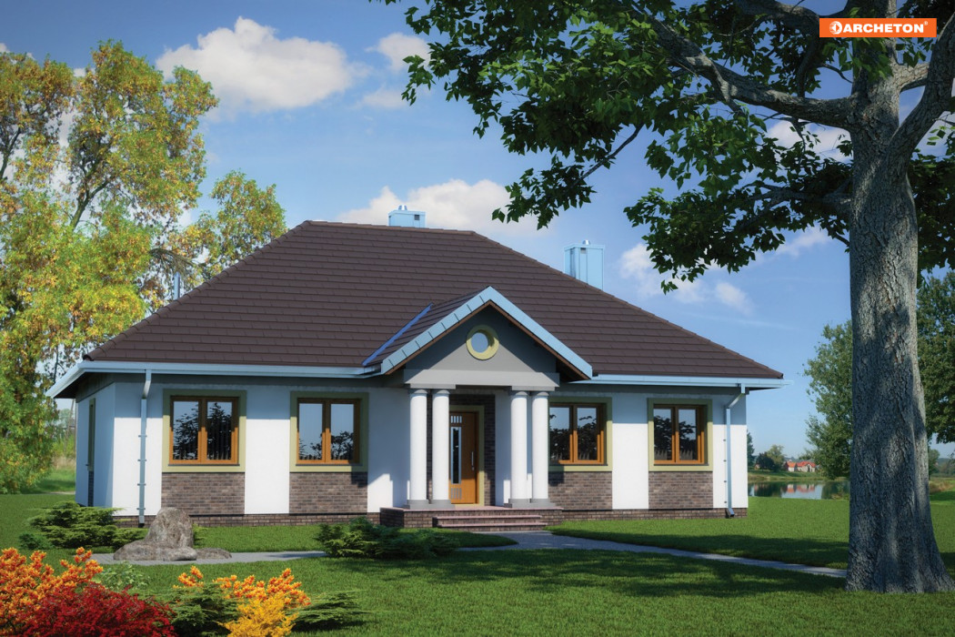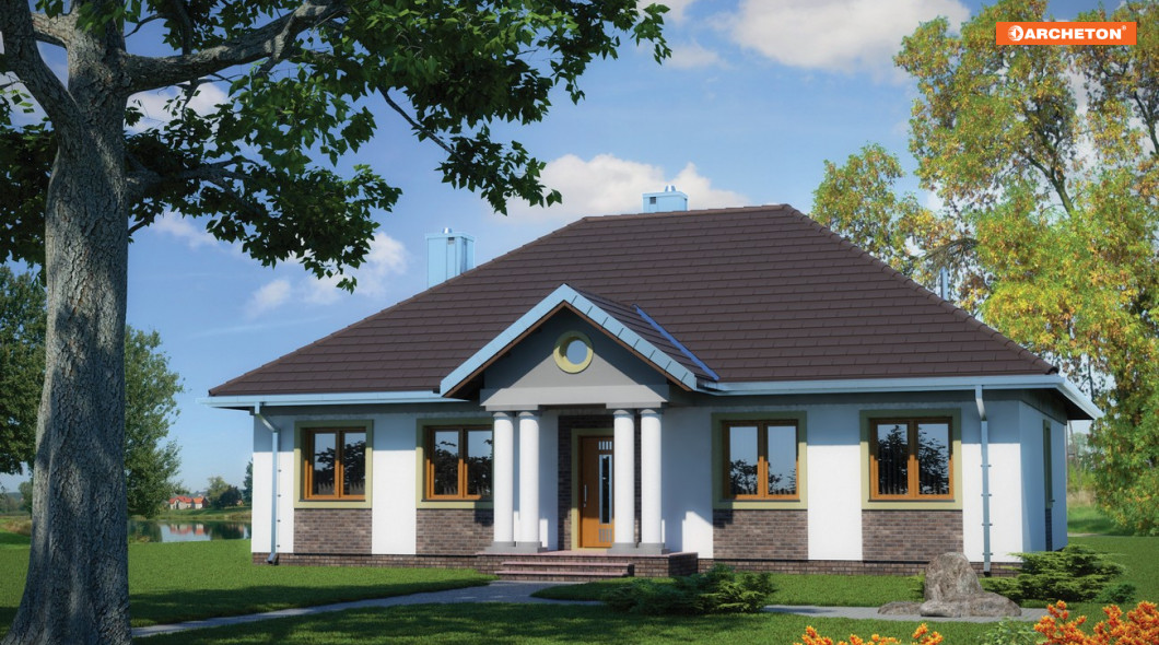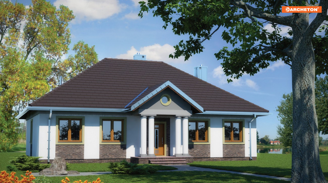 Architektura polskiego dworku nieustannie inspiruje tworzących projekty domów jednorodzinnych. Rzut na planie prostokąta jest energooszczędny, a nieużytkowa przestrzeń pod czterospadowym dachem w sposób naturalny (a więc najbardziej ekonomiczny!) izoluje od chłodów i od upału. Projekt domu Aleksandria Hera to większy z kilku parterowych wariantów rodziny Aleksandrii. Czerpią one wprost z historycznego pierwowzoru, oferując jednopoziomowe (za wyjątkiem wersji Tura) mieszkanie bez garażu o powierzchni 100-140m2. Tradycyjna bryła Aleksandrii o zbliżonych do autentycznych proporcjach zawiera, zamiast izb w amfiladowym układzie, przestronne, nowoczesne mieszkanie dla 4-5 osób. Część dzienna to otwarty salon z dużą kuchnią, do której przylega kotłownia (największa w rodzinie), spiżarnia i gościnna łazienka. Strefa nocna z czterema pokojami i z dużą łazienką dostępna jest z korytarza wyprowadzonego z narożnika pokoju dziennego. Projekt domu Aleksandria Hera proponuje współczesne duże okna bez podziałów , ale historyzujący charakter architektury dominuje, podkreślony od frontu i od ogrodu kolumnowymi portykami.