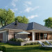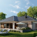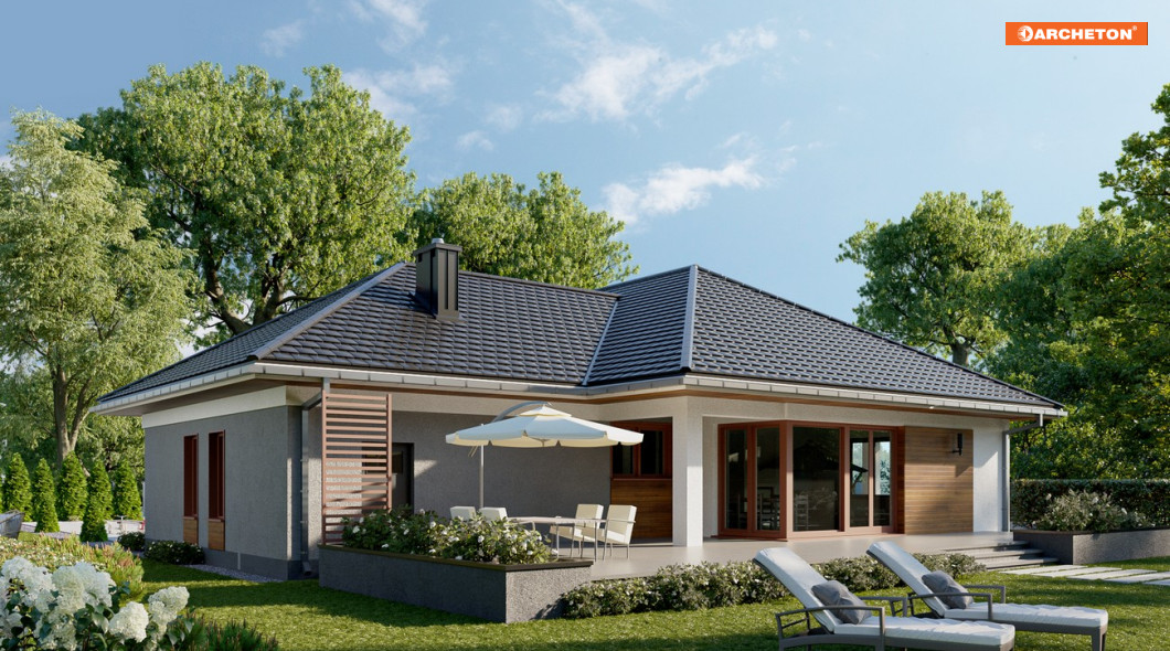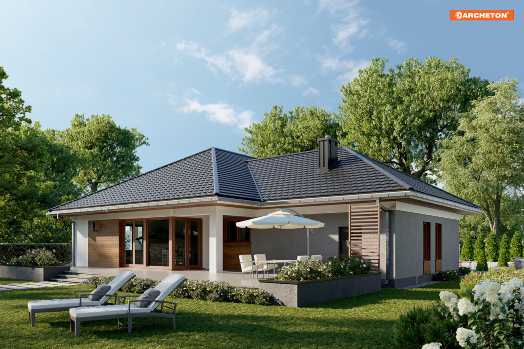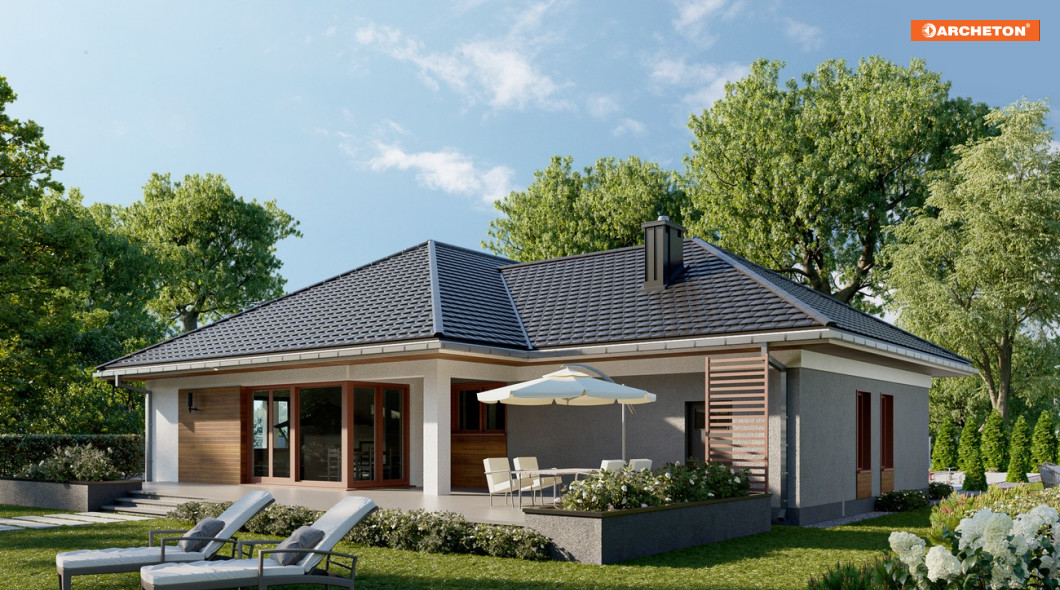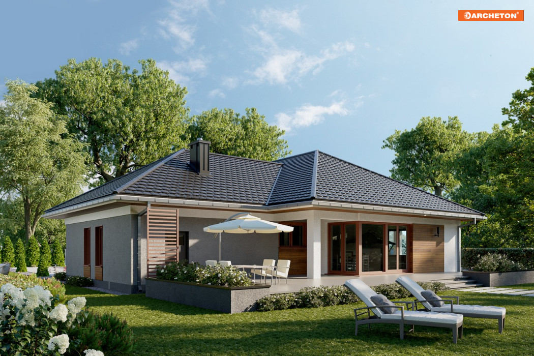 Projekt parterowego domu Kamelia ma bryłę zbudowaną na nieczęsto stosowanym planie krzyża. Połączenie frontowych ramion wykorzystano na wnękę wejściową rozdzielającą główne funkcje budynku. Skrzydło, na wprost wjazdu, zawiera jednostanowiskowy garaż z dużą kotłownią, pralnię przy sieni oraz łazienkę i spiżarnię przylegające do kuchni. Pozostałe trzy skrzydła zajmują pomieszczenia typowo mieszkalne. Położenie kuchni, jak i salonu na tyłach domu jest dość wyjątkowe, co, razem z rozbudowanym kształtem całego rzutu, tworzy niestandardowy rozkład pomieszczeń, w którym część nocna, z trzema sypialniami i z dużą łazienką, skierowana jest na front posesji. Prywatność zapewnia im zaciszny przedpokój wychodzący z głównego holu. Przestronny, otwarty pokój dzienny, z jadalnią przy kuchni, powiększa taras, dzięki szerokiemu narożnemu przeszkleniu skierowanemu na ogród. Projekt domu Kamelia ma czterospadowe, przenikające się dachy oraz proste rozwiązania elewacji. Mimo to bryła jest malownicza, o czym przesądza już sama koncepcja rozbudowanego rzutu oraz podcienie na słupach nad każdym z trzech wyjść.