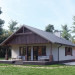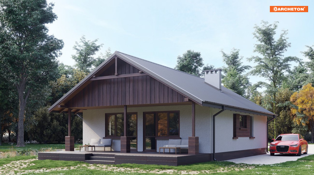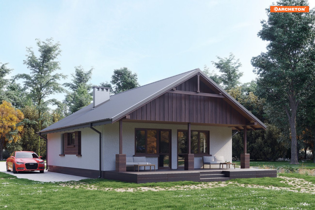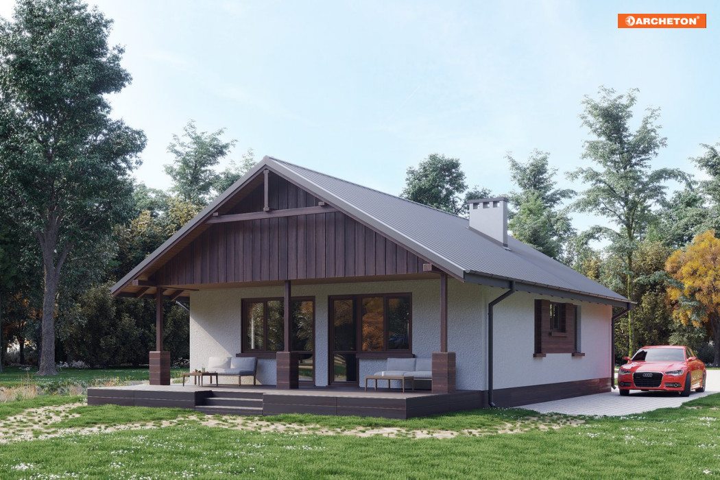 Bryłę budynku stanowi prostopadłościan nakryty symetrycznym, dwuspadowym dachem o kącie nachylenia połaci 30°. Bryłę urozmaicają zadaszony taras i daszek nad wejściem.