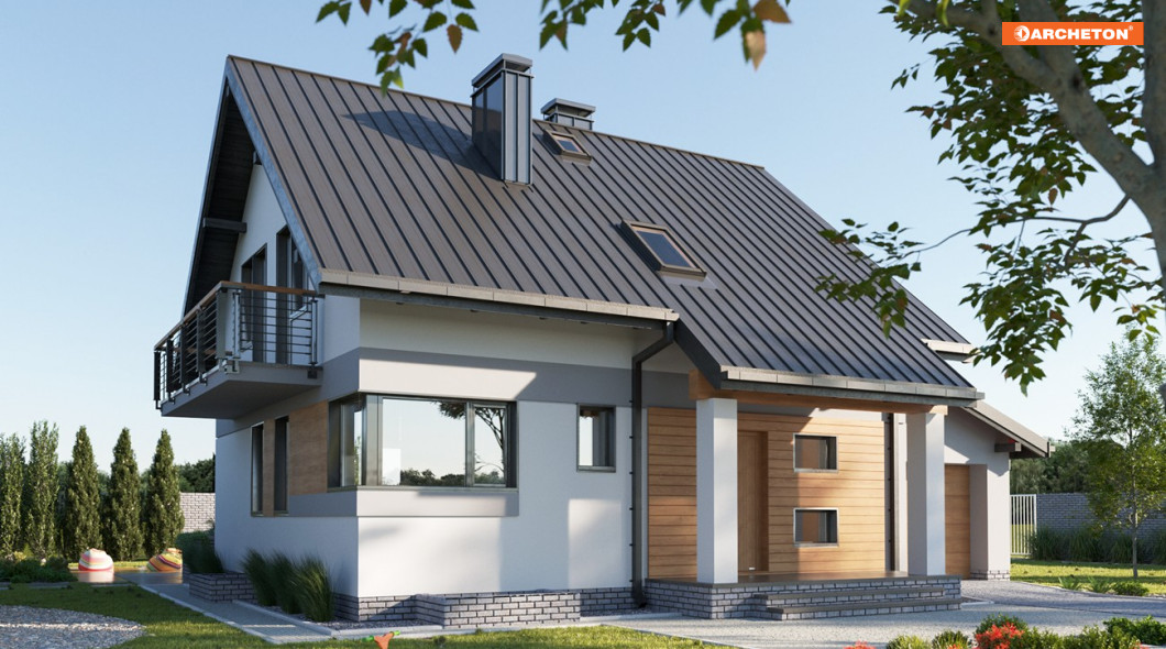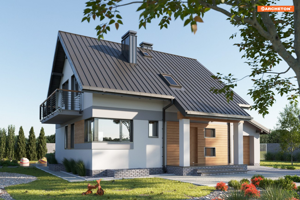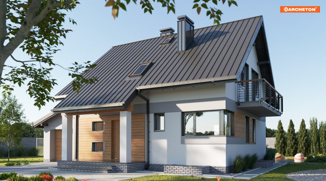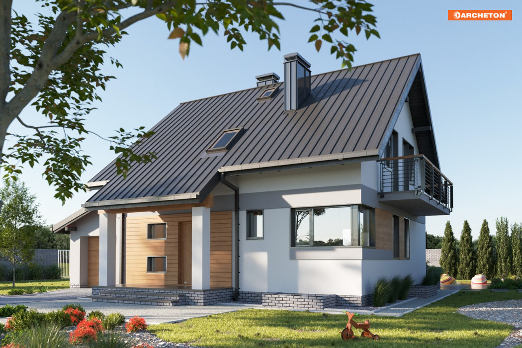 Tylko w rodzinie Chabra znaleźć można projekty domów z użytkowym poddaszem z zakresu powierzchni 100-110m2, z dobudowanym garażem, z dodatkowym pokojem na parterze, a przy tym z częściowym lub całkowitym podpiwniczeniem. Projekt domu Chaber to najprostsza z pokrewnych wersji. We wszystkich, środkiem zwartego rzutu części mieszkalnej biegnie ściana nośna tworząc na parterze strefy: wejściową ze schodami i z otwartą kuchnią oraz ogrodową z dwoma pokojami. Taka konstrukcja dzieli również plan piwnicy z dużą kotłownią na dwie części, ułatwiając indywidualne ustalenie zasięgu kondygnacji podziemnej. Podobnie na poddaszu: ścianka pod kalenicą dwuspadowego dachu zamyka na połowach planu dwie większe sypialnie oraz komunikację z dużą łazienką i małym pokojem. Ten rygorystyczny układ symetrycznie komponuje ściany boczne i decyduje o możliwości lokalizacji garażu. Wymagając głębszego traktu znajduje się on w dobudowanej części przyziemia, przy ścianie bocznej bryły głównej i przekryty jest dachem pulpitowym. Projekt domu Chaber prezentuje prostą sylwetkę; urozmaica ją od frontu podcień na słupach, a od ogrodu - taras z szerokim wyjściem z salonu.