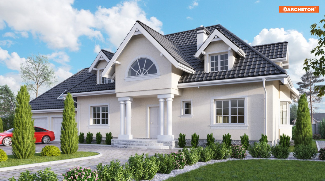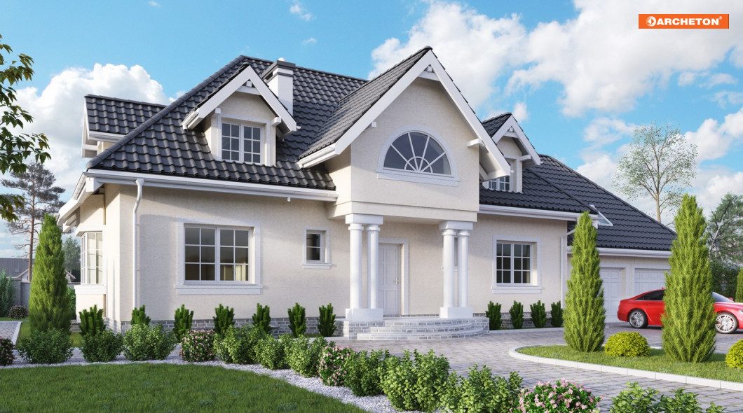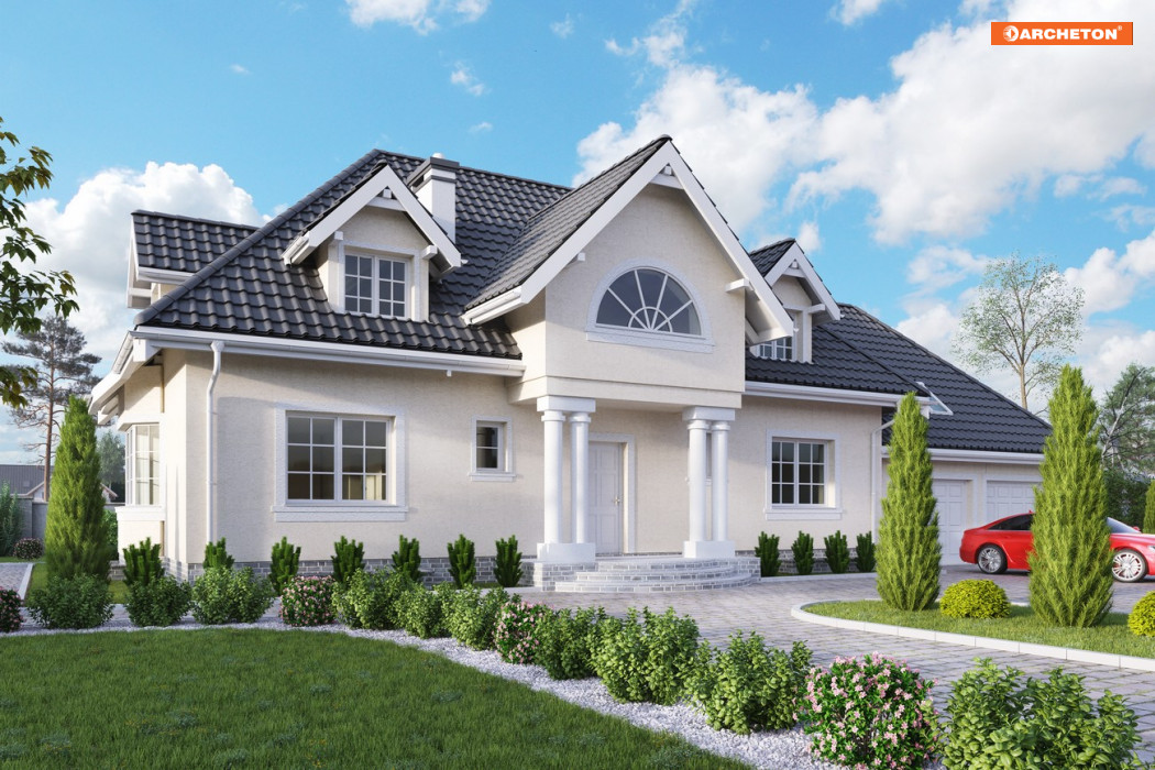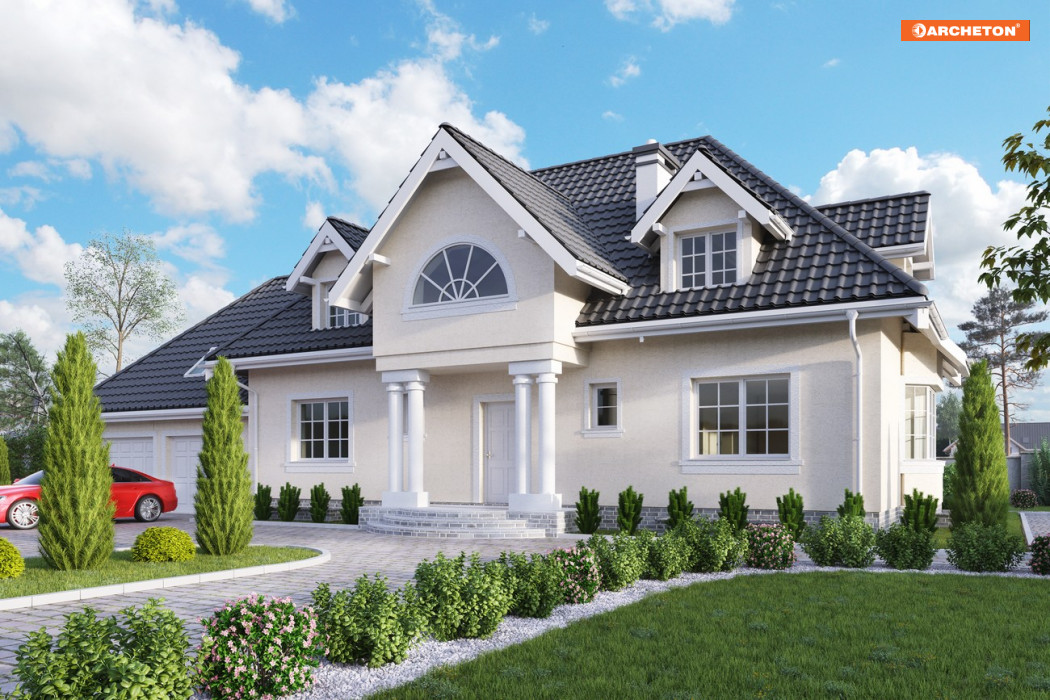 Obszerna sień prowadzi do holu otwartego przestrzennie na pokój dzienny z aneksem, kuchnię i jadalnię oraz półokrągłą klatkę schodową. Na parterze zlokalizowano również dodatkowy pokój, łazienkę i spiżarnię. Na poddaszu zaprojektowano 3 duże sypialnie oraz przestronną łazienkę. Kondygnacja podziemna, dostępna również dodatkowymi schodami z garażu, mieści kotłownię, 2 piwnice, łazienkę i pomieszczenie pomocnicze. Z dwustanowiskowego garażu dostać się można schodami na stryszek, który pełni funkcje gospodarcze i magazynowe.