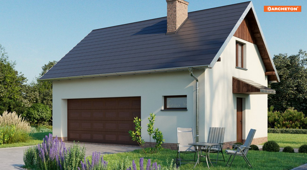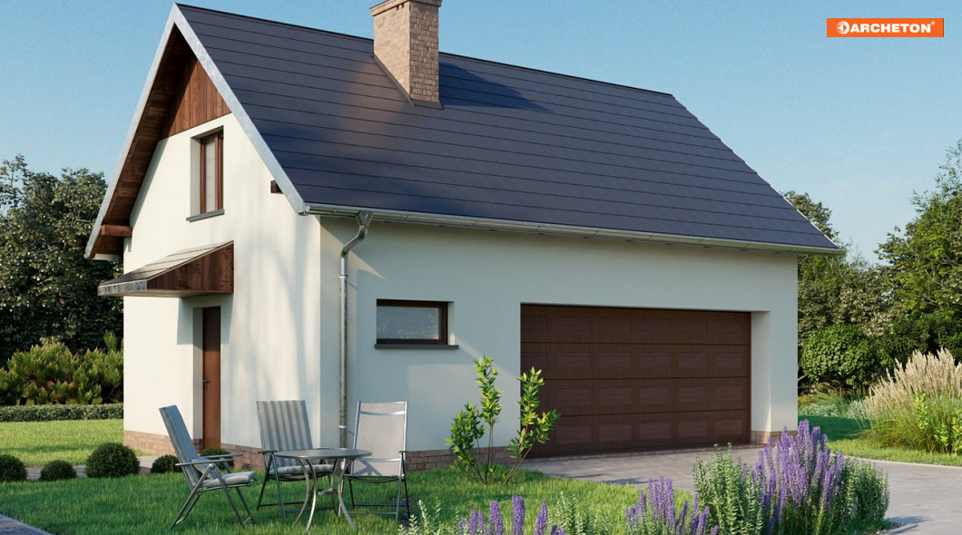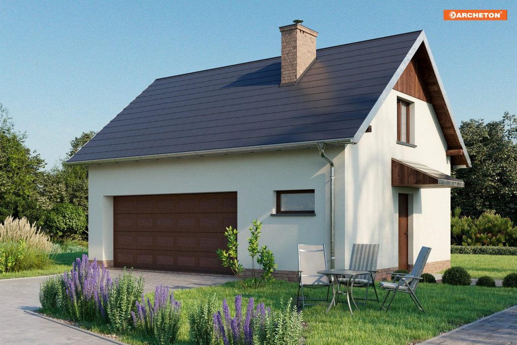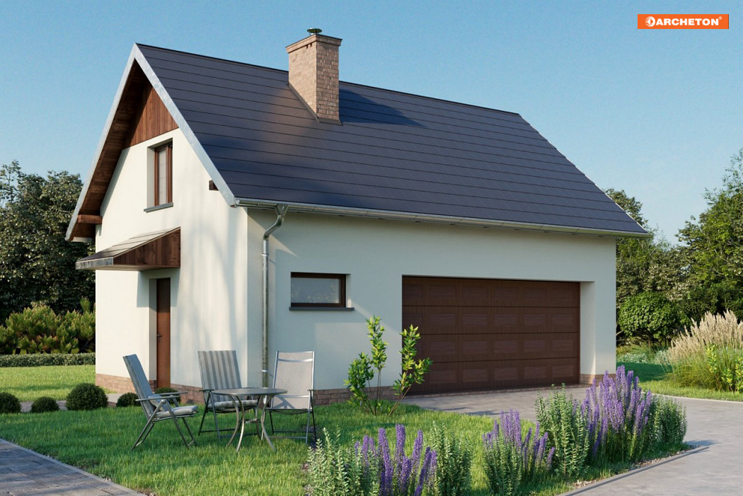 Garaż dwustanowiskowy z częścią gospodarczą. PARTER: łazienka, sień, schody na poddasze. PODDASZE: aneks kuchenny, pokój.