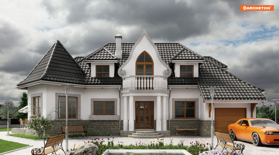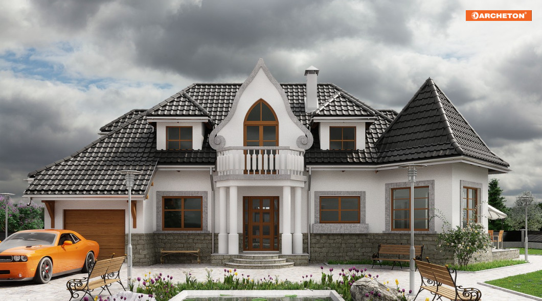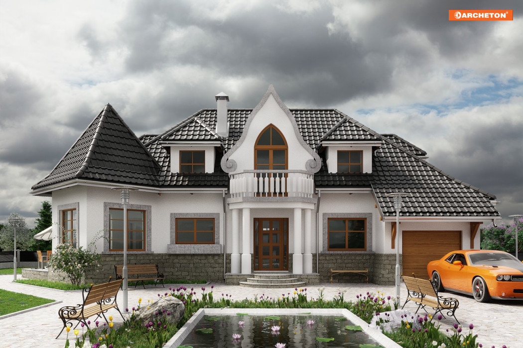 Budynek jest parterowy z użytkowym poddaszem, niepodpiwniczony. Na parterze znajdują się: sień, hol, łazienka, kotłownia, kuchnia, jadalnia, pokój dzienny, pokój gościnny i garaż. Na poddaszu znajdują się 3 sypialnie, łazienka, schowek i garderoba. Bryła budynku urozmaicona poprzez zestawiennie różnych form architektonicznych. Cechuje ją malowniczo zaakcentowane wejście, lukarny, ryzalit klatki schodowej oraz różnorodność form dachów. Kąt nachylenia połaci 45°, z odchyleniem do 31° i 38° oraz 60° - lukarna frontowa.