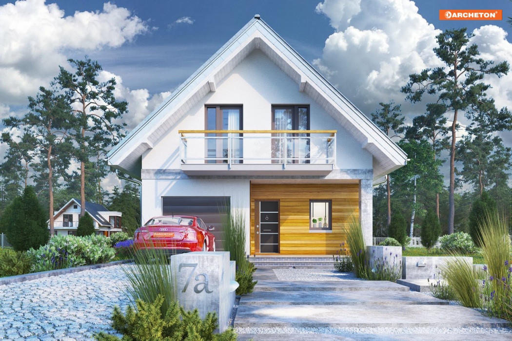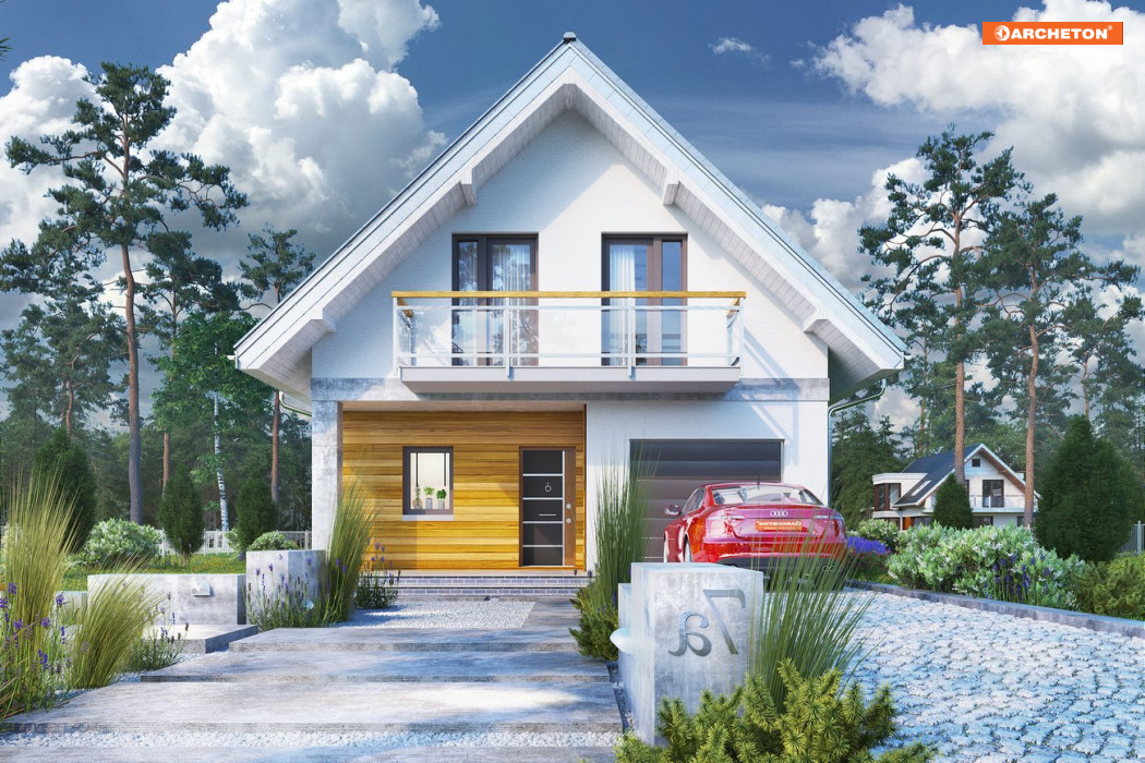 Dom ma prostą funkcję. Na parterze znajduje się salon, kuchnia, łazienka oraz garaż. Na poddaszu są 4 sypialnie, garderoba i łazienka. Projekt domu Lobelia dedykowano ekonomicznej realizacji niewielkiego domu z użytkowym poddaszem i z wbudowanym garażem na wąskiej działce. Jest to jedna z niewielu takich koncepcji z przedziału wielkości 100-120m2 p.u., w których budynek skierowany został szczytem dachu ku wjazdowi na działkę. Oprócz garażu połączonego przez sień z holem mieszkania, na parterze przewidziano dużą łazienkę z kotłem gazowym oraz, na wprost wejścia, otwarty pokój dzienny połączony z kuchnią. Salon z jadalnią są wyjątkowo dobrze oświetlone oknami z trzech stron świata. Miejsce pod dwuspadowym dachem pomieści cztery sypialnie, w tym główną - z garderobą, i kolejną łazienkę rozjaśnioną i powiększoną przez małą lukarnę. Poza nią, prostą, energooszczędną bryłę zaproponowaną w projekcie domu Lobelia urozmaicają płytkie podcienie tarasów: frontowego i ogrodowego. Ich wnęki wsparte zostały masywnymi słupami i osłonięte dodatkowo przed słońcem i opadami przez długie balkony otwierane z sypialni.