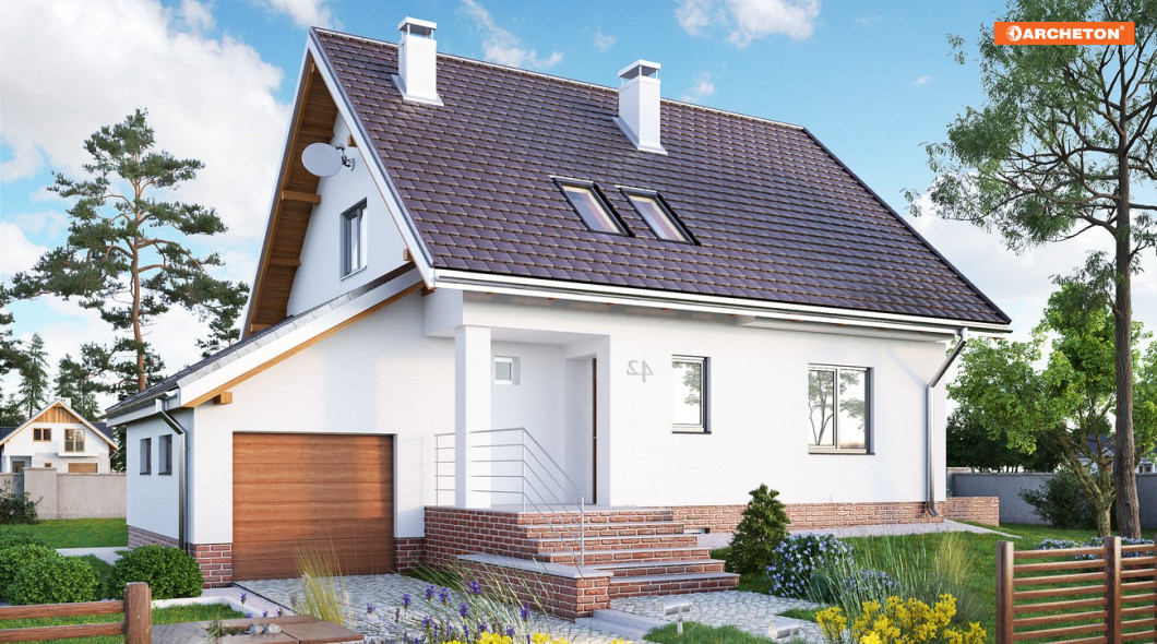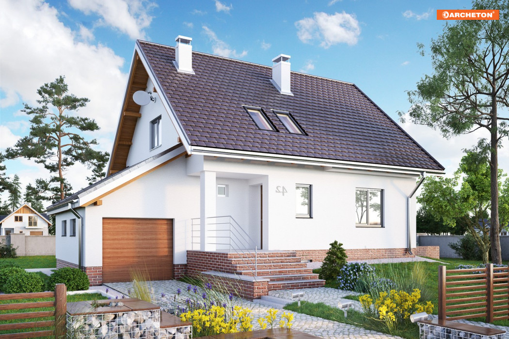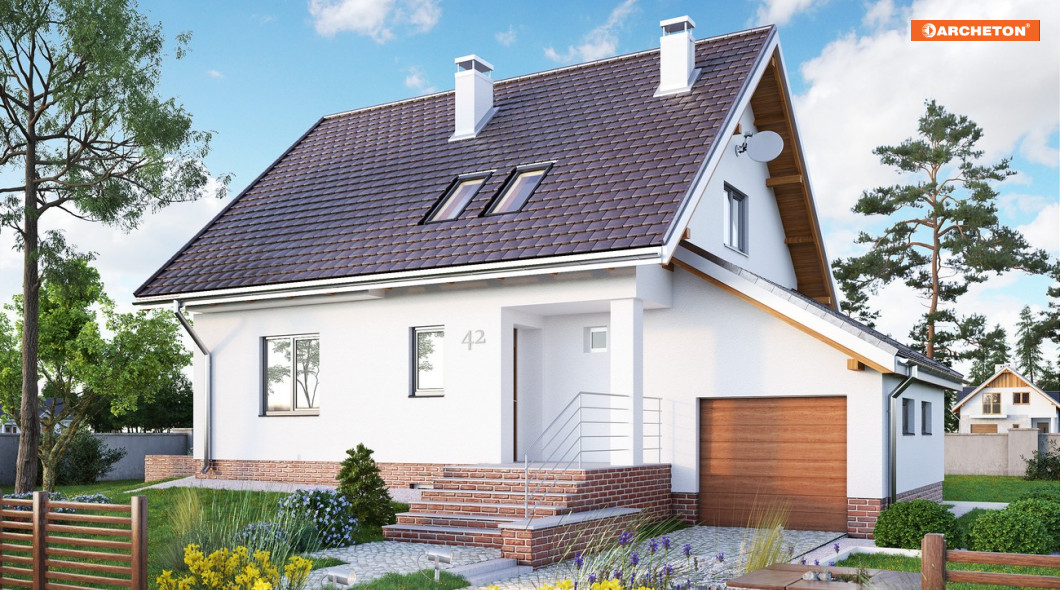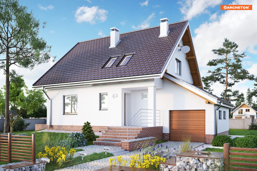 Budynek przeznaczony dla 4-5 osobowej rodziny. Na parterze znajdują się: pokój dzienny, kuchnia, hol, łazienka, sień oraz garaż dostępny z holu. Na poddaszu są 3 sypialnie oraz łazienka. Kotłownia z pralnią i pomieszczenie gospodarcze znajdują się w piwnicy. Budynek stosunkowo niewielki, na rzucie kwadratu z dostawionym prostokątem, przykryty dachem dwuspadowym o kącie nachylenia połaci 42°. Garaż przykryty niezależnym dachem jednospadowym o kącie nachylenia 30°.