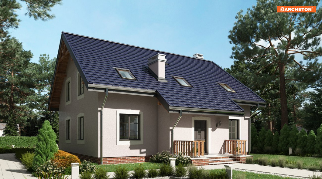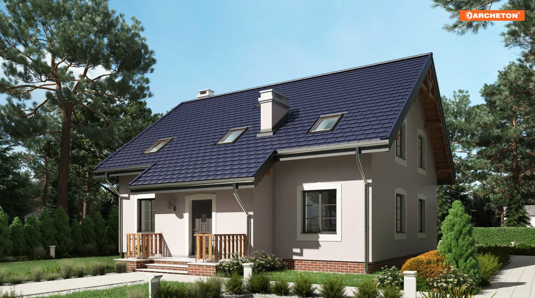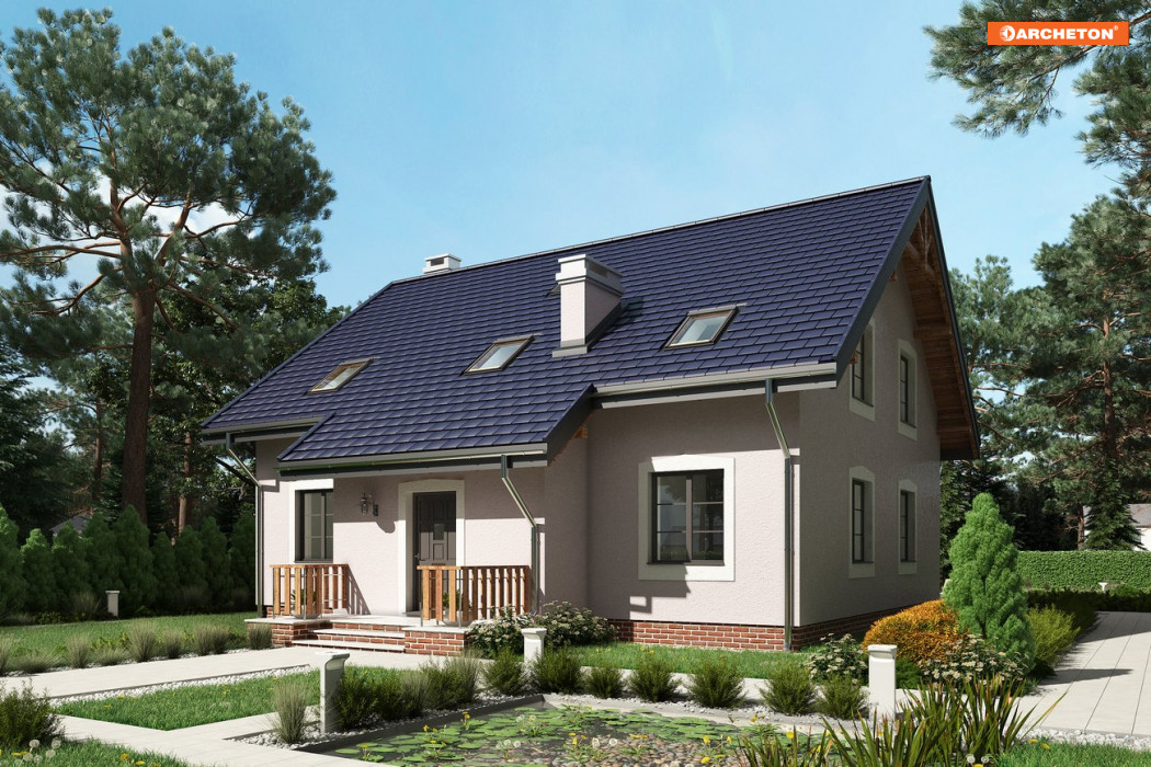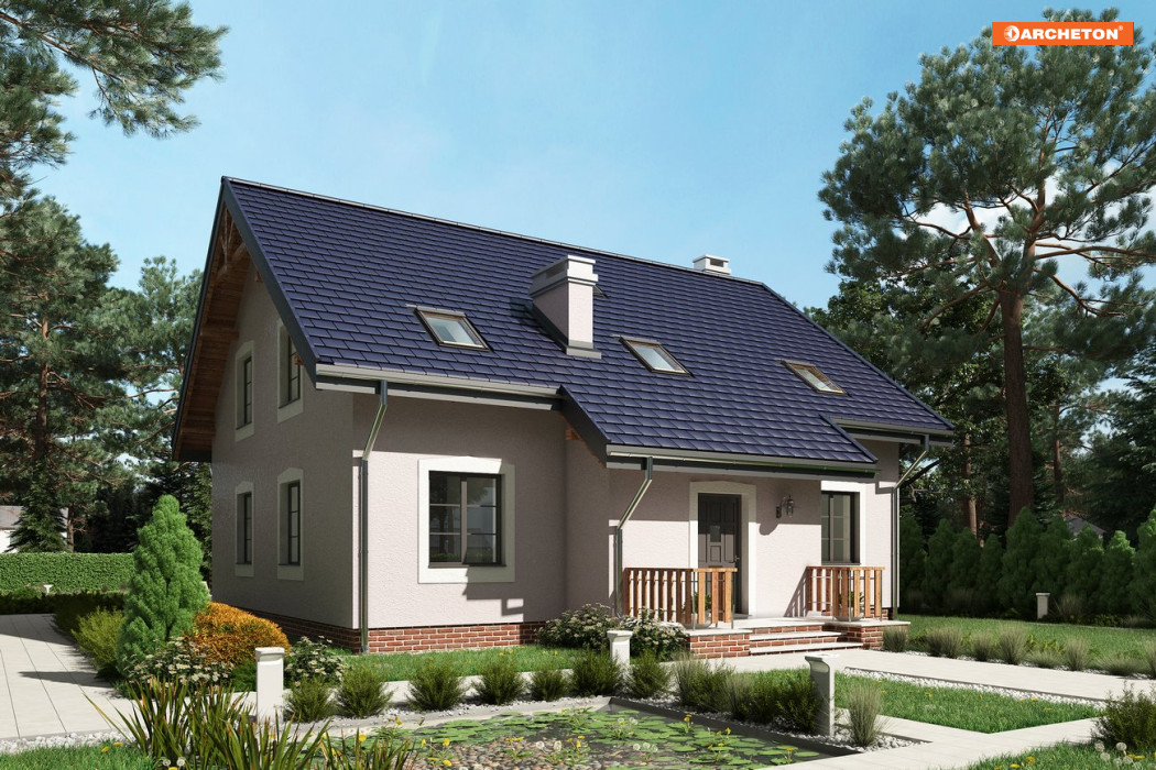 Dom jednorodzinny, przeznaczony dla rodziny wielopokoleniowej liczącej 5-8 osób. W części budynku wydzielonej na parterze, do której wchodzimy przez sień i hol - mieści się pokój dzienny, kuchnia z jadalnią, 2 pokoje sypialne oraz łazienka. Z holu możemy zejść schodami w dół, do części gospodarczej z pralnią/kotłownią, umieszczonej w piwnicy budynku. Z sieni schodami, wychodzimy na poddasze. W tej części domu zaprojektowano 3 pokoje, łazienkę oraz kuchnię/jadalnię, w której można urządzić dodatkowy pokój. Projekt domu jednorodzinnego Marcepan wydziela dwa samodzielne przestrzennie mieszkania. Prosta bryła na rzucie zbliżonym do kwadratu przekryta jest ekonomicznym dwuspadowym dachem bez lukarn. Jedno wejście umieszczono w wysuniętej ku frontowi sieni z gankiem pod obniżonym okapem. Kuchnia, pokój dzienny i dwie sypialnie z łazienkami w odmiennych układach i rozmiarach rozlokowano zarówno na parterze jak i na użytkowym poddaszu. Ze wspólnej klatki schodowej dostępna jest niewielkie podpiwniczenie pod frontową częścią budynku z kotłownią i pomieszczeniem gospodarczym. Mieszkania w projekcie domu Marcepan różnią się nie tylko powierzchnią, konfiguracją pomieszczeń i charakterem wnętrz (skosy dachu na drugiej kondygnacji). Pokój dzienny na parterze jest wyraźnie obszerniejszy i ma wyjście do ogrodu przez zadaszony taras. Taki układ sprzyja potrzebom dwupokoleniowej rodziny jak również umożliwia aranżację jednego, dwupoziomowego mieszkania z sześcioma sypialniami.