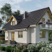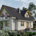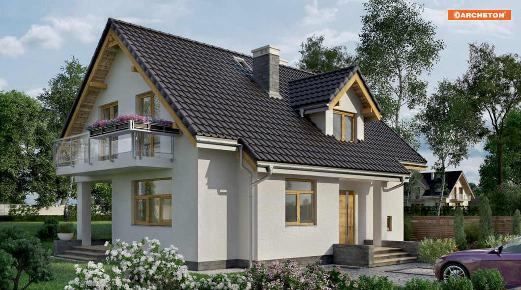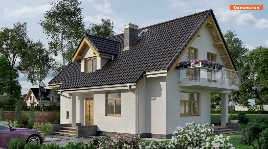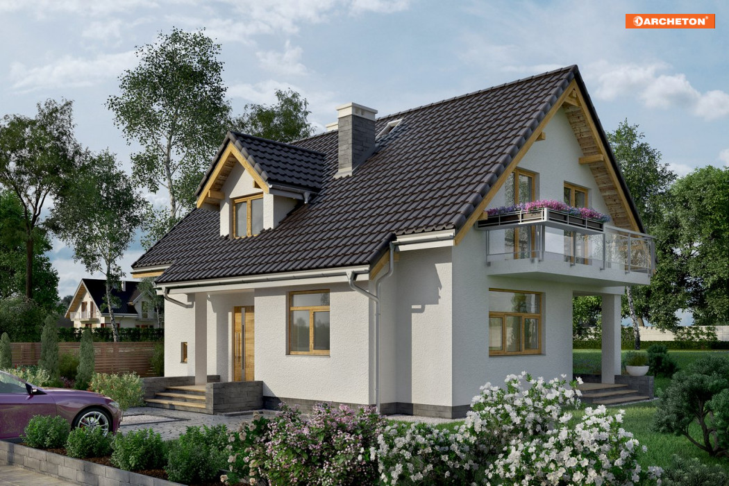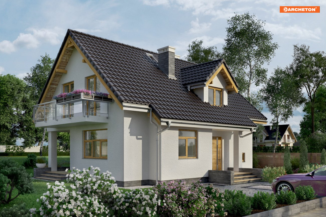 Na parterze zaprojektowano centralnie zlokalizowany hol dostępny z sieni. Z holu dostępny jest pokój dzienny otwarty przestrzennie na jadalnię, kuchnia, w.c. i kotłownia. Pod schodami prowadzącymi na poddasze mieści się niewielki schowek. Na poddaszu zaprojektowano 3 pokoje sypialne, garderobę i dużą łazienkę. Bryłę budynku stanowi prostopadłościan rozbudowany przez wysunięcie pokoju dziennego i podcień wejściowy. Całość nakryta została dachem dwuspadowym o kącie nachylenia połaci 45°. Budynek posiada podcień wyjścia na taras. Prosta bryła domu wzbogacona została balkonem i dwoma lukarnami.