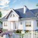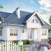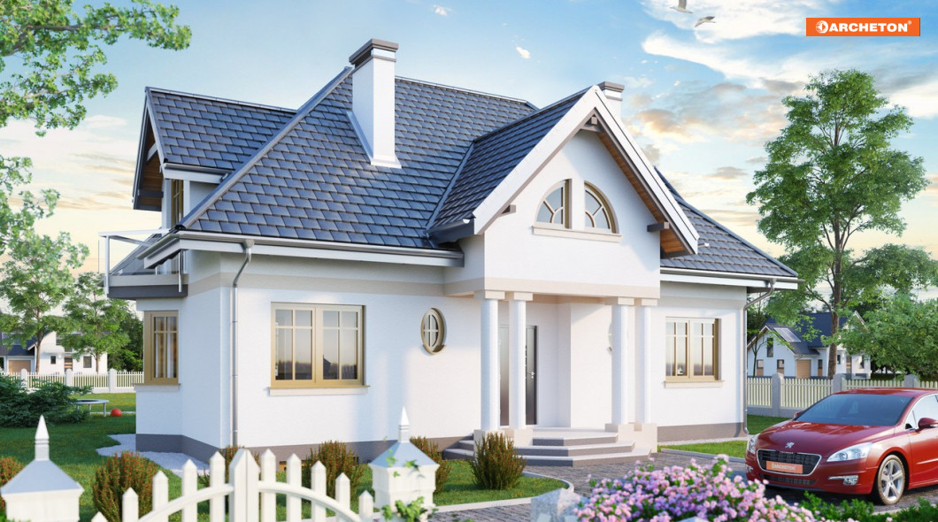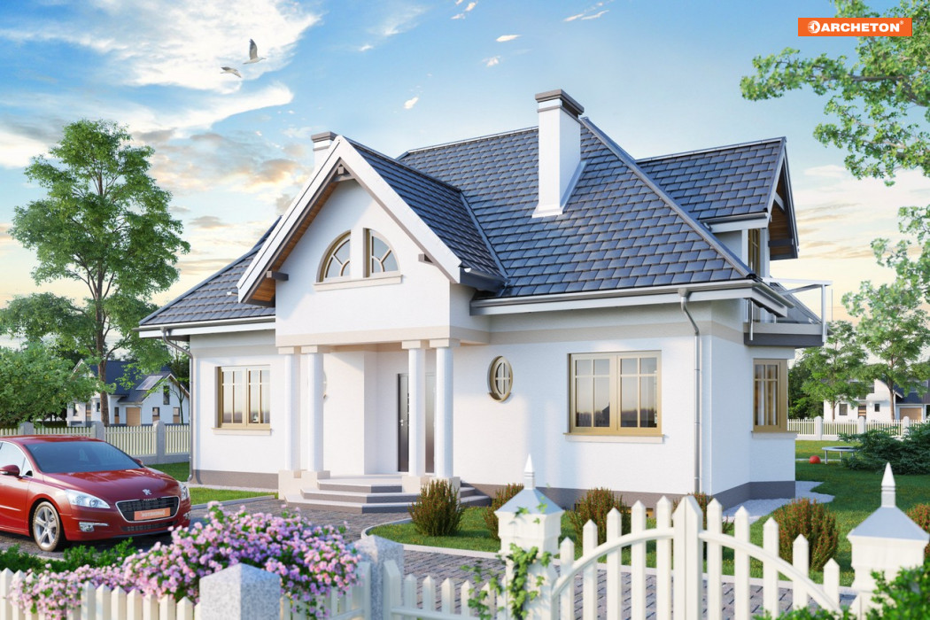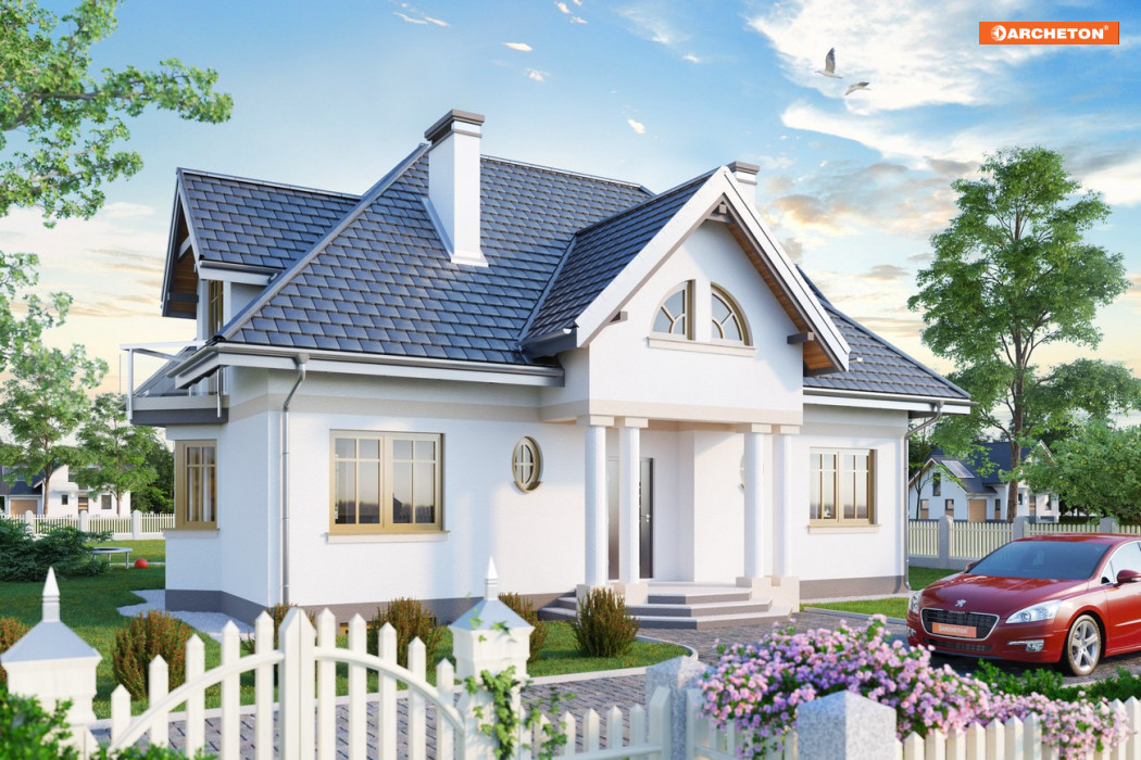 Częściowe podpiwniczenie mieści 2 pomieszczenia gospodarcze oraz kotłownię. Na parterze zlokalizowano: pokój dzienny z aneksem, pokój i kuchnię z dużą jadalnią otwartą przestrzennie na pokój dzienny. Obszerny hol łączy sień, łazienkę i spiżarnię z częścią dzienną. Otwarta klatka schodowa ze schodami wachlarzowymi prowadzi na poddasze mieszczące 3 sypialnie, łazienkę, garderobę i w.c. Bryłę budynku stanowi prostopadłościan na rozbudowanym rzucie z mocnymi akcentami w postaci podcienia wejściowego, wykuszy oraz małych i dużych lukarn. Całość nakryto dachem wielospadowym o kącie nachylenia połaci 45°.