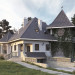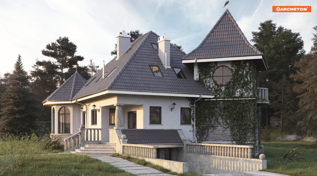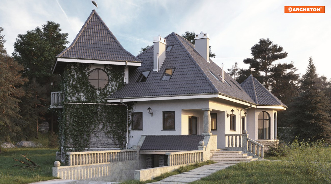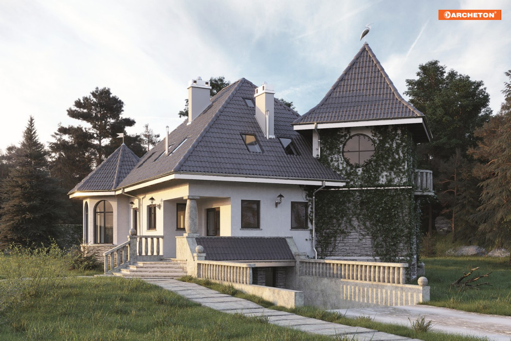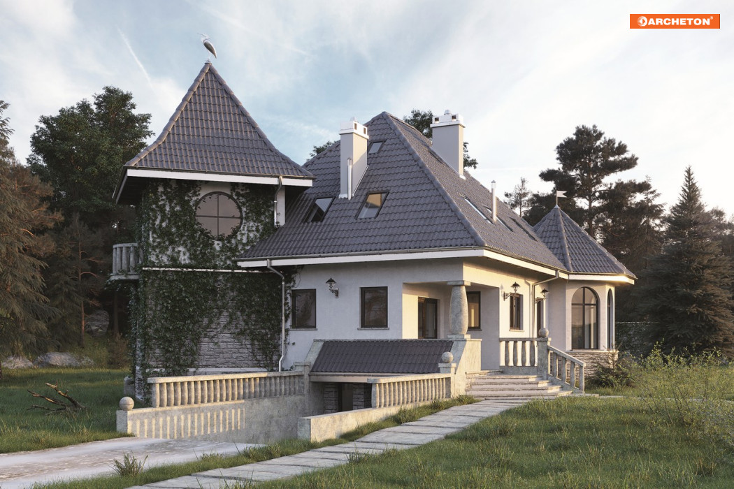 Wejście do budynku z podcienia. Na parterze zlokalizowano: pokój dzienny, kuchnię, pokój, łazienkę oraz hol, wymkniętą klatkę schodową do piwnicy, sień oraz otwarte schody na poddasze. Na poddaszu są 3 pokoje, łazienka, garderoba i przedpokój. Budynek posiada podpiwniczenie, w którym umieszczono pom. hobby, spiżarkę, pom. gospodarcze z w.c., korytarz oraz garaż. Malowniczy dom o zróżnicowanym dachu, z podcieniem wejściowym i ogrodowym. Oryginalności dodają mu wieża i alkierz oraz charakterystyczne grube kamienne kolumny.